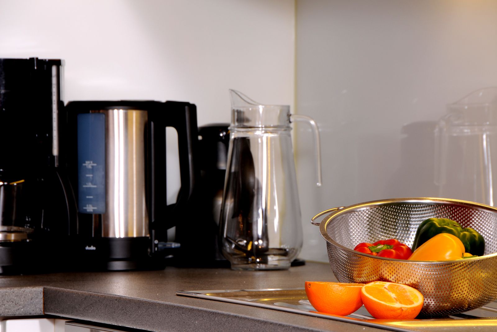 - Küche: E-Herd, Backofen, Mikrowelle, Geschirrspüler, Kaffeemaschine und Kühlschrank mit Gefrierfach