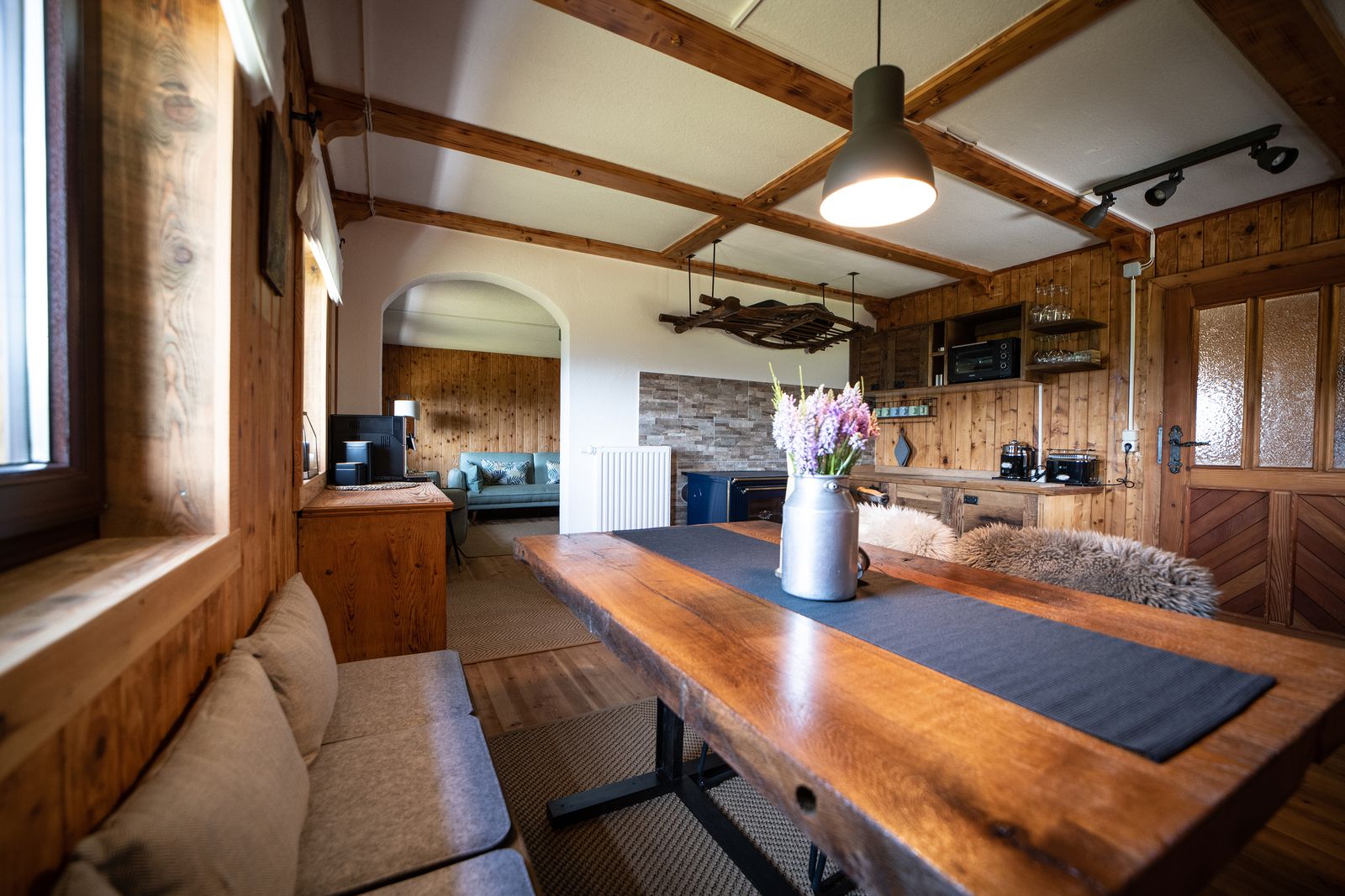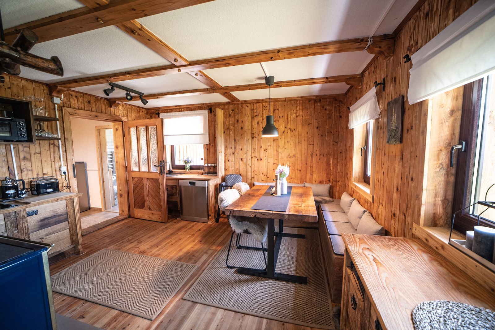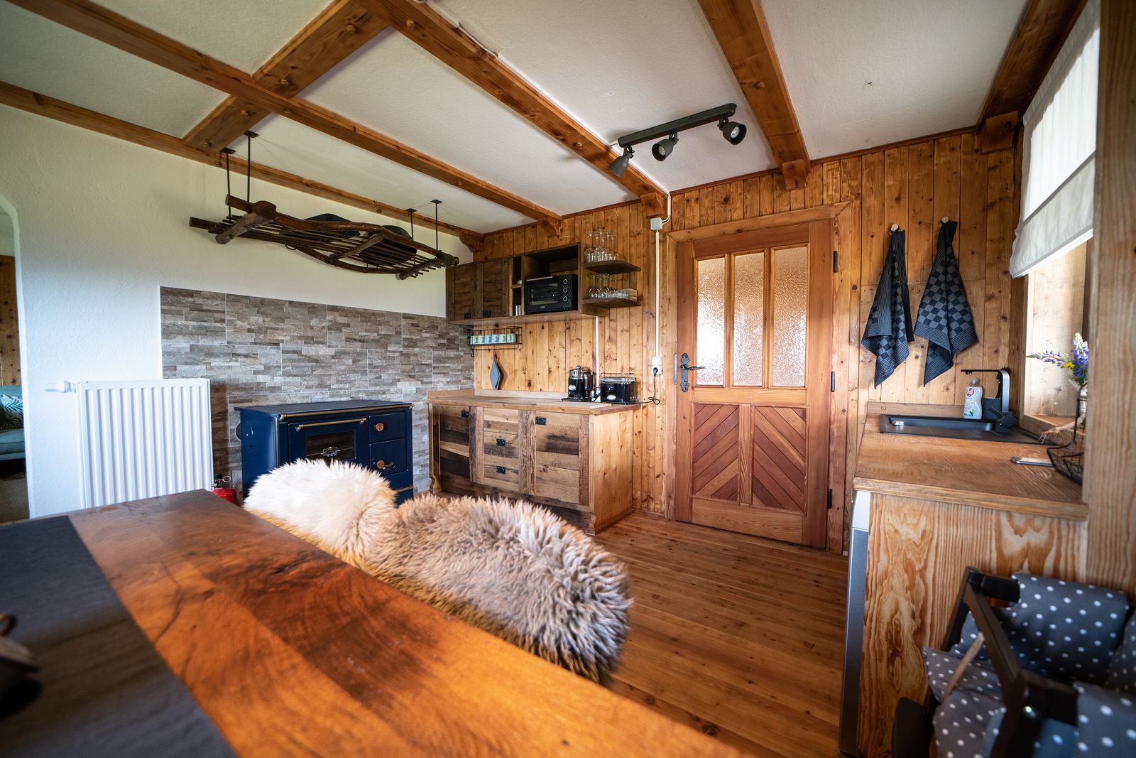 - Küche: Holzofenherd und Ceranfeld, elektrischer Minibackofen, Wasserkocher, Kaffeevollautomat, Toaster, Geschirrspüler, Kühlschrank und Gefrierschrank