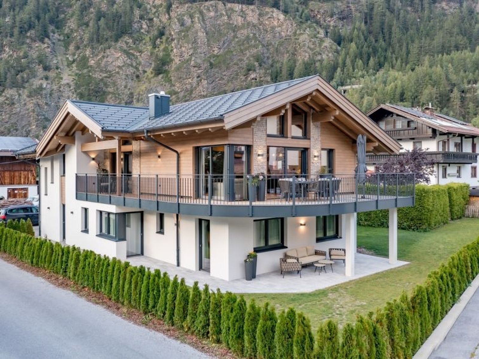 Längenfeld: Urlaubsglück mit Bergblick: Echtes Ötztaler Lebensgefühl trifft auf modernsten Wohnkomfort im alpinen Chalet-Stil! Der Besitzer bietet einen Einkaufsservice vor der Anreise an. Modernes, komfortables Zweifamilienhaus "Alpenchalet Tirol", auf 2 Stockwerken. Im Ort, sonnige Lage, 10 km vom See, 11 km vom Skigebiet. Zur Alleinbenutzung: Grundstück, grosser Garten 70 m2. Sitzplatz, Terrasse. Im Hause: Skiraum, Zentralheizung, Skischuhtrockner. Brötchenservice. Einkaufsservice vor Anreise möglich. Parkplatz beim Haus. Einkaufsgeschäft 500 m, Lebensmittelgeschäft, Restaurant, Bushaltestelle 100 m, Thermalbad "Aqua Dome" 900 m, Badesee 10 km. Tennis 1.5 km, Reitstall 1.5 km, Skisportanlagen 11 km, Skibushaltestelle 100 m, Skischule 300 m, Langlaufloipe 200 m, Eisfeld 300 m. Nahe gelegene Sehenswürdigkeiten: Outdoor Park Area 47 26 km. Bitte beachten: Gratis Skibus.