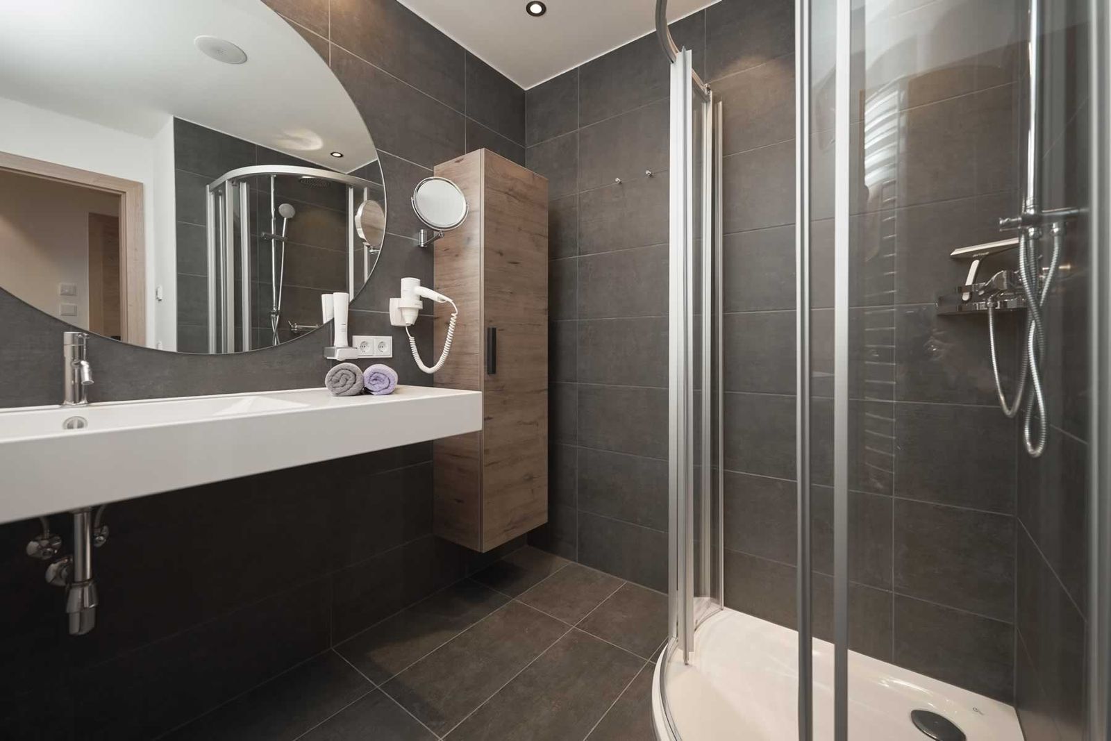 - 1 Badezimmer mit Regendusche und WC, Kosmetikspiegel und Föhn