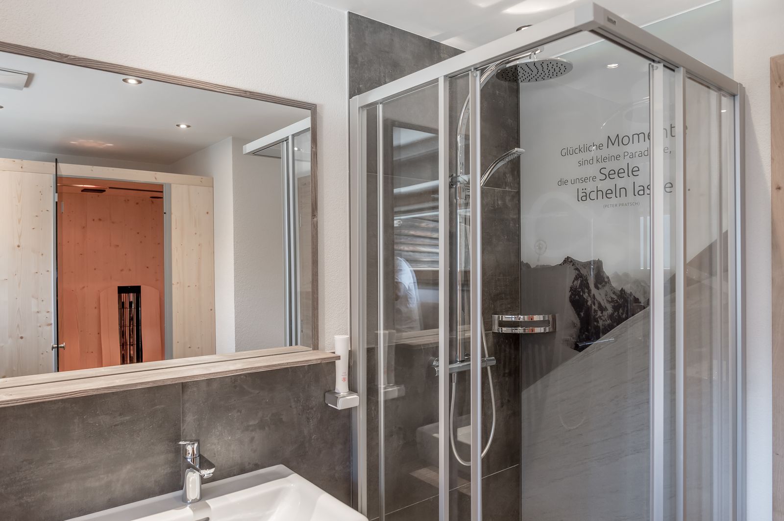 - Badezimmer mit Regendusche, WC, Kosmetikspiegel und Föhn