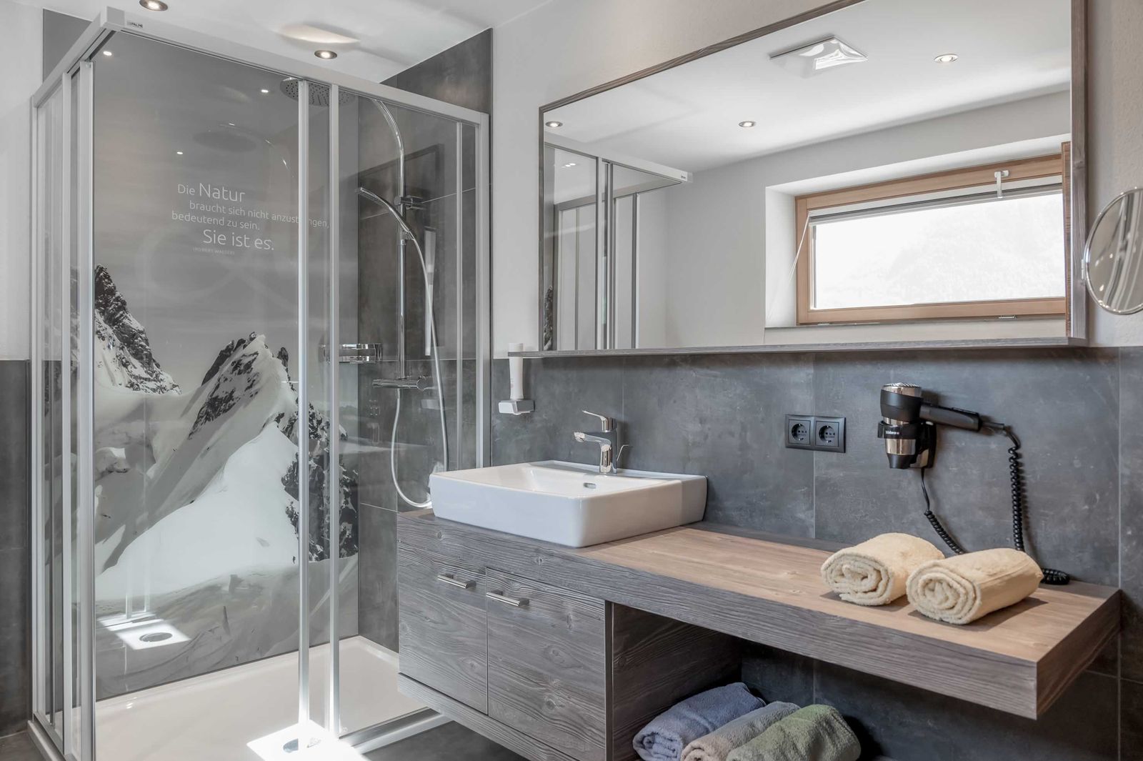 - 2 Badezimmer mit Regendusche, WC, Kosmetikspiegel und Föhn