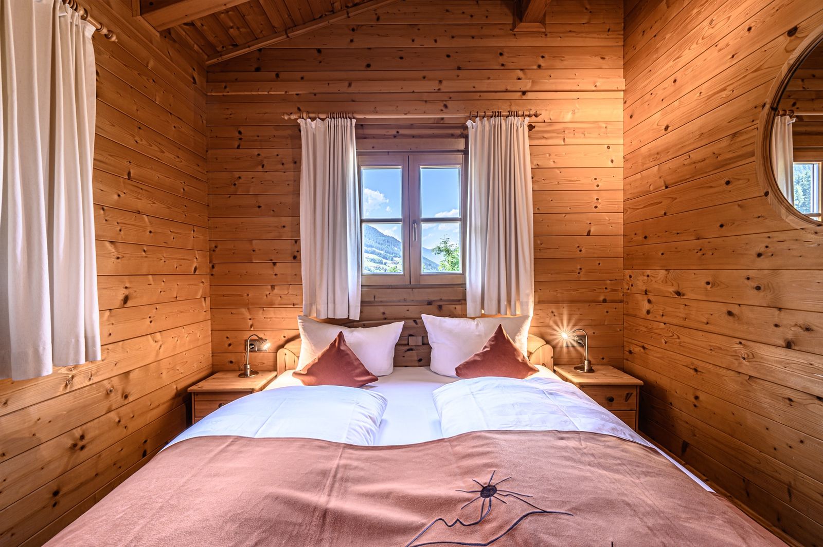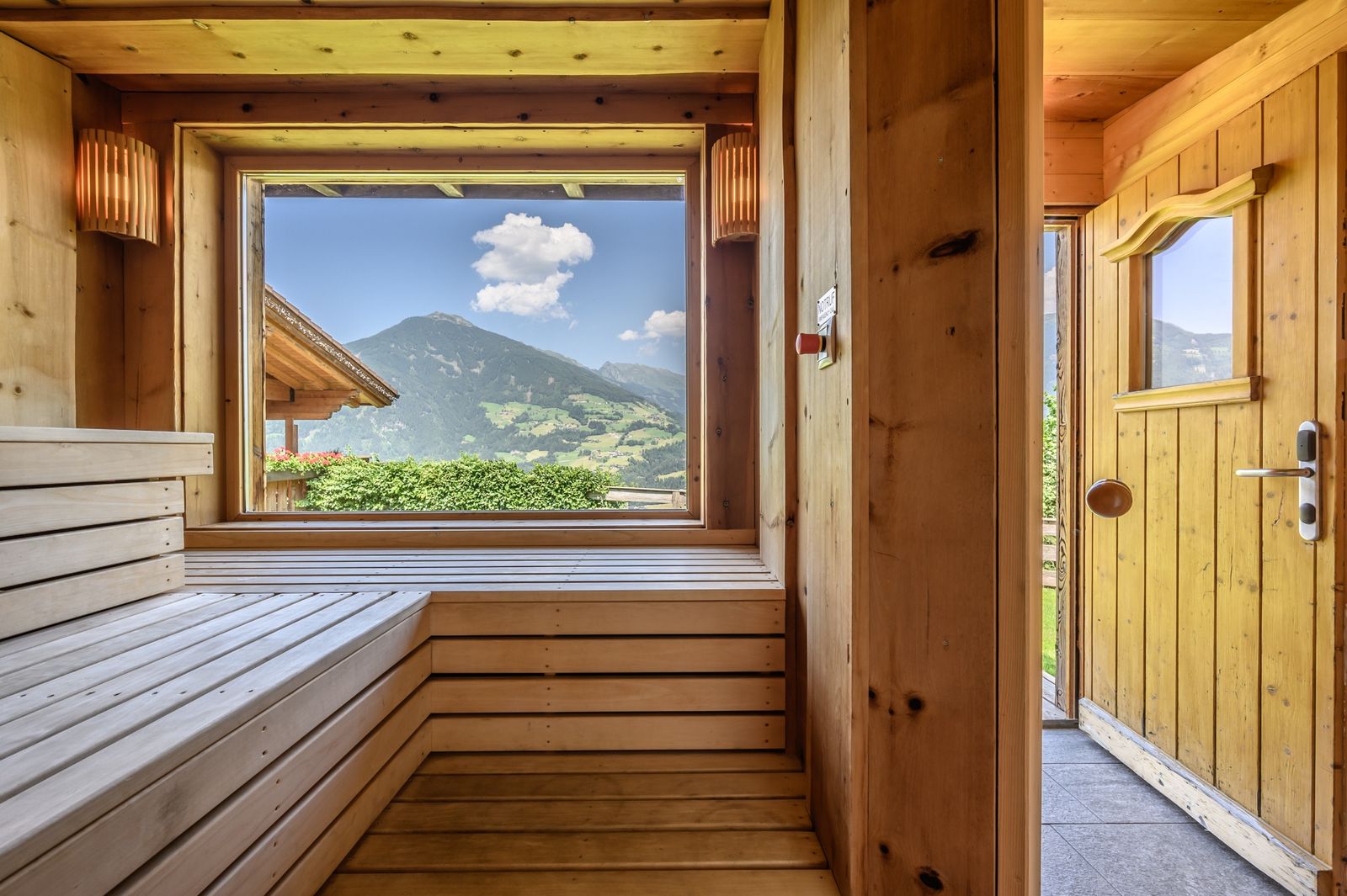 - Sauna-Hütte in duftendem Zirbenholz, im Garten mit Panoramablick übers Zillertal