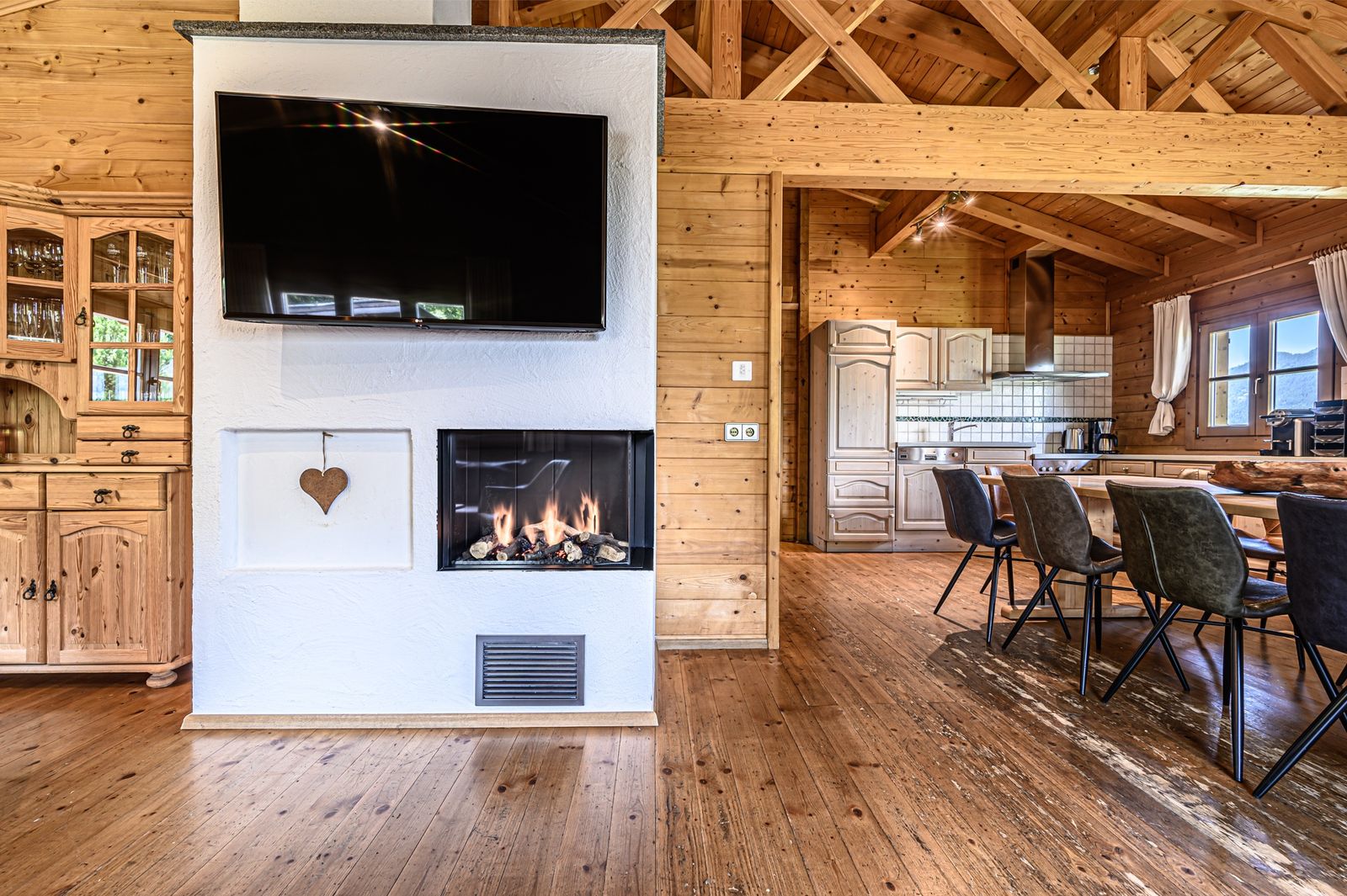 - großzügiger Wohn- Essbereich mit Couch, Kaminfeuer und großem Flat Screen TV