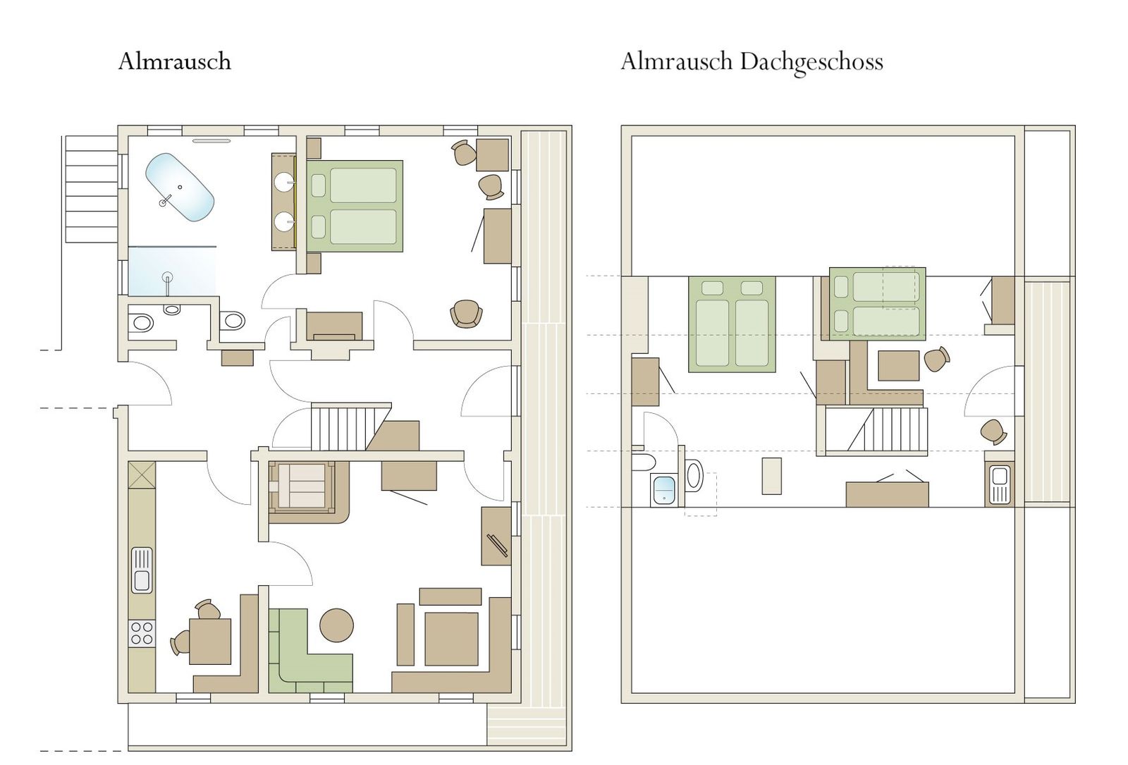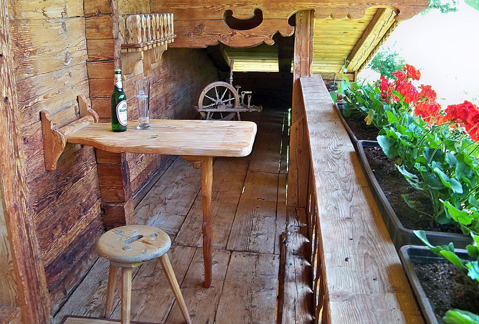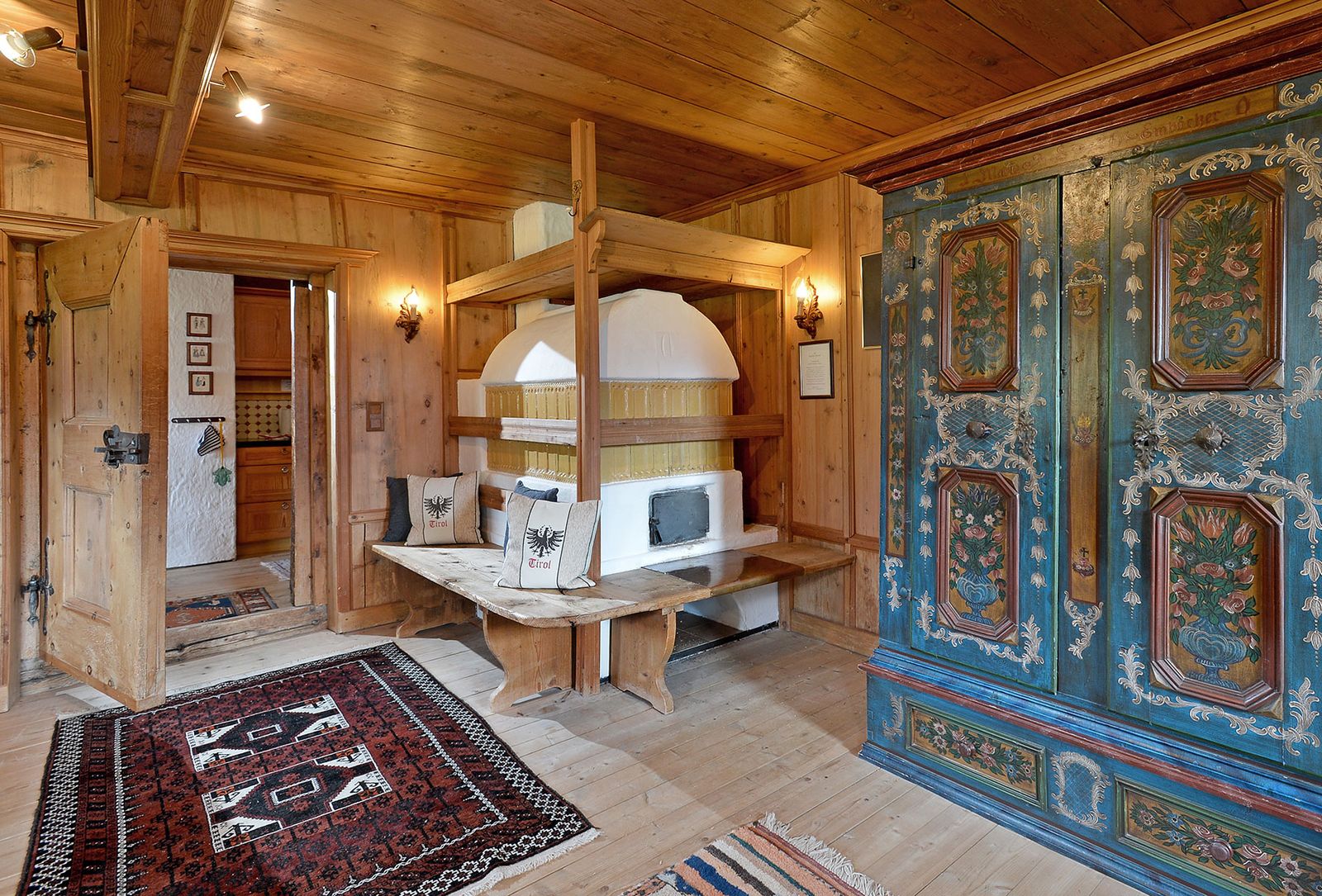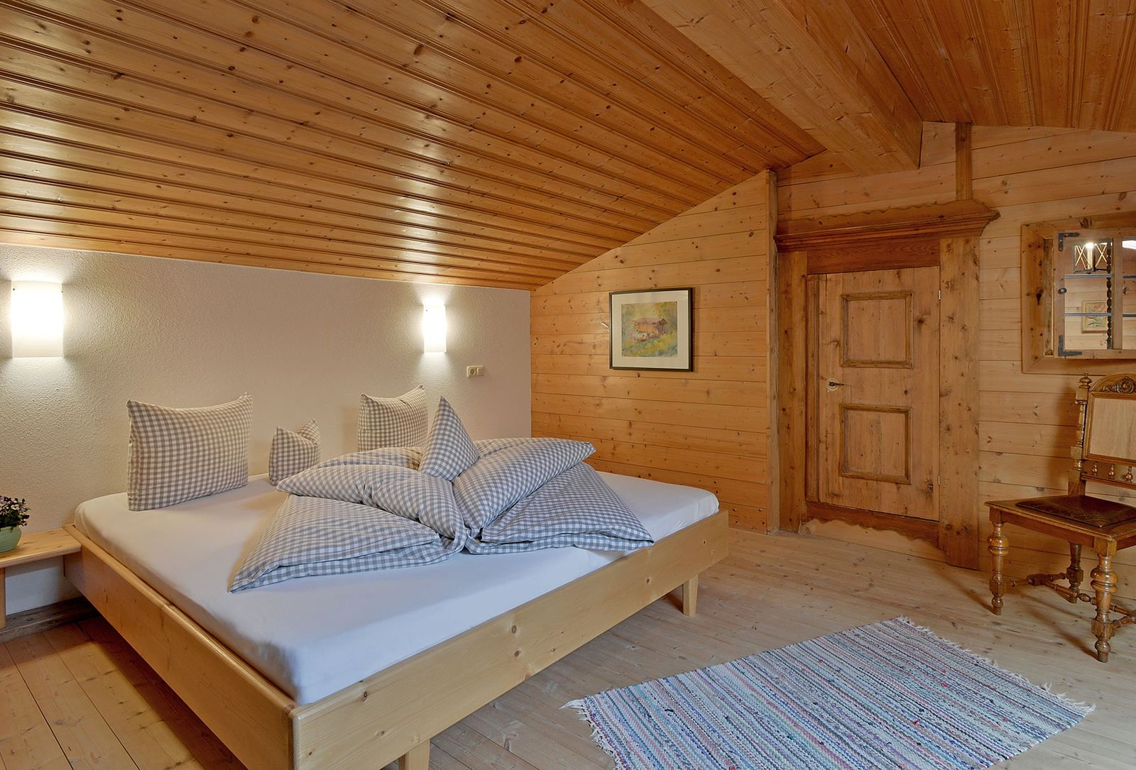 Die geräumige ca. 100 m² große Wohneinheit liegt im ersten Stock des Hauses und erstreckt sich über zwei Etagen. Der untere Bereich verfügt über eine gemütliche Bauernstube mit Tisch und Eckbank, Kachelofen und komfortablem Diwan. In der voll ausgestatteten Küche gibt es einen eigenen Essplatz. Das Schlafzimmer mit Doppelbett ist mit original Zirbenholz eingerichtet. Das große exquisite Badezimmer mit Regendusche und freistehender Badewanne ist zentral begehbar. Im oberen Bereich, der über eine innenliegende Holztreppe erreichbar ist, befindet sich eine behagliche Dachwohnung mit zwei Doppelbetten sowie ein kleines Bad mit WC. Selbst Haustiere dürfen sich hier wohlfühlen.
