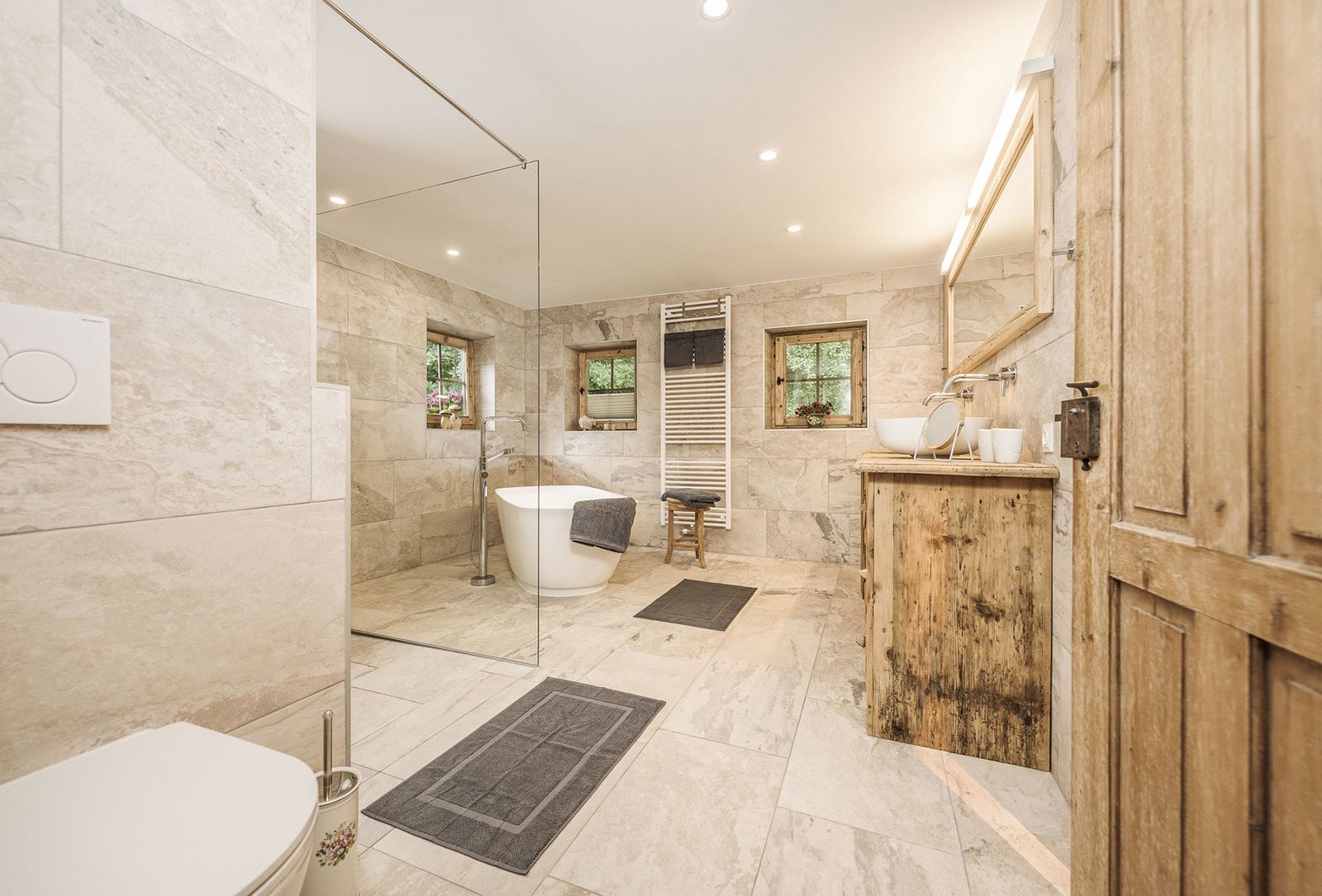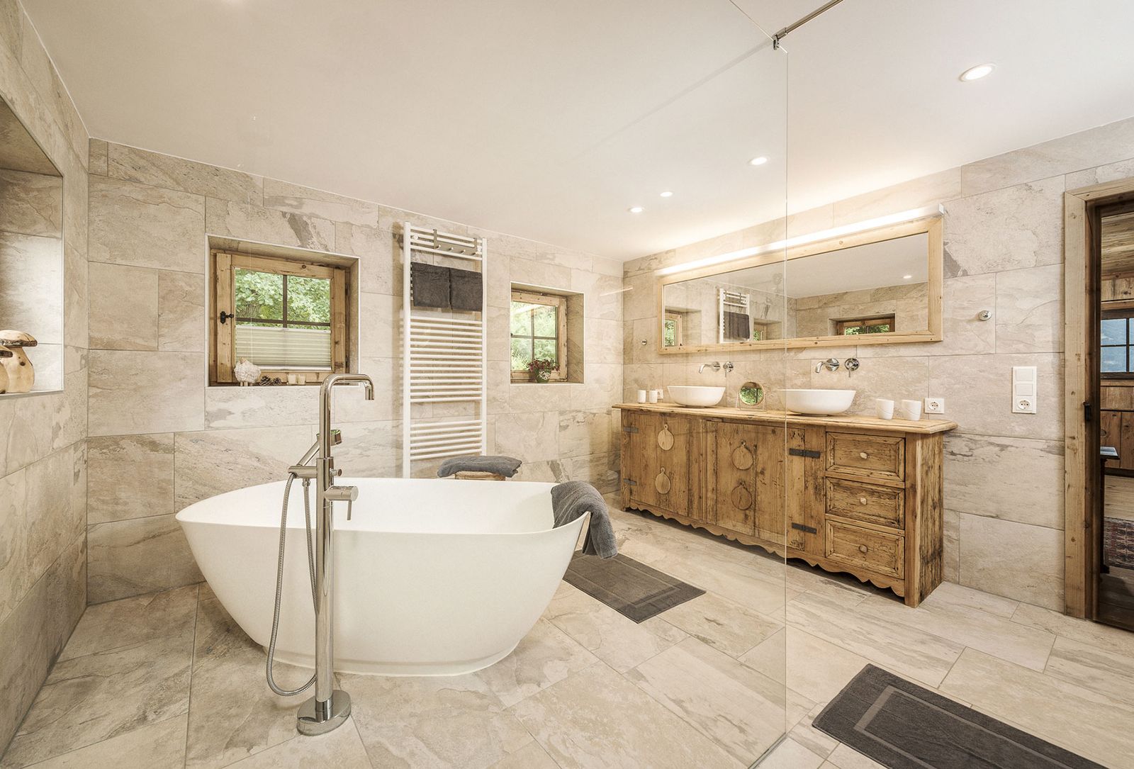 - Badezimmer (neu renoviert) mit freistehender Badewanne, Regendusche, Doppel-Waschbecken, WC und Haartrockner