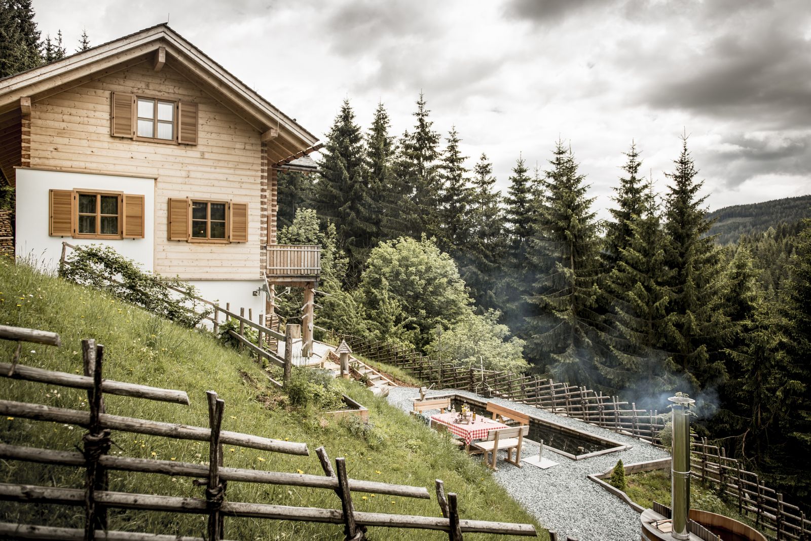 Wer Ruhe und Entspannung sucht, für den ist das Bergchalet Kuhgraben eine wahre Rückzugsoase. Auf einer Lichtung in idyllischer Alleinlage, umringt von Wäldern der Saualpe, ist das ehemalige Bauernhaus etwa 10 km von der Stadt Bad St. Leonhard entfernt. Modern und nachhaltig erbaut, strahlt das Chalet behagliche Wärme aus, da viel mit Vollholz und anderen Naturmaterialien gearbeitet wurde. Der exklusive SPA Bereich im Untergeschoss unter dem Motto: "Saunieren der feinsten Sorte" bietet Entspannung und Ruhe pur. Im angrenzenden charmanten Weinstüberl kann man den Urlaubstag angenehm ausklingen lassen, oder man geht von hier auf die großzügige Terrasse, wo der Hot Pot zu einem Bad unterm freien Himmel einlädt.