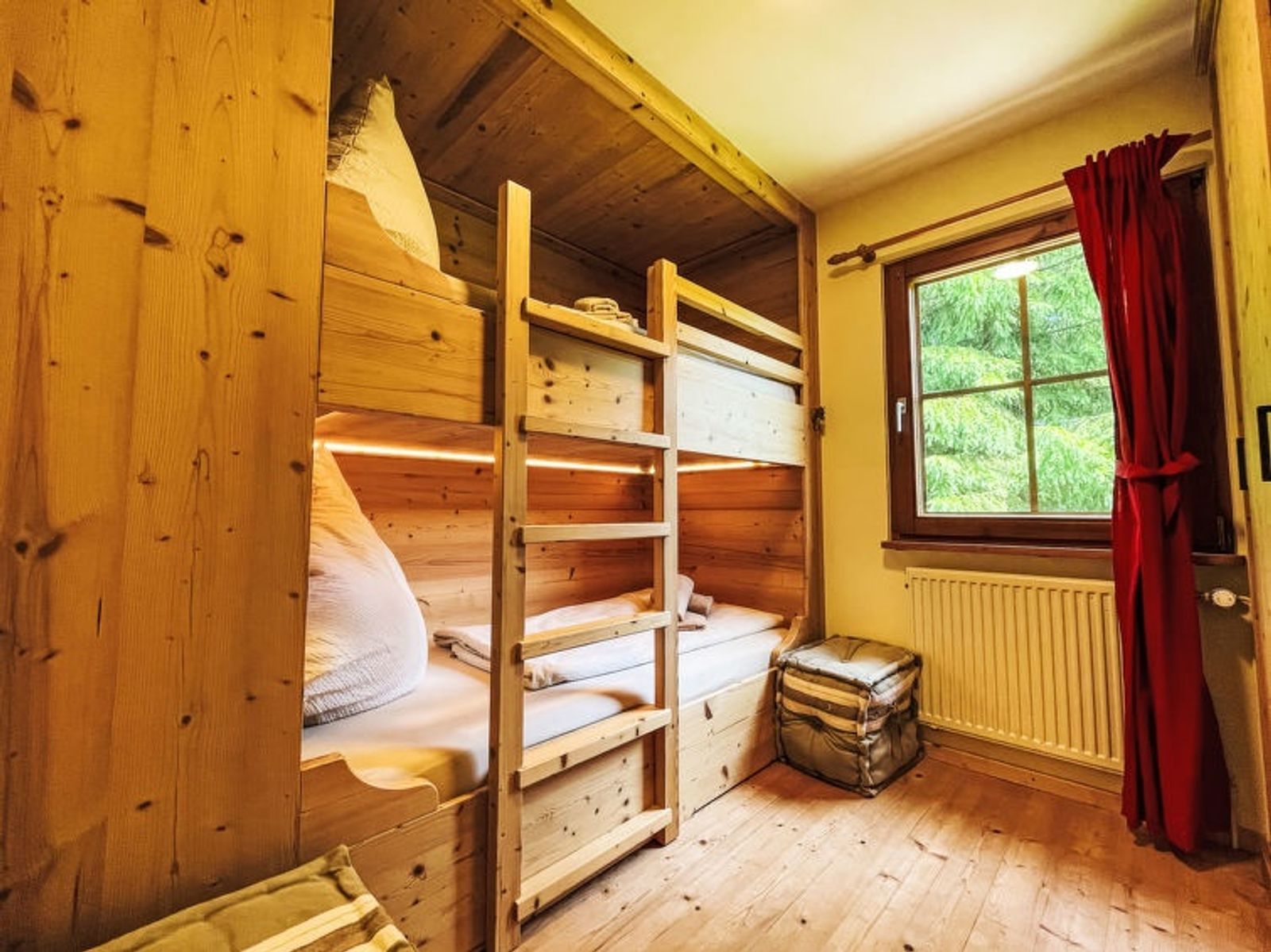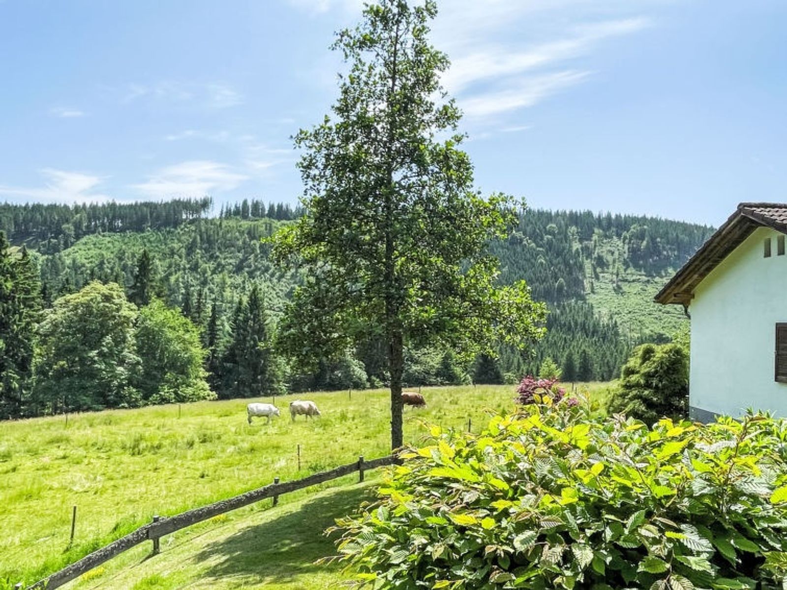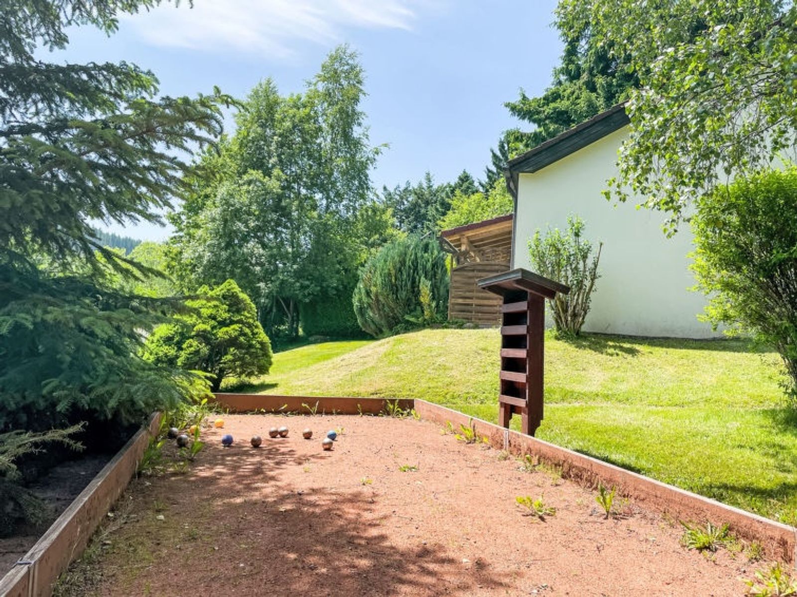 4-Zimmer-Haus auf 2 Stockwerken. Gemütlich und mit viel Holz eingerichtet: Wohn-/Esszimmer mit Schwedenofen, Essecke und Sat-TV (Flachbildschirm). Ausgang zur Terrasse. 1 Zimmer mit 1 Doppelbett (2 x 90 cm, Länge 200 cm). 1 Zimmer mit 1 x 2 Etagenbetten (90 cm, Länge 200 cm). Kleine Küche (Backofen, Geschirrspüler, 4 Glaskeramikplatten, Wasserkocher, elektrische Kaffeemaschine). Dusche/WC. Heizung. Unteres Geschoss: (Aussentreppe) 1 Zimmer mit 1 franz. Bett (140 cm, Länge 200 cm), Dusche/WC und Sat-TV (Flachbildschirm). Ausgang zum Garten. Sauna. Heizung. 2 Terrassen. Terrassenmöbel, Gartengrill (mobil). Schöne Sicht auf die Landschaft und den Wald. Zur Verfügung: Sauna, Kinderhochstuhl, Haartrockner. Internet (WLAN, gratis). Garage in 50 m. Bitte beachten: Nichtraucher-Haus. Rauchmelder. Keine interne Verbindung zwischen den Etagen. Bitte beachten: Vom Wohnzimmer aus führt eine steile Treppe zu einer Spielgalerie.