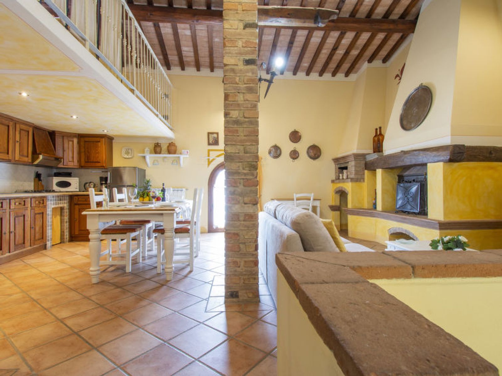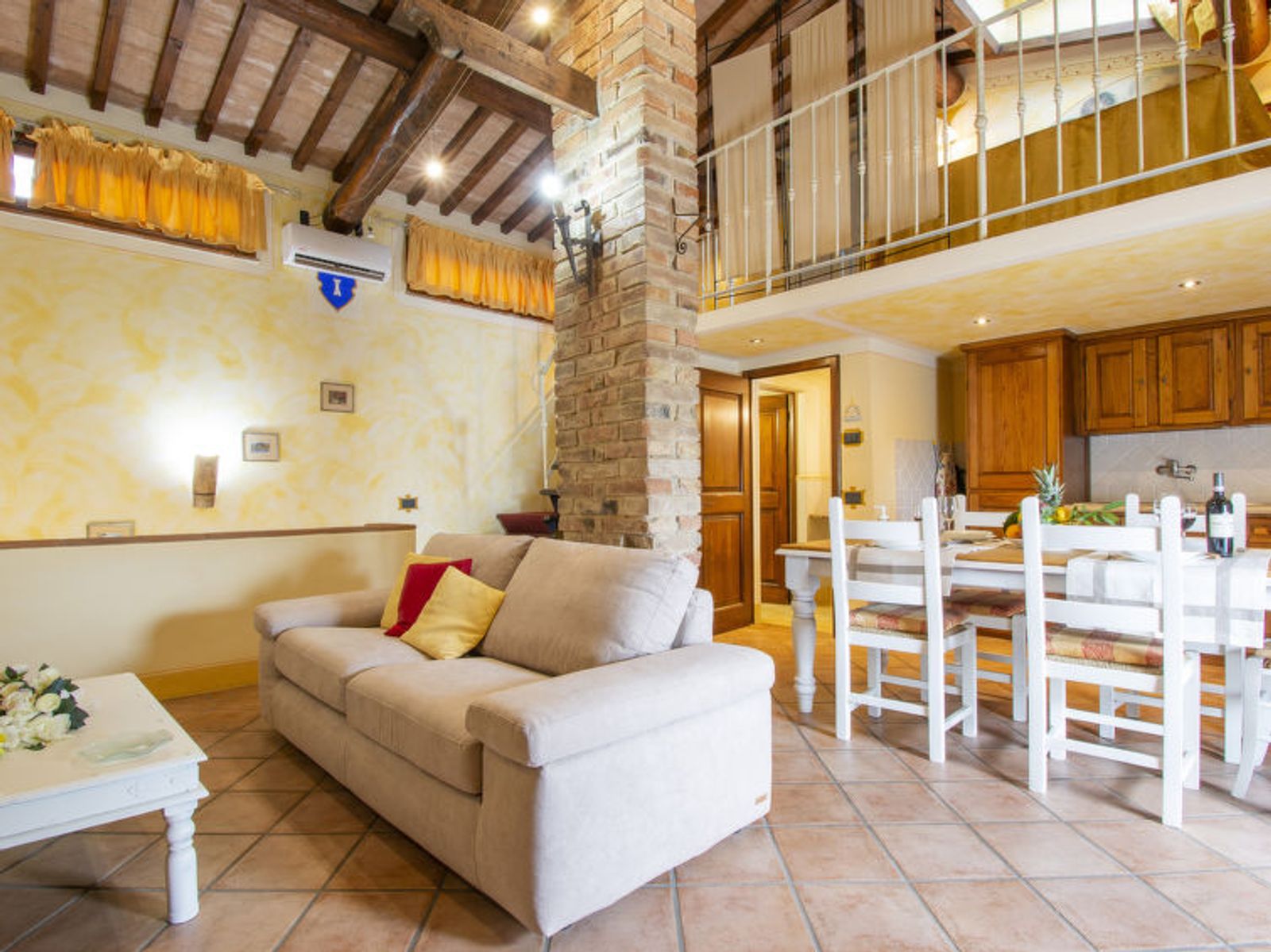 4-Zimmer-Landhaus 110 m2 auf 3 Stockwerken, im Erdgeschoss. Komfortabel und schön eingerichtet: Eingang. 2 Doppelzimmer. Ausgang zur Terrasse. Dusche/WC. Obergeschoss: grosses Wohn-/Esszimmer mit 1 Doppeldiwanbett, offenem Kamin, Sat-TV und DVD. Offene Küche (4 Kochplatten, Geschirrspüler, Mikrowelle, elektrische Kaffeemaschine). Dusche/WC. 2. Obergeschoss: offene Galerie abgeschrägtes mit 1 Doppelbett. Grosse Terrasse. Terrassenmöbel, Gartengrill. Herrliche Panoramasicht auf die Landschaft. Zur Verfügung: Safe, Bügeleisen, Kinderhochstuhl. Internet (Wireless LAN, gratis). Schrank. Das Doppeldiwanbett im Wohnzimmer ist als Zusatzbett buchbar. IT048010B46RJCHJEI