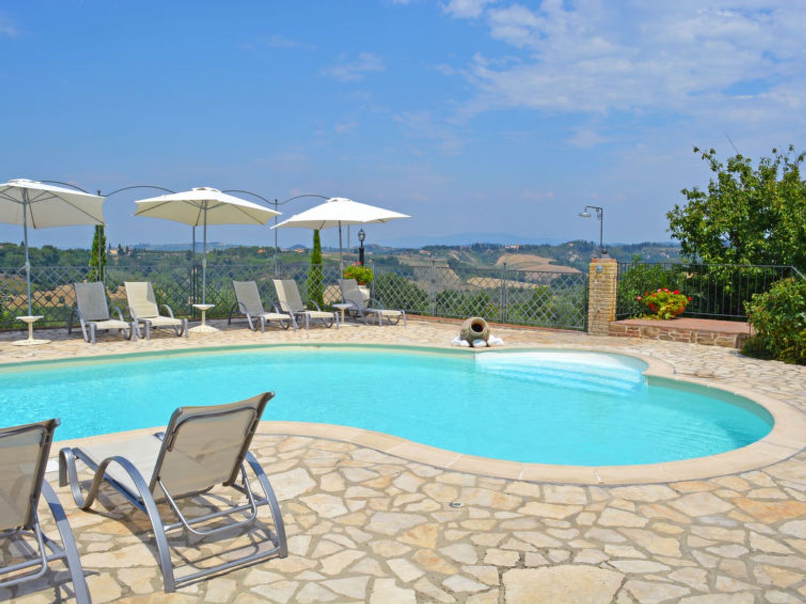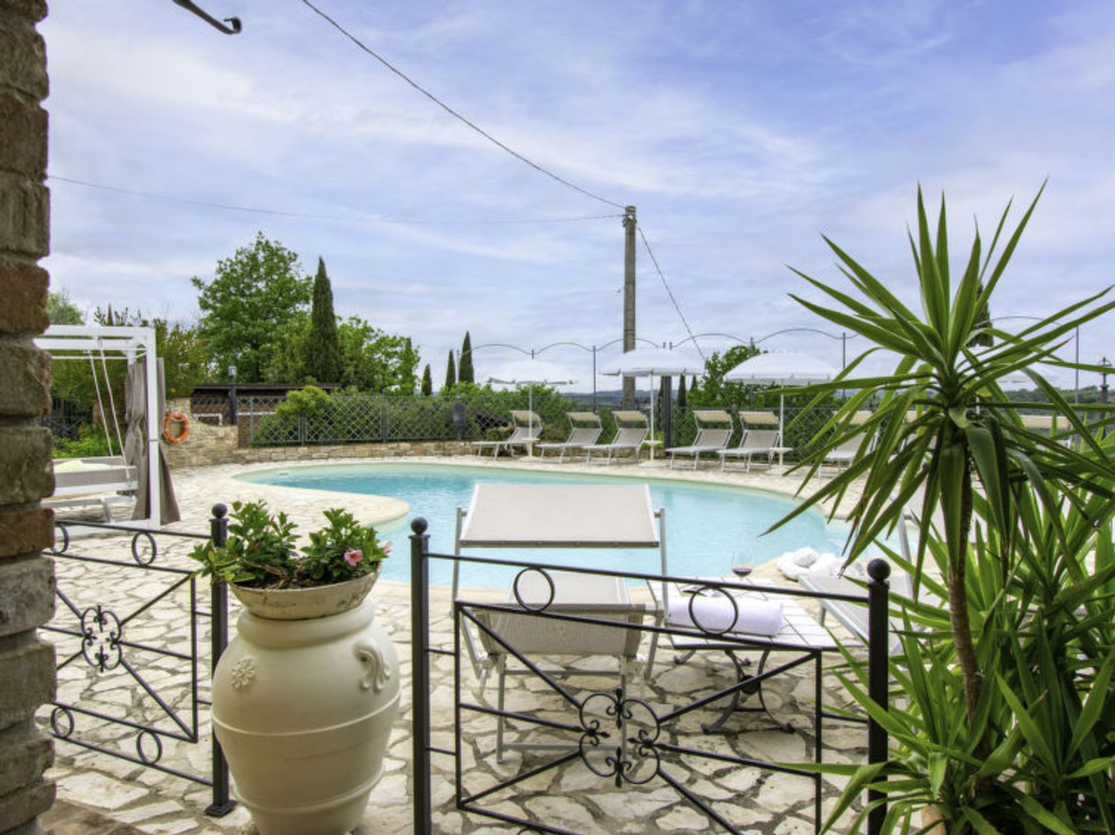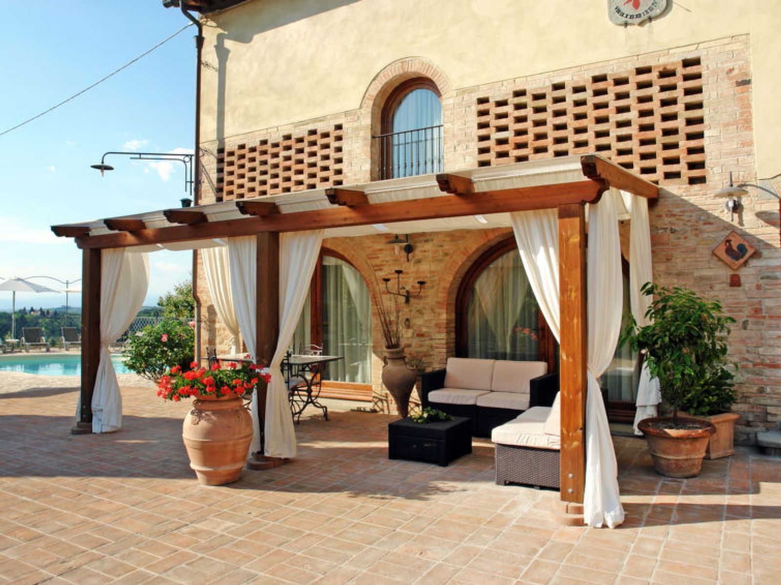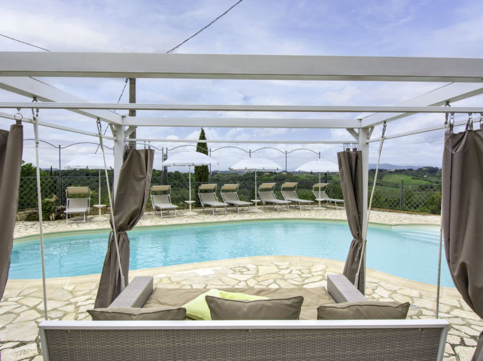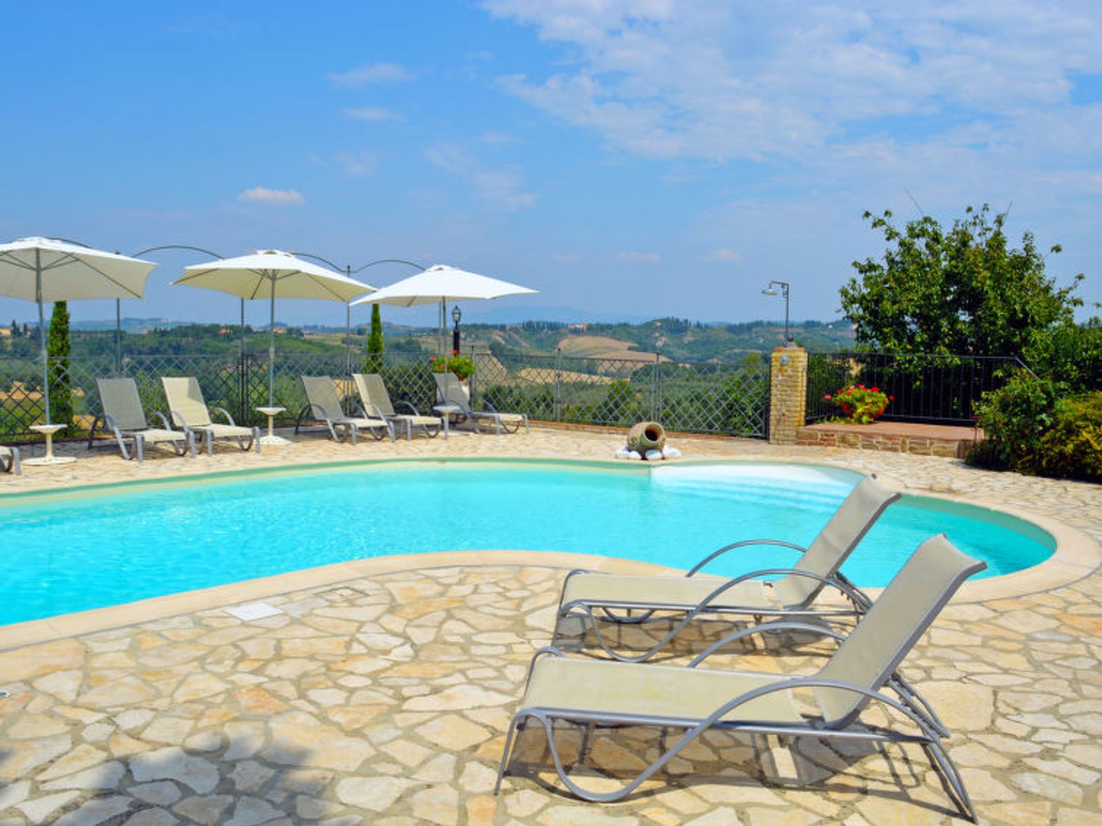 Schöner Landsitz "La Vecchia Pieve", auf 3 Stockwerken, einseitig angebaut, renoviert. Ruhige, sonnige Lage auf einem Hügel, im Grünen. Zur Mitbenutzung: Grundstück 15'000 m2, Garten (eingezäunt) Pflanzen und Blumen, Schwimmbad (4 x 14 m, 120 - 180 cm tief, saisonale Verfügbarkeit: 27.Mar. - 23.Okt.). Aussendusche, Tischtennis, Terrasse, Gartenmöbel, Grill (Rutschbahn, Schaukel). Zur Alleinbenutzung: gepflegter terrassierter Garten mit Pflanzen und Blumen. Terrasse, Gartenmöbel, Grill. In der Anlage: Wireless LAN, Waschmaschine (zur Mitbenutzung, extra), Heizung nur verfügbar von 01.Nov. - 29.Mar.. Parkplatz. Carport. Einkaufsgeschäft 3 km, Supermarkt 2.5 km, Restaurant 3 km, Bushaltestelle 4 km, Bahnstation "Castelfiorentino" 3 km. Golfplatz 14 km, Tennis 3 km, Reitstall 3 km. Nahe gelegene Sehenswürdigkeiten: Firenze 40 km, Siena 50 m, San Gimignano 20 km. Bitte beachten: Der Besitzer wohnt auf dem gleichen Grundstück. In der Unterkunft gibt es Kameras, die nur eventuelle Bewegungen aufzeichnen und von 1:00 am bis 6:00 am Uhr aktiv sind, zur Sicherheit der Gäste und des Hauses.