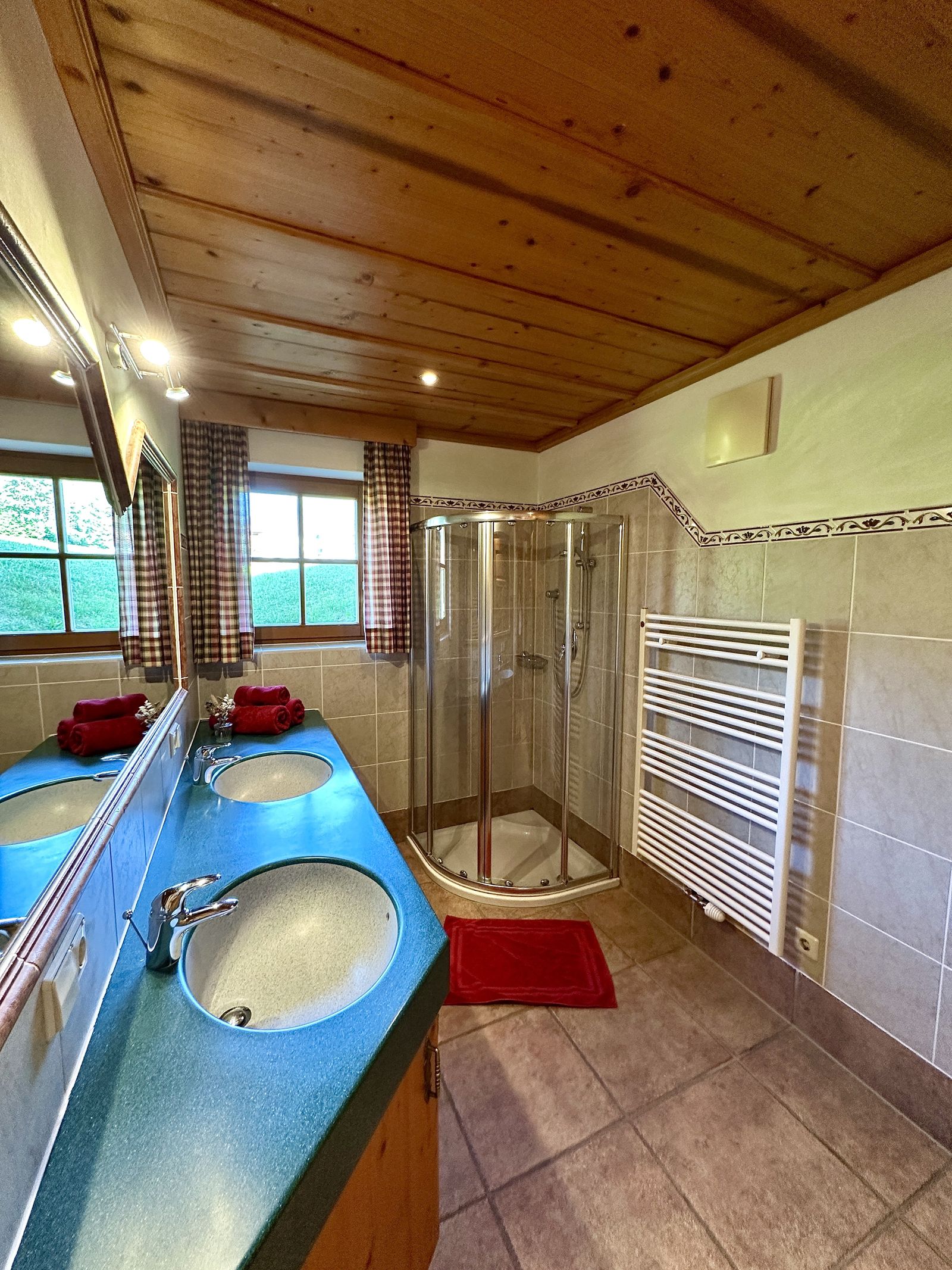 - 1 Badezimmer mit Dusche und zwei Waschbecken