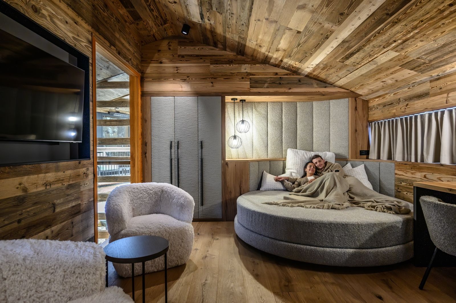 - gemütlicher Wohnbereich im OG mit Rundbett, Stühlen und Flatscreen
