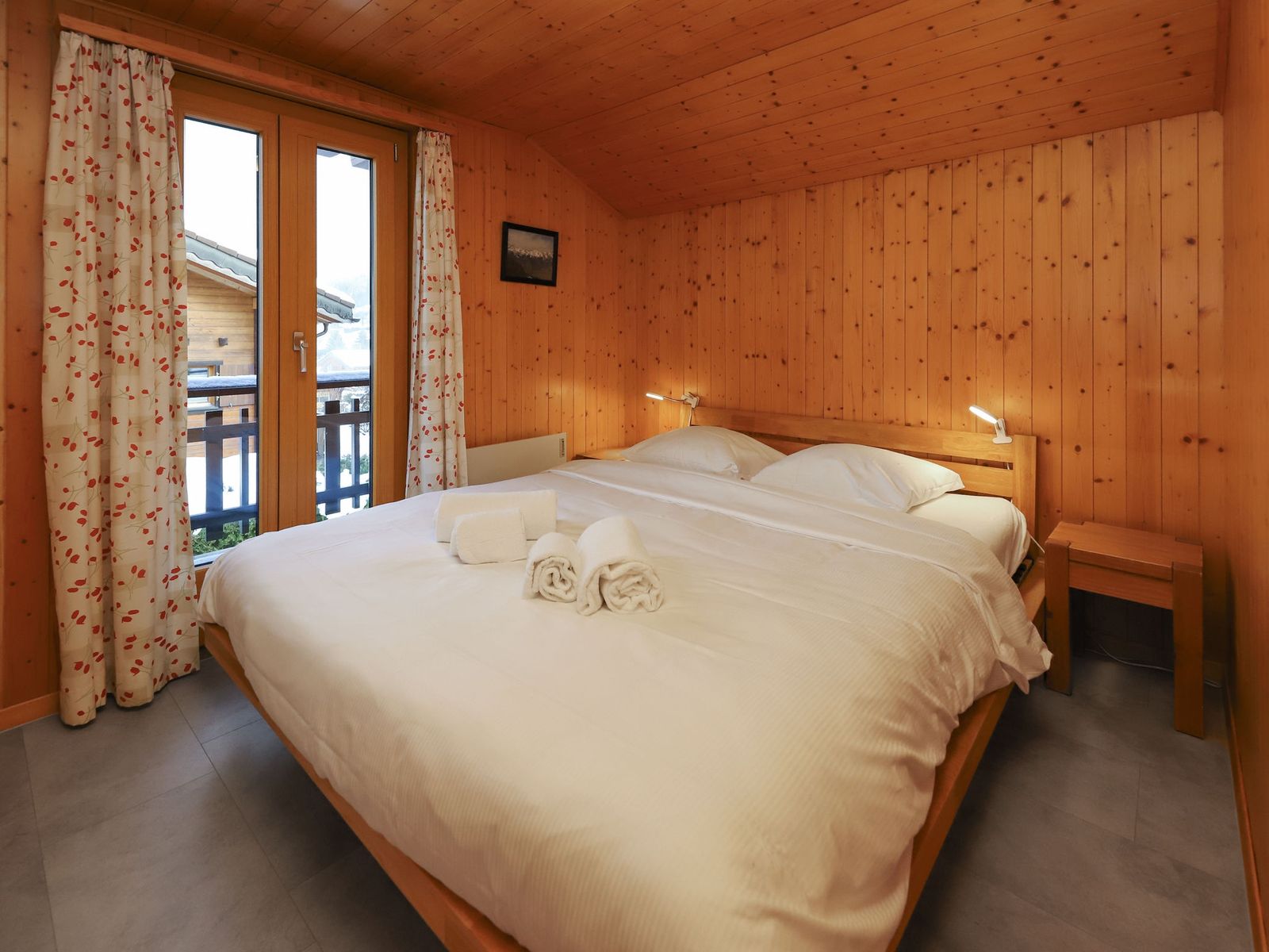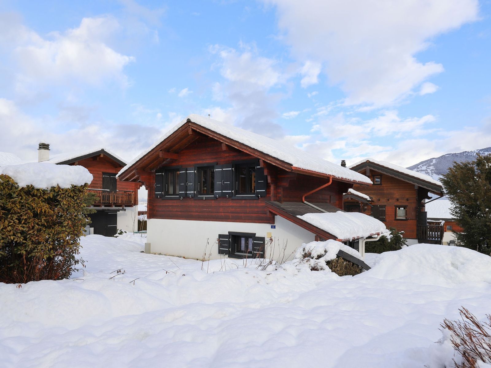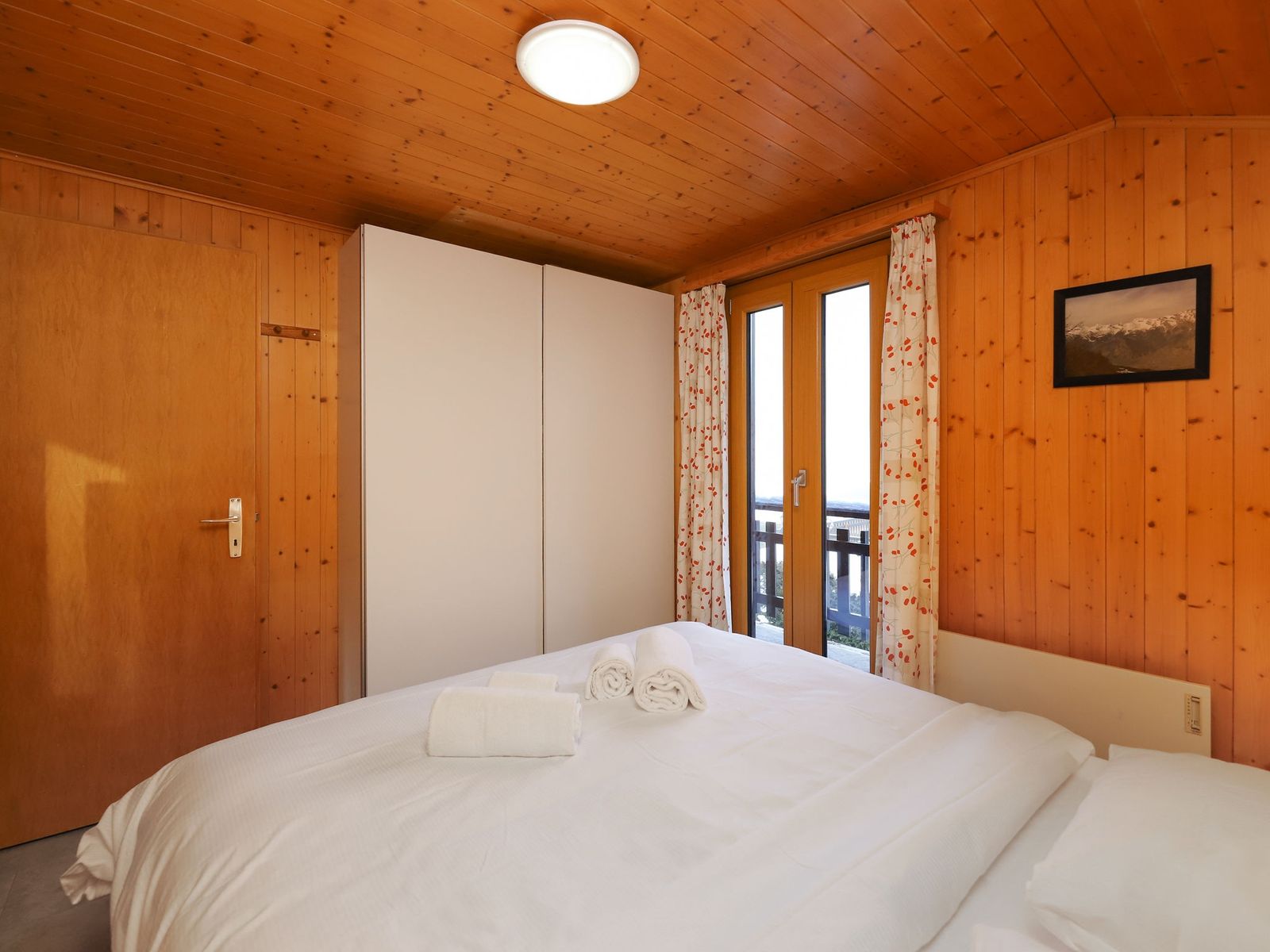 "Coucordin", 4-Zimmer-Chalet 73 m2 auf 2 Stockwerken. Schön eingerichtet: Wohn-/Esszimmer mit Sat-TV, Kabel-TV, Stereoanlage und E-Heizung. Ausgang zur Terrasse. Kleine, offene Küche (Backofen, Geschirrspüler, 4 Induktionskochplatten, Toaster, Wasserkocher, Racletteofen, Fondue Set (Chinoise)). Sep. WC. Obergeschoss: 1 Zimmer mit 1 franz. Bett (160 cm, Länge 200 cm). 1 kleines Zimmer mit 1 x 1 Etagenbetten (90 cm, Länge 200 cm). 1 Zimmer mit 1 franz. Bett (180 cm, Länge 200 cm). Dusche/WC, Doppelwaschbecken. Kleiner Balkon, Ostlage, Terrasse 20 m2, Südostlage. Terrassenmöbel, Gartengrill. Zur Verfügung: Waschmaschine, Wäschetrockner, Haartrockner. Internet (Wireless LAN, gratis). Parkplatz (2 Autos). Bitte beachten: Nichtraucher-Haus.