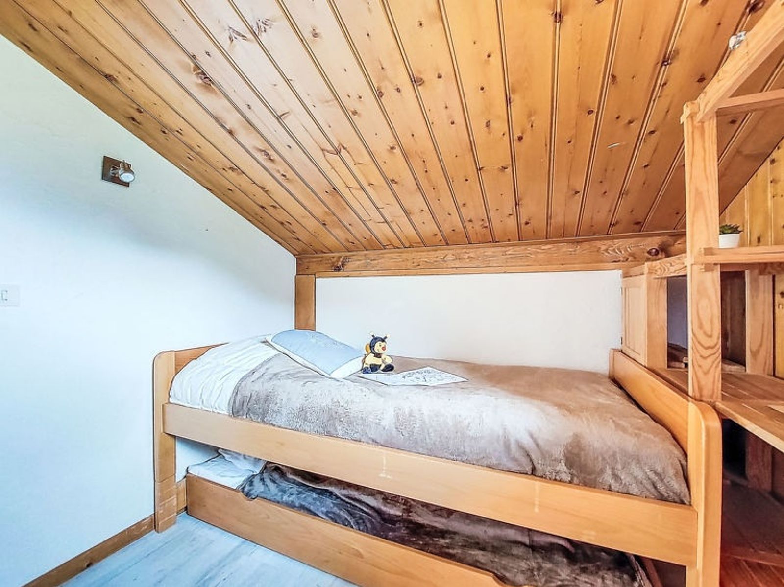 "Les Farfadets", 4-Zimmer-Chalet 41 m2 auf 2 Stockwerken. Wohn-/Esszimmer. Ausgang zur Terrasse, Richtung Osten. 1 Zimmer mit 1 franz. Bett (140 cm). Offene Küche (Backofen, Geschirrspüler, 3 Induktionskochplatten, Toaster, Wasserkocher, Tiefkühler, elektrische Kaffeemaschine, Racletteofen, Kombinationsmikrowelle, Fondue Set (Käse)). Bad, sep. WC. Obergeschoss: abgeschrägter kleiner Salon mit TV. 2 abgeschrägte Zimmer, jedes Zimmer mit 1 Bett (90 cm), 1 Schlafmöglichkeit (90 cm). E-Heizung, Bodenheizung. Kleine Terrasse 4 m2, Ostlage. Sicht auf die Berge. Zur Verfügung: Waschmaschine. Internet (Wireless LAN, extra). Parkplatz (überdacht). Bitte beachten: Nichtraucher-Unterkunft. TV nur FR. Rauchmelder. 21 m2, die Zimmer sind nicht höher als 1.80 m. 236N00426T
