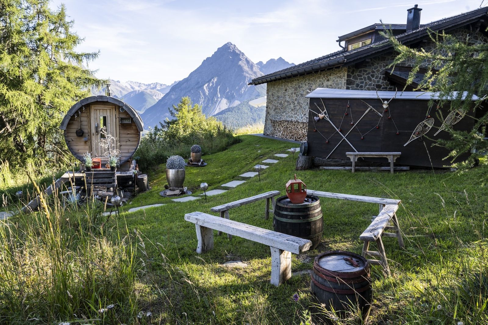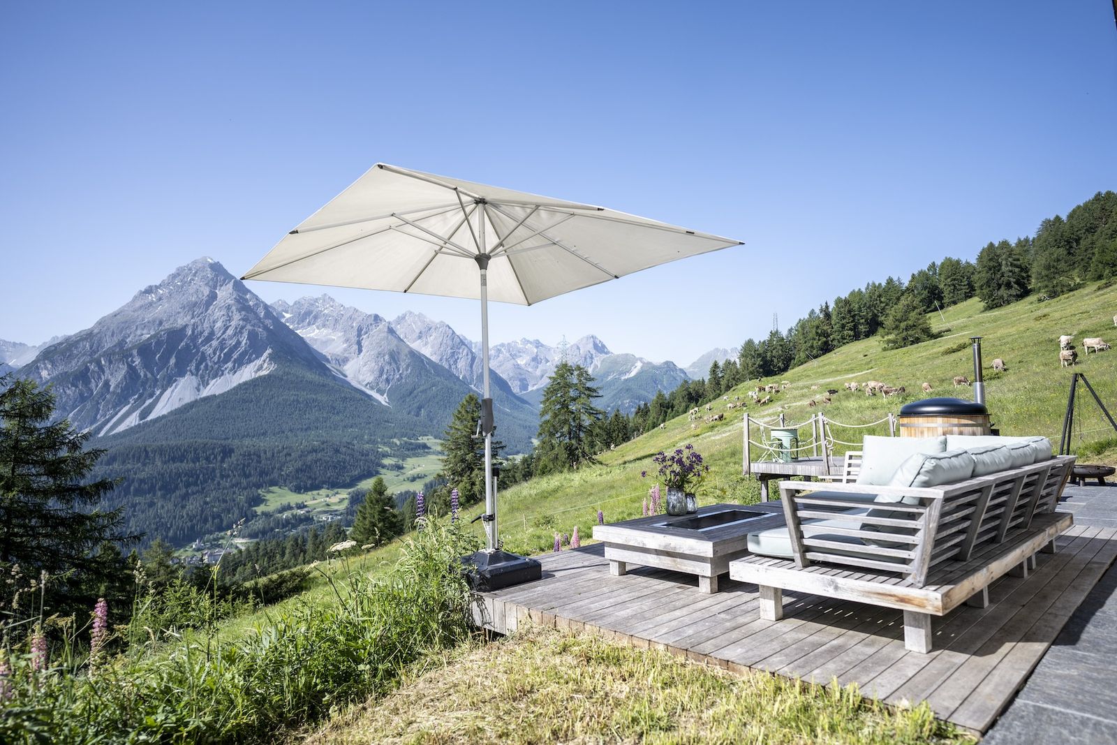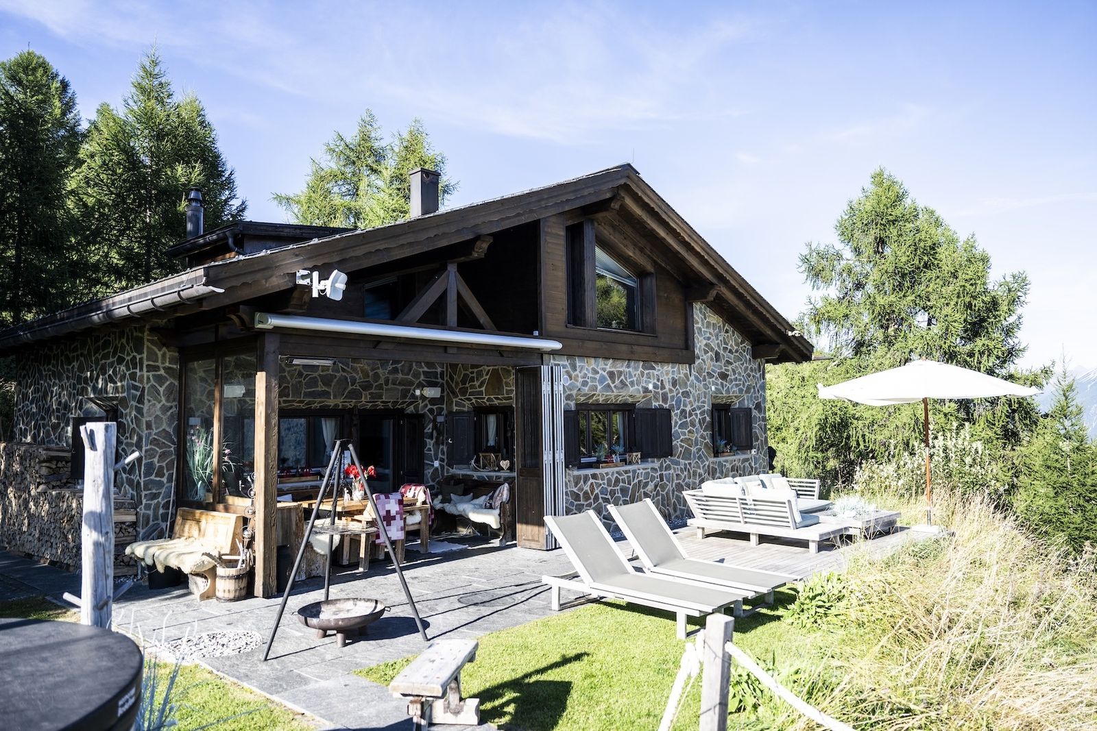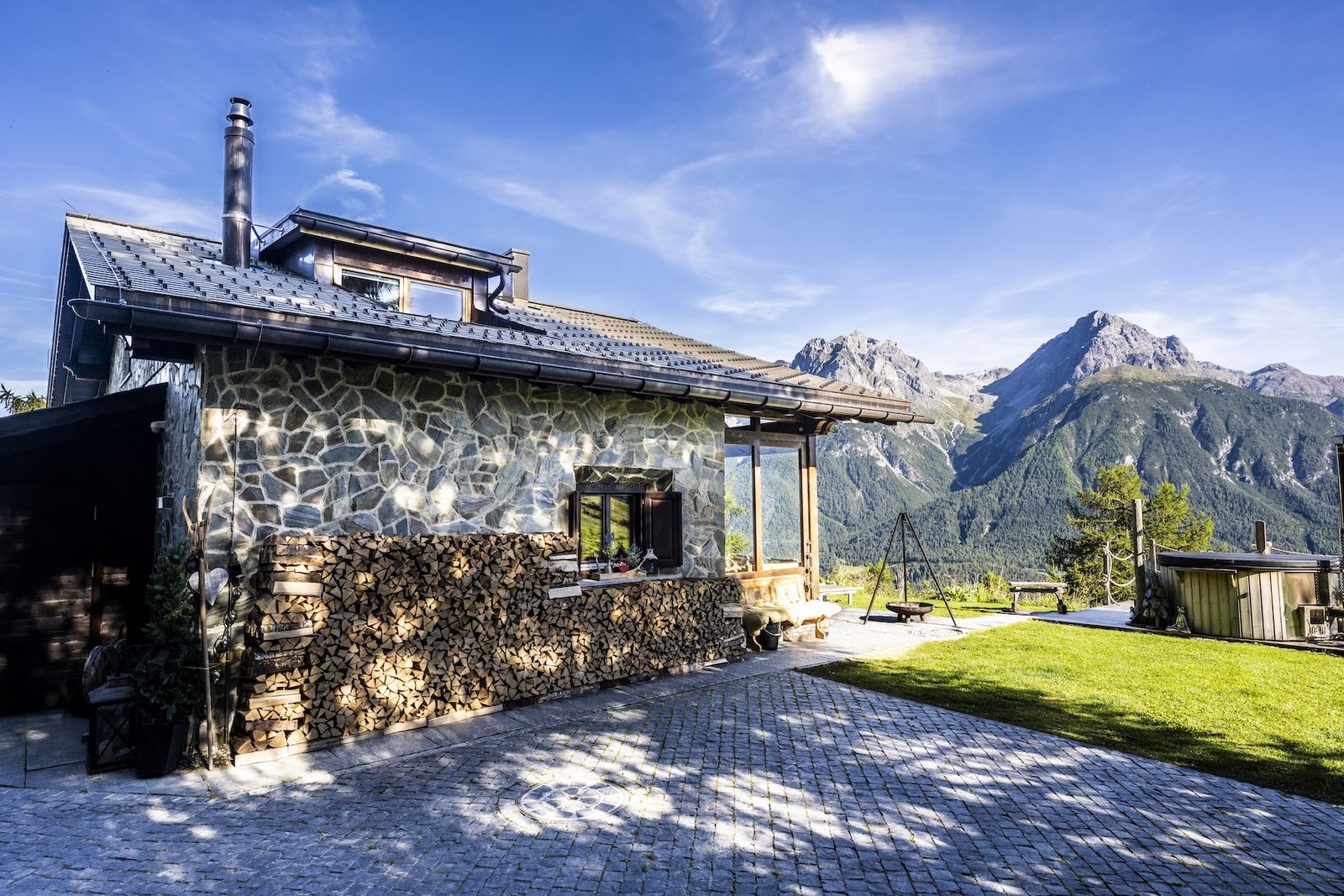 Ein weiteres Highlight im Chalet Flöna ist der Außenbereich. Hier ist eine überdachte Terrasse mit Heizstrahlern zu finden. Außerdem gibt es eine weitere Sonnenterrasse und ein HotPot mit Holzbefeuerung. Die Sauna befindet sich ebenfalls im Außenbereich.
