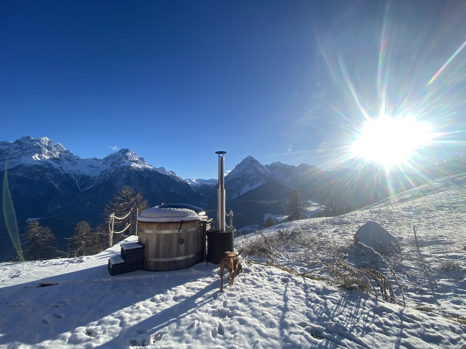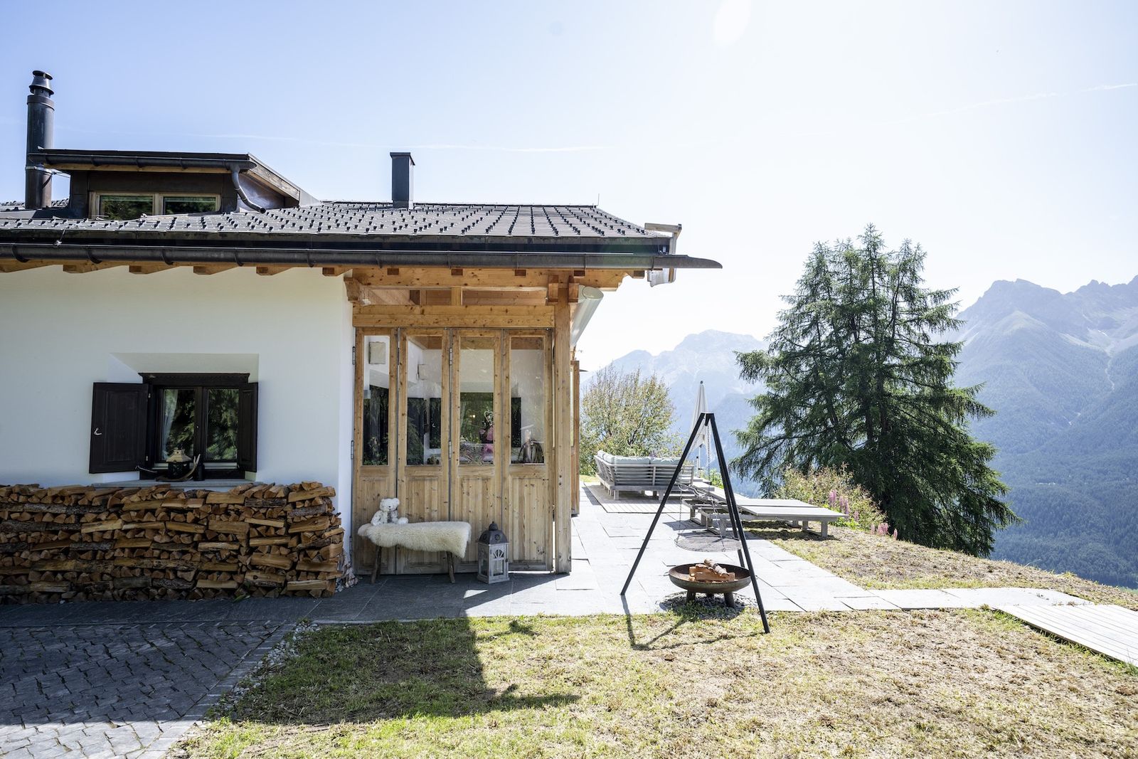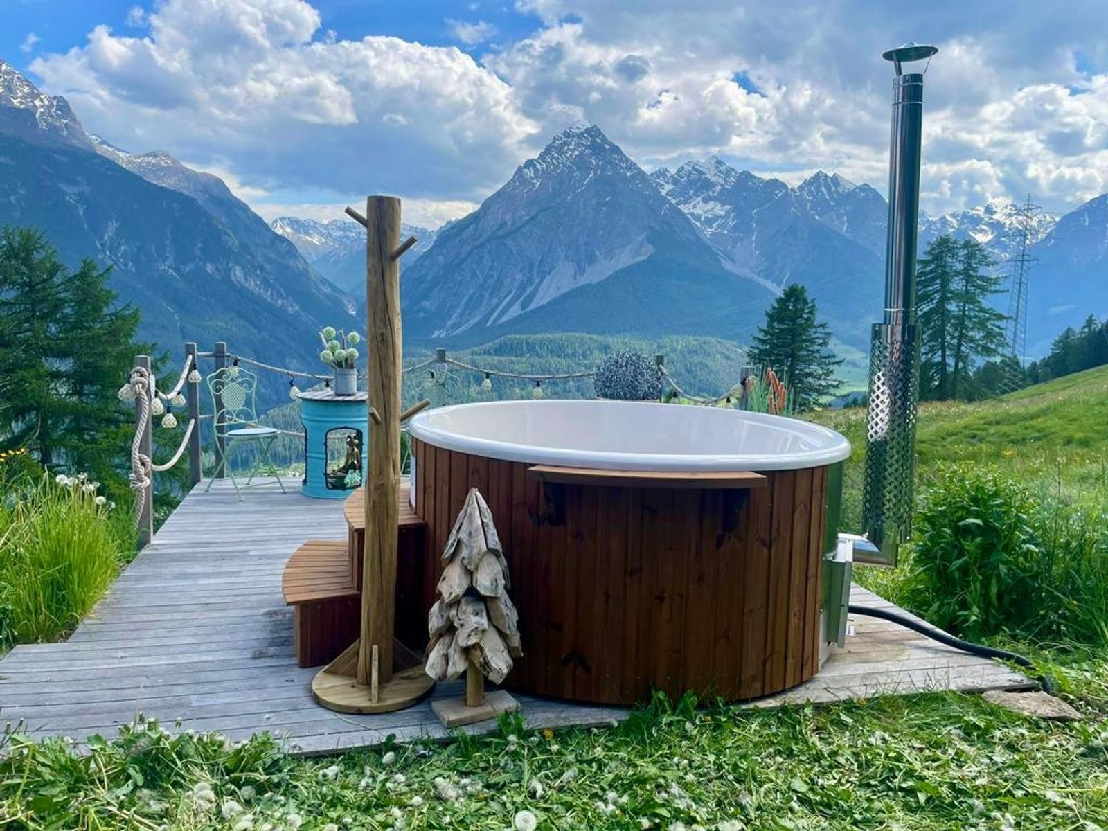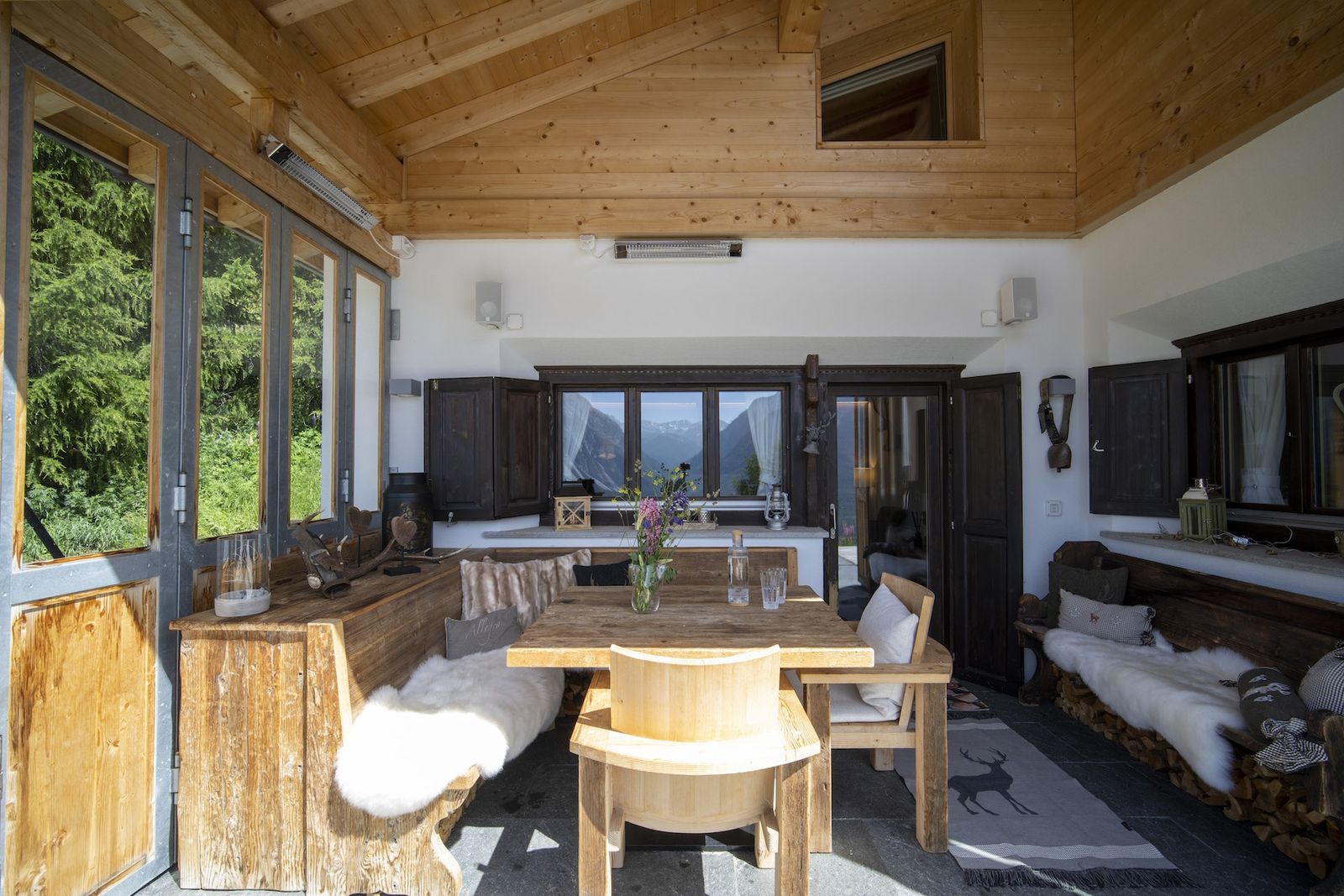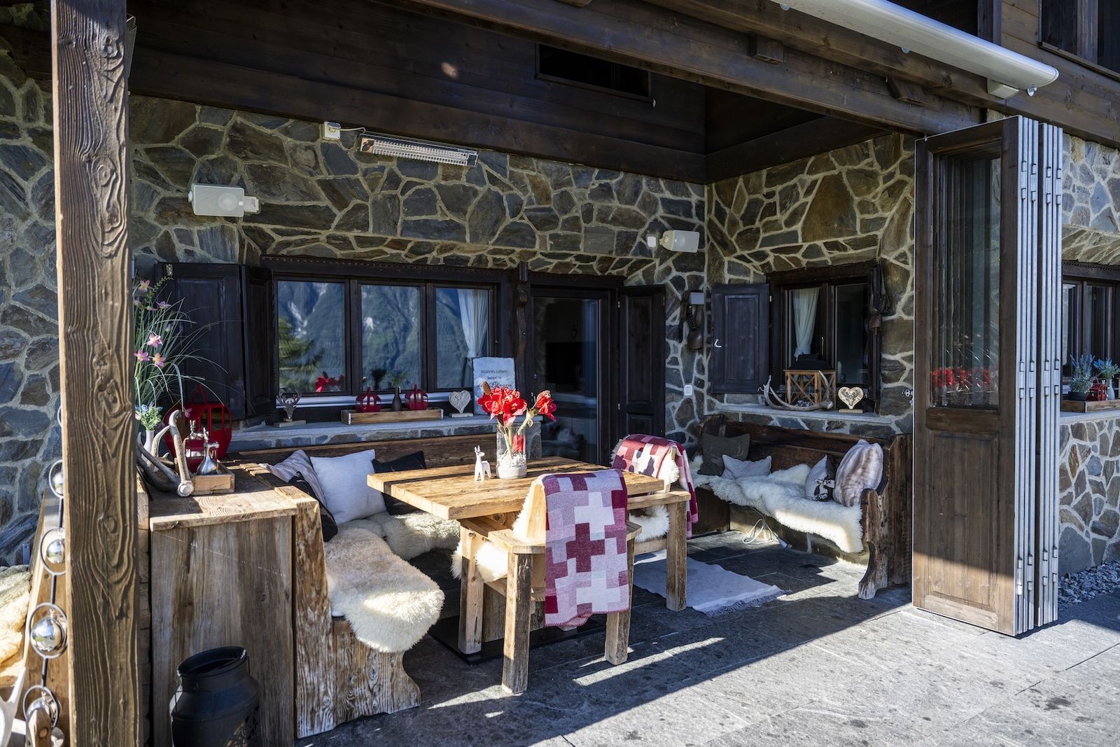 Ein weiteres Highlight im Chalet Flöna ist der Außenbereich. Hier ist eine überdachte Terrasse mit Heizstrahlern zu finden. Außerdem gibt es eine weitere Sonnenterrasse und ein HotPot mit Holzbefeuerung. Die Sauna befindet sich ebenfalls im Außenbereich.