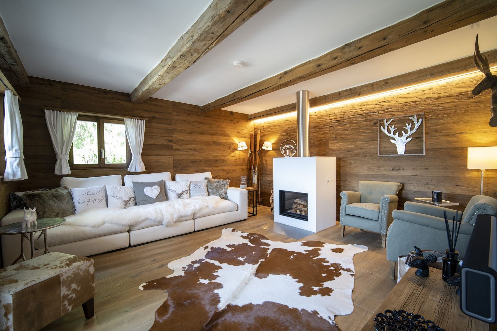 - Wohnstube mit großer Couch, Sesseln, Kamin & Fernseher
