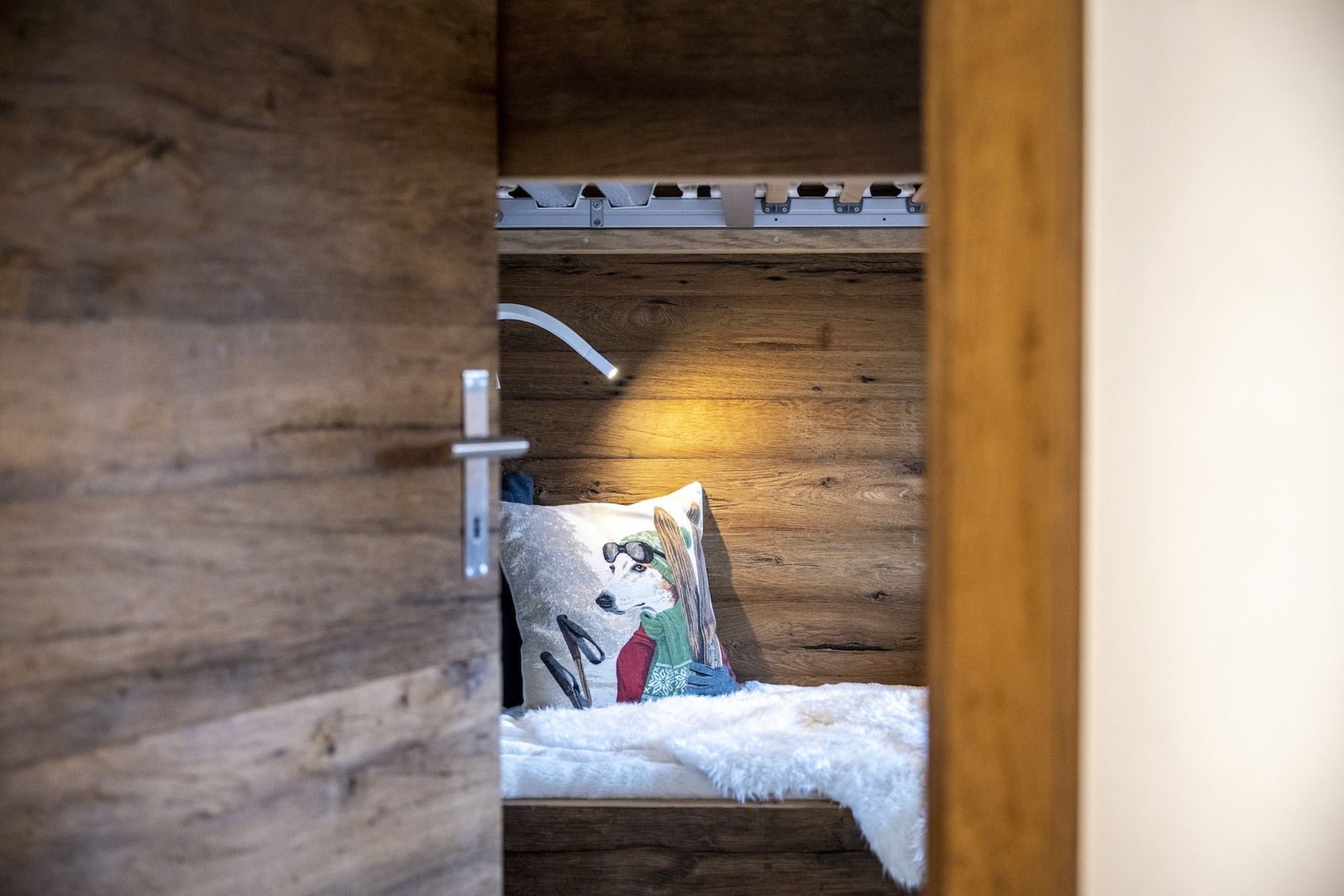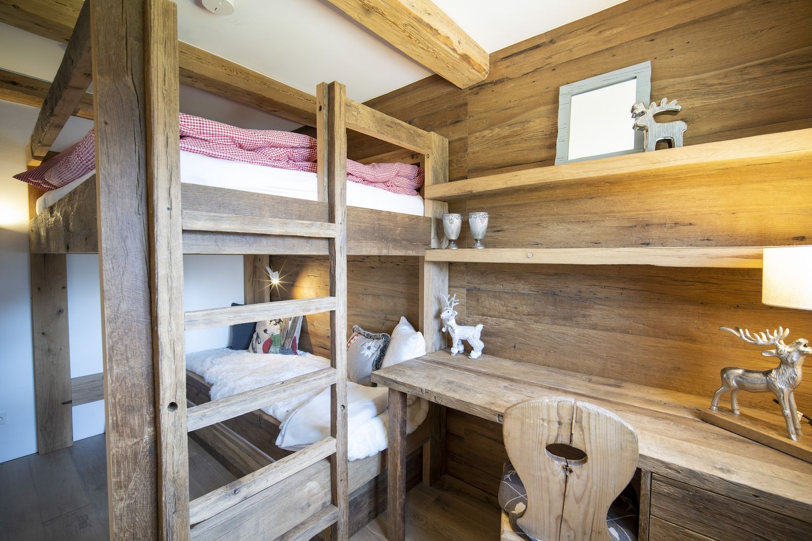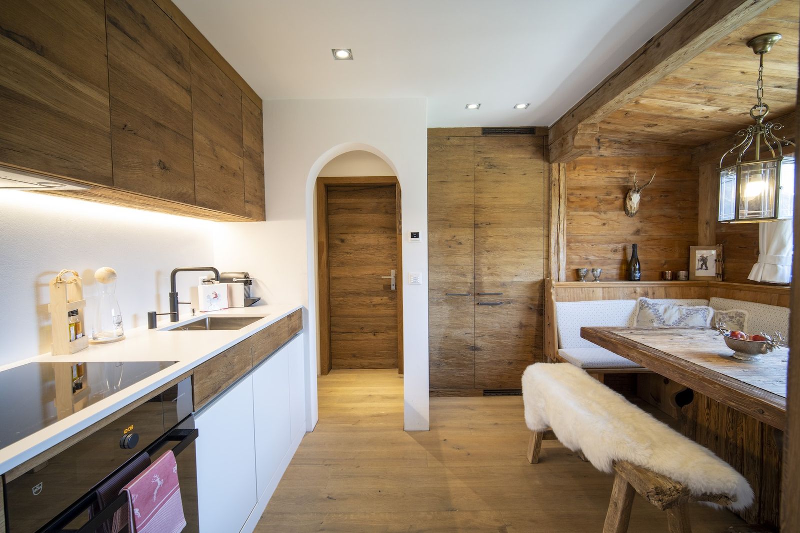 Die Wohnfläche verteilt sich auf zwei Stockwerke. Im Erdgeschoss befindet sich das gemütliche Wohnzimmer mit Couch, zwei Sesseln, Kaminofen und TV. Angrenzend befindet sich die hochwertige Küche mit Essecke. Die Küche ist ausgestattet mit Geschirrspüler, Backofen, Induktionsherd, Quooker-Soda-Stream, Nespresso-Kaffeemaschine, Fondueset, Raclette-Ofen und einem großen Kühlschrank mit Gefrierfächern. Vom Essplatz wird wieder ein traumhafter Ausblick auf die außenliegende Bergwelt geboten. Das Schlafzimmer mit dem Stockbett befindet sich ebenfalls im Erdgeschoss.