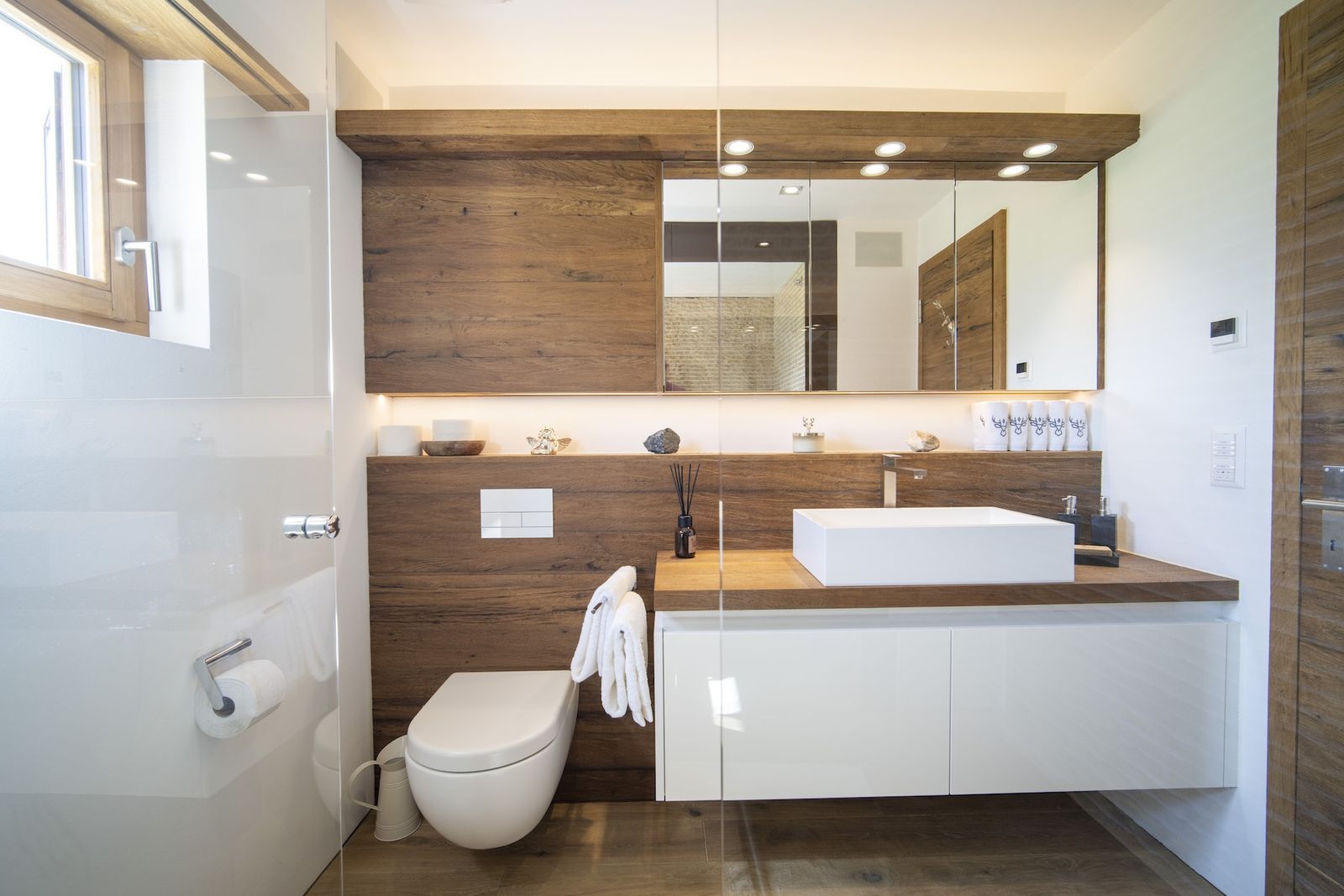 Die beiden anderen Schlafzimmer sind im Obergeschoss untergebracht. Sie unterteilen sich in eine Master-Bedroom mit freistehender Badewanne und Waschbecken und ein weiteres Schlafzimmer mit einem Doppelbett. Sowohl im Erdgeschoss als auch im Obergeschoss befinden sich jeweils ein Badezimmer mit bodentiefer Dusche, Toilette und Waschbecken. Das Badezimmer im Erdgeschoss verfügt zusätzlich über eine Dampfdusche.