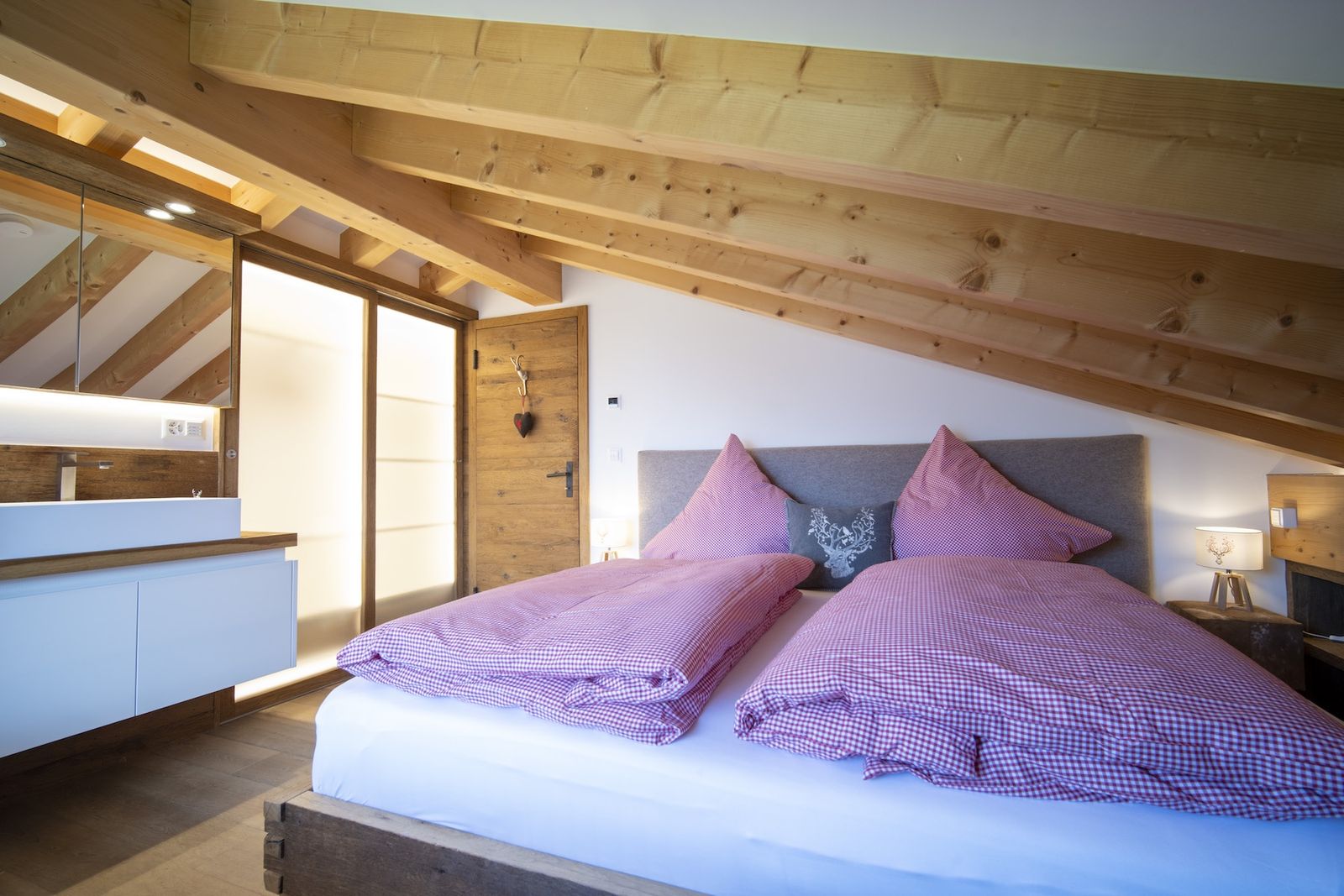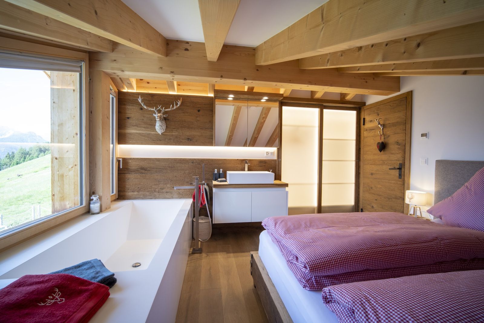 - 1x Schlafzimmer mit Doppelbett und Panorama-Badewanne & Waschbecken