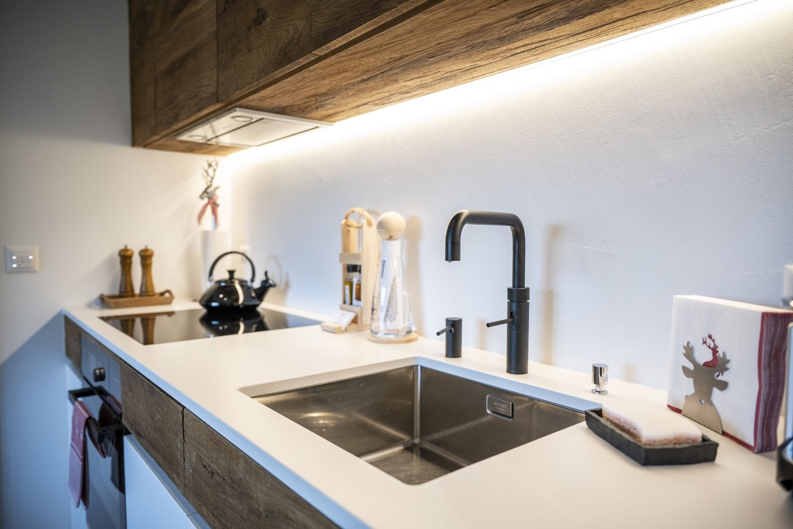 - Küche: Geschirrspüler, Backofen, Induktionsherd mit integriertem Dampfabzug, Quooker-Soda-Stream, Nespresso-Kaffeemaschine, Fondueset, Raclette-Ofen & grosser Kühlschrank