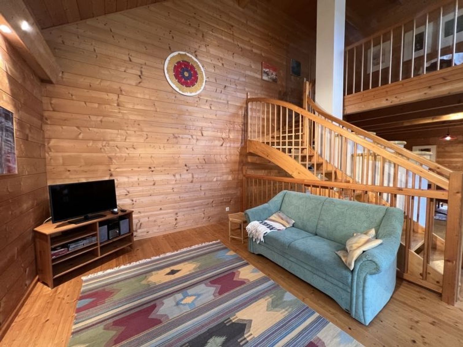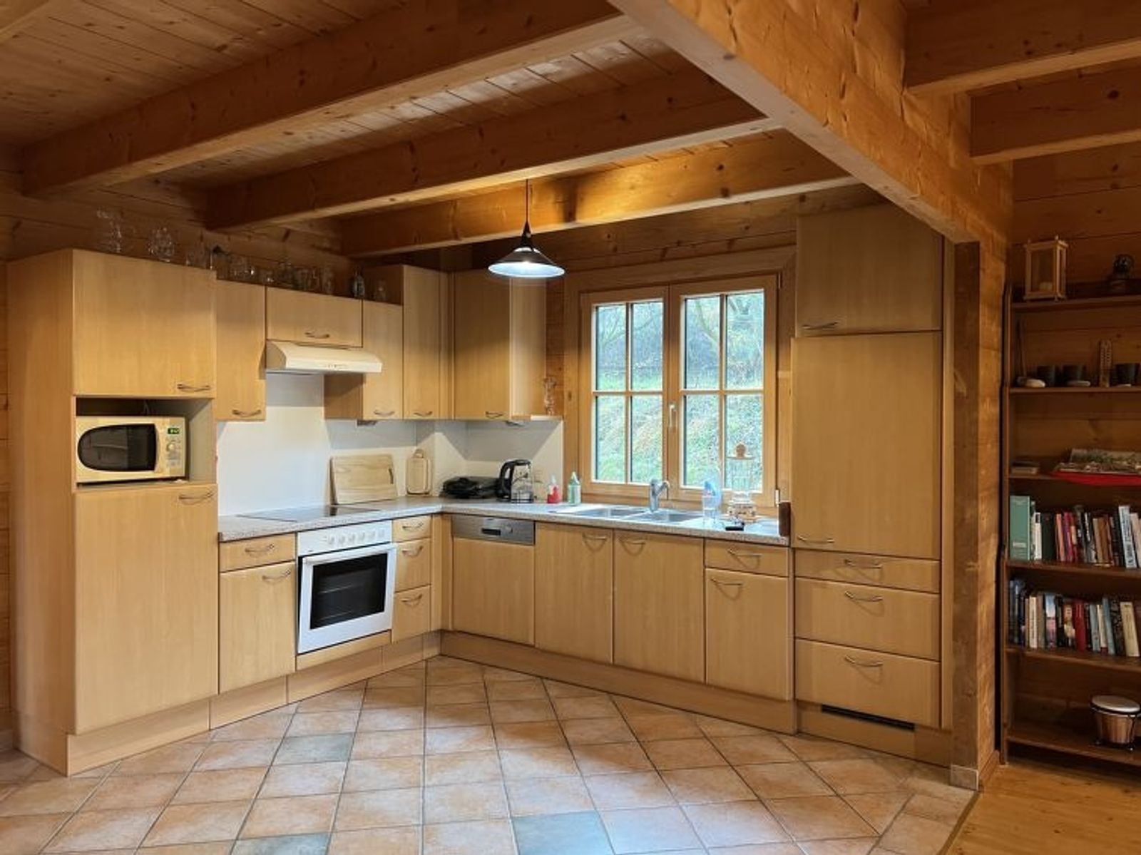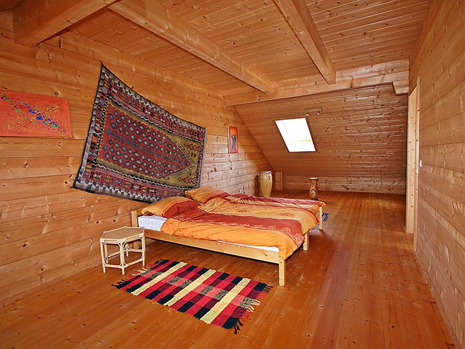 4-Zimmer-Landhaus 130 m2 auf 3 Stockwerken. Hell, komfortabel und mit viel Holz eingerichtet: grosser Eingang. Offenes Esszimmer. Ausgang zur Terrasse. Offenes Wohnzimmer mit 1 Doppeldiwanbett, Sat-TV, Flachbildschirm und Kachelofen. Ausgang zum Garten. 1 Doppelzimmer. Offene Galerie. Ausgang zum Balkon. Offene Küche (Backofen, Geschirrspüler, 4 Glaskeramikplatten, Mikrowelle, elektrische Kaffeemaschine). Bad/Dusche, sep. WC, Doppelwaschbecken mit Eckbadewanne. Fussbodenheizung. Obergeschoss: 1 grosses Doppelzimmer mit Dachfenster. Holzdielenboden. Balkon 10 m2, grosse Terrasse 15 m2. Terrassenmöbel, Gartengrill. Herrliche Sicht auf den Garten, die Landschaft und die Ortschaft. Zur Verfügung: Waschmaschine, Haartrockner. Internet (WLAN, gratis). Bitte beachten: Nichtraucher-Unterkunft. Rauchmelder.