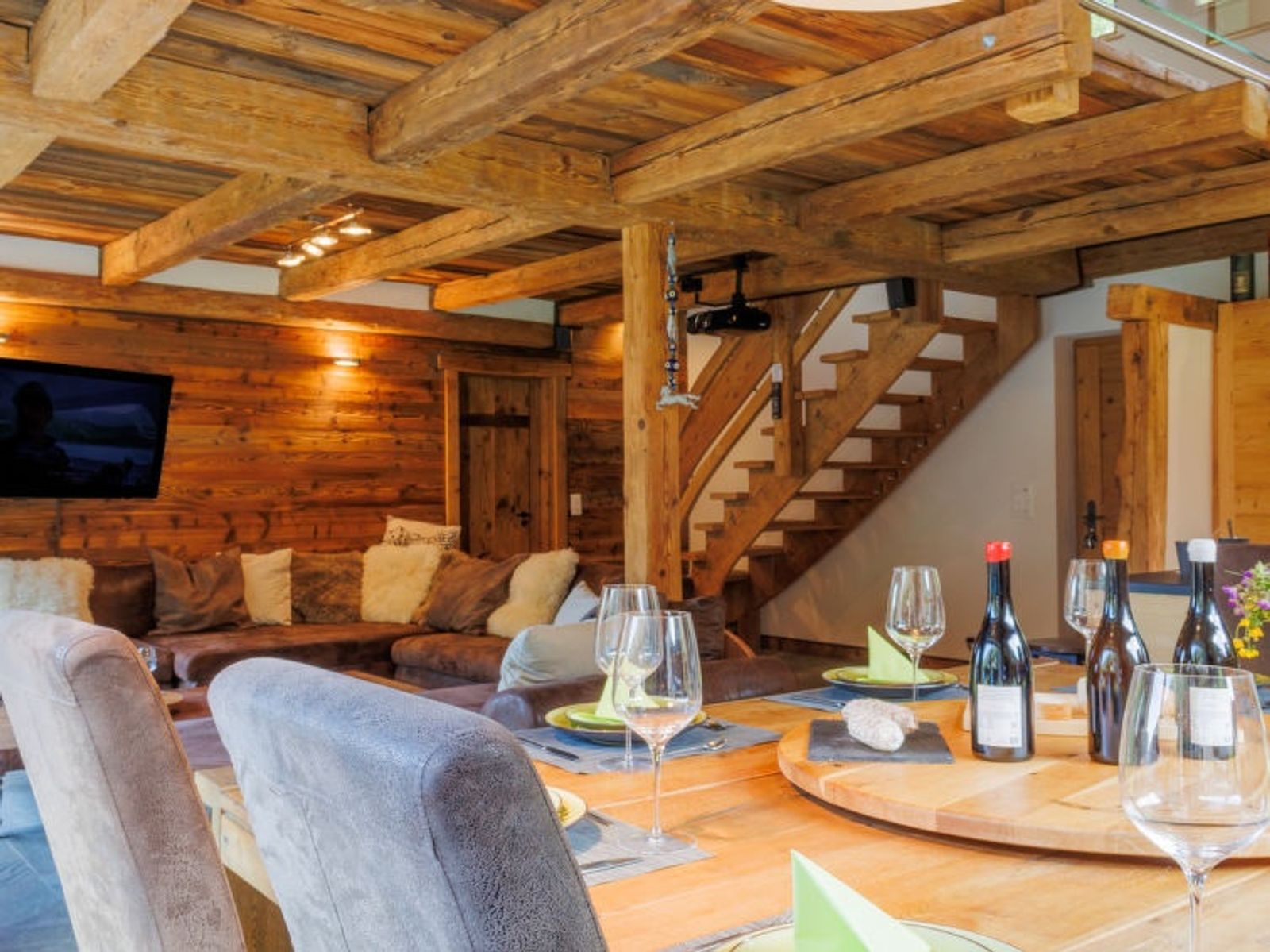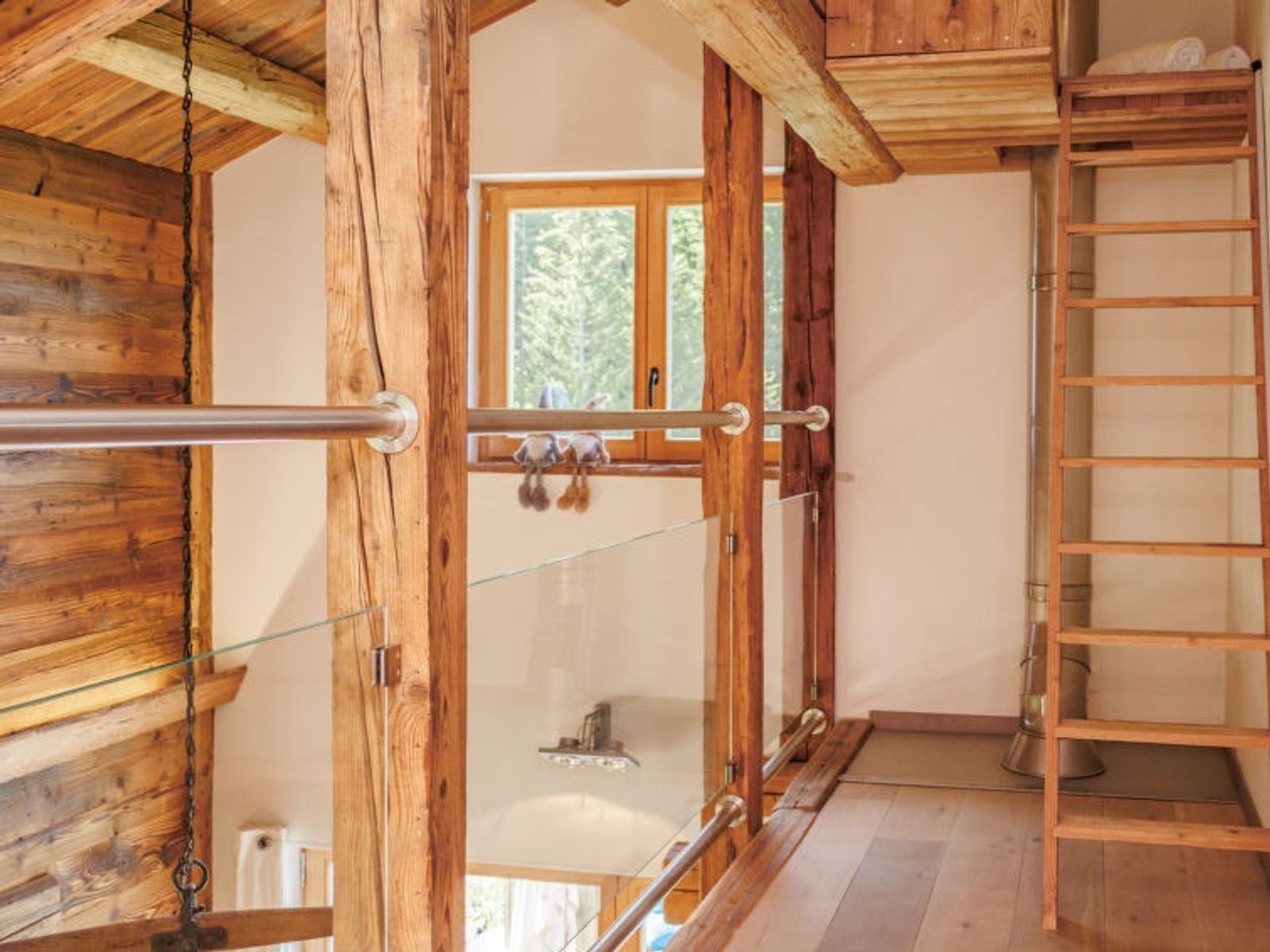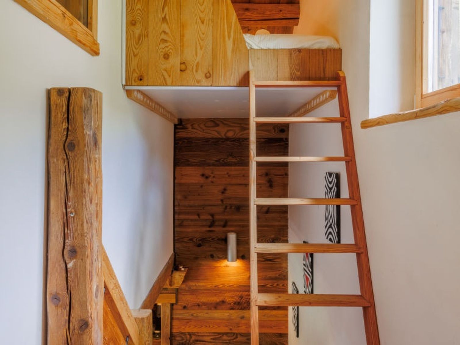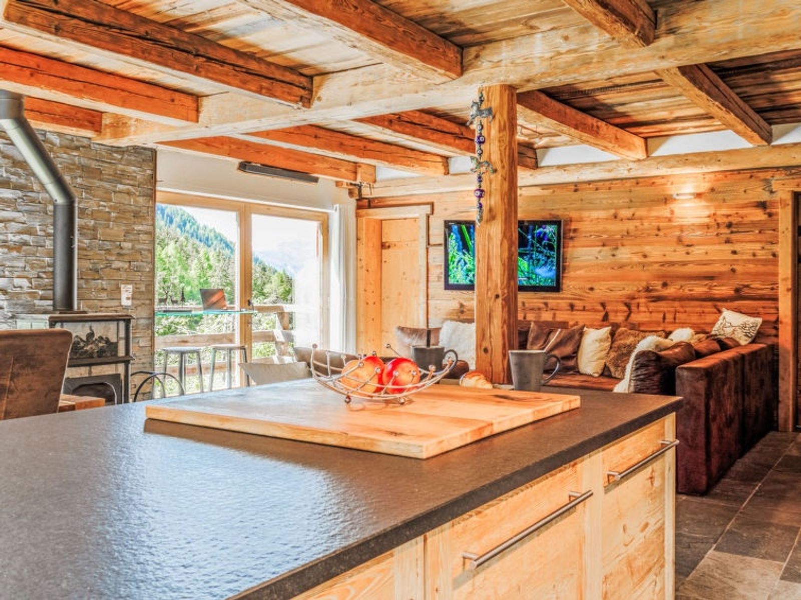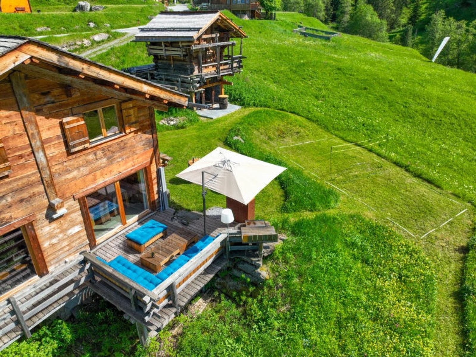 " Chalet Gaea", 5-Zimmer-Chalet 140 m2 auf 3 Stockwerken, Nordostlage. Objekt geeignet für 6 Erwachsene + 3 Kinder. Teilweise abgeschrägt, sehr komfortabel und schön eingerichtet: Eingang. Wohn-/Esszimmer mit Schwedenofen und Heimkino. Ausgang zur Terrasse. Offene Küche (Backofen, Geschirrspüler, 4 Induktionskochplatten, Toaster, Wasserkocher, Mikrowelle, Tiefkühler, elektrische Kaffeemaschine, Kapseln für die Kaffeemaschine (Nespresso) extra, Racletteofen, Fondue Set (Käse)). Bad/Dusche/WC. Unteres Geschoss: 1 Zimmer mit 1 franz. Bett (180 cm, Länge 200 cm), Bad/Dusche/WC. Obergeschoss: 1 Zimmer mit 1 Bett (90 cm, Länge 200 cm), 1 franz. Bett (160 cm, Länge 200 cm). (Leiter) abgeschrägte, offene kleine Galerie, Deckenhöhe 120 - 145 cm mit 1 Bett (90 cm, Länge 200 cm). 1 Zimmer, ohne Schrank mit 1 Doppeldiwanbett (140 cm, Länge 200 cm). Dachgeschoss: (Leiter) abgeschrägte, offene Galerie, Deckenhöhe 48 - 135 cm mit 1 Bett (90 cm, Länge 200 cm). Grosse Terrasse. Terrassenmöbel, Gartengrill, Liegestühle. Sehr schöne Sicht auf die Berge. Zur Verfügung: Waschmaschine, Wäschetrockner, Haartrockner. Internet (WLAN, gratis). Parkplatz (3 Autos). Bitte beachten: nicht geeignet für Kinder unter 8 Jahren. Nichtraucher-Unterkunft. Anstelle eines abgeschlossenen Schlafzimmers befinden sich manche Schlafplätze in einem offenen Bereich (Galerie, Nische etc.).