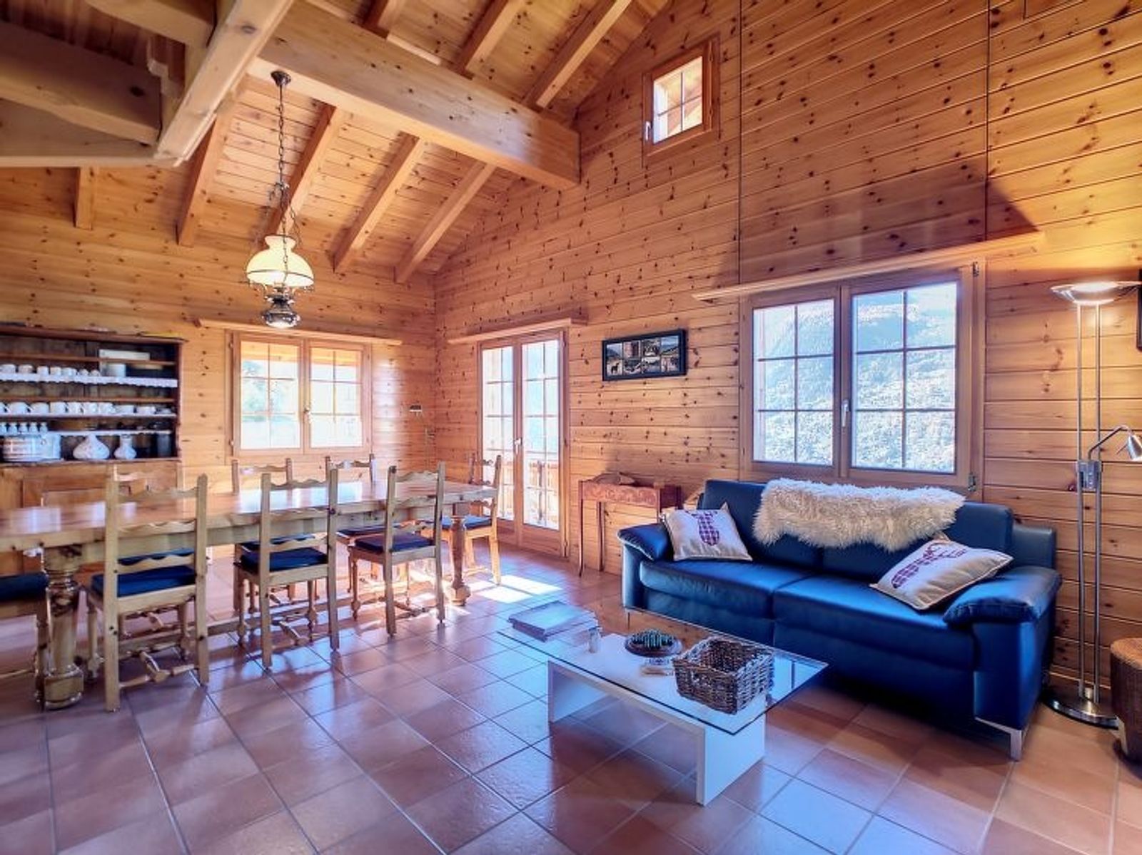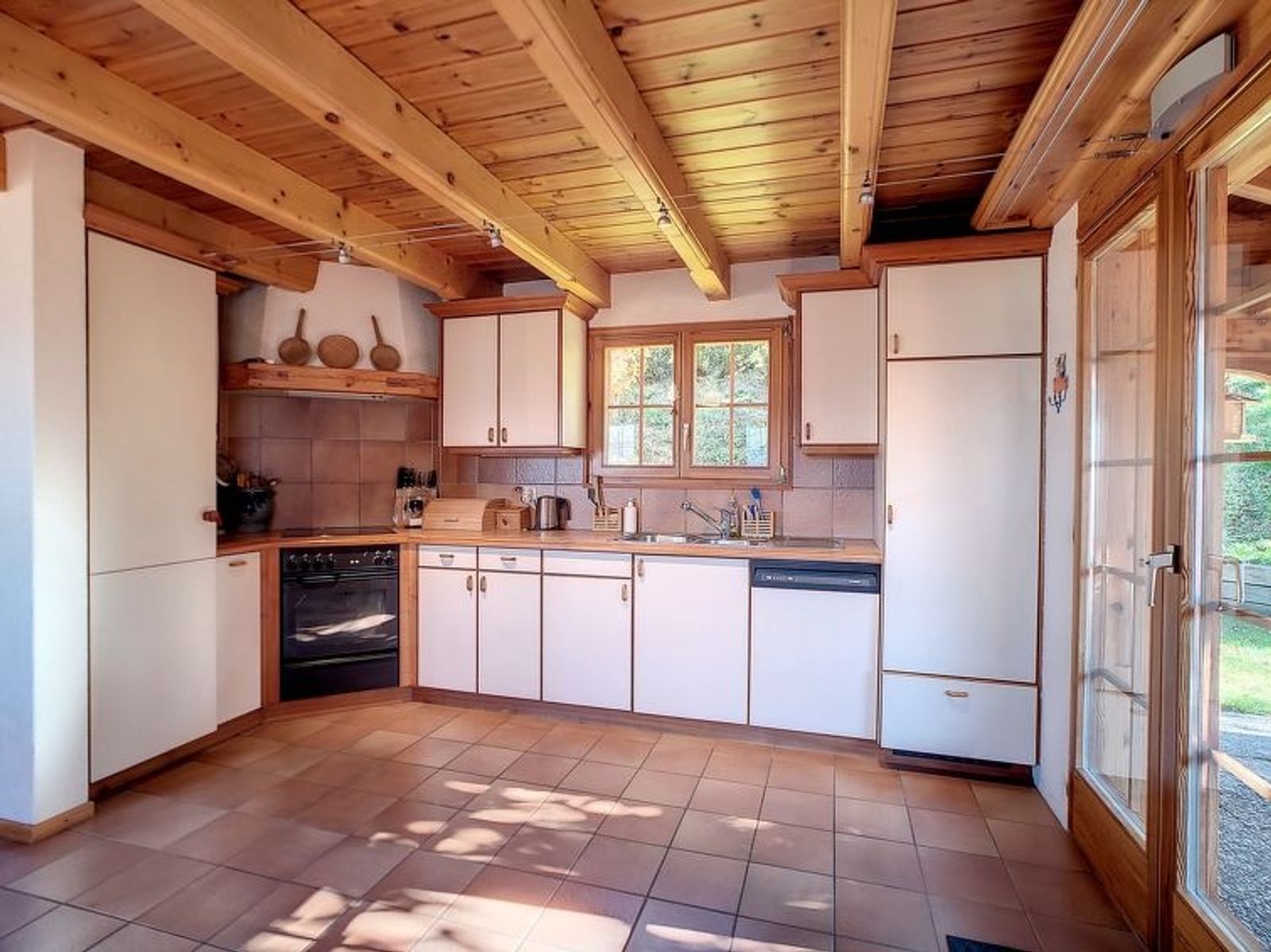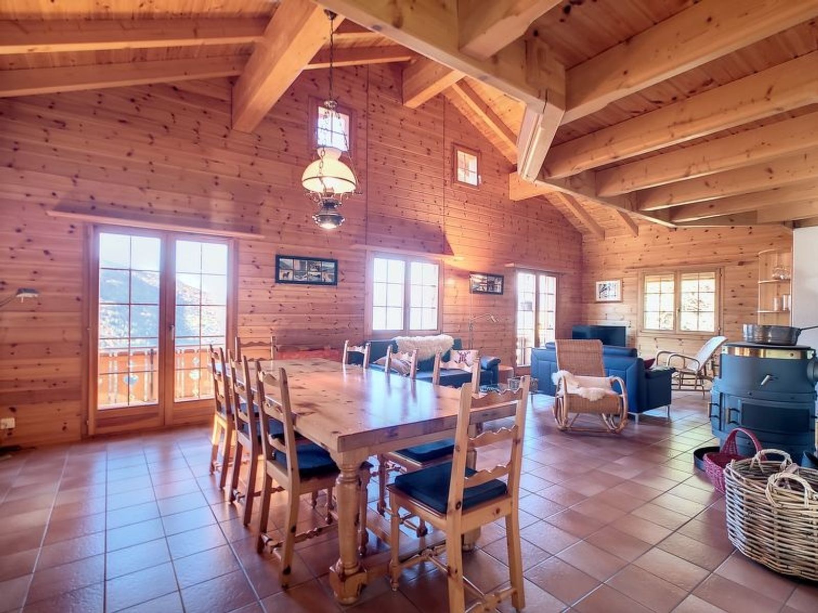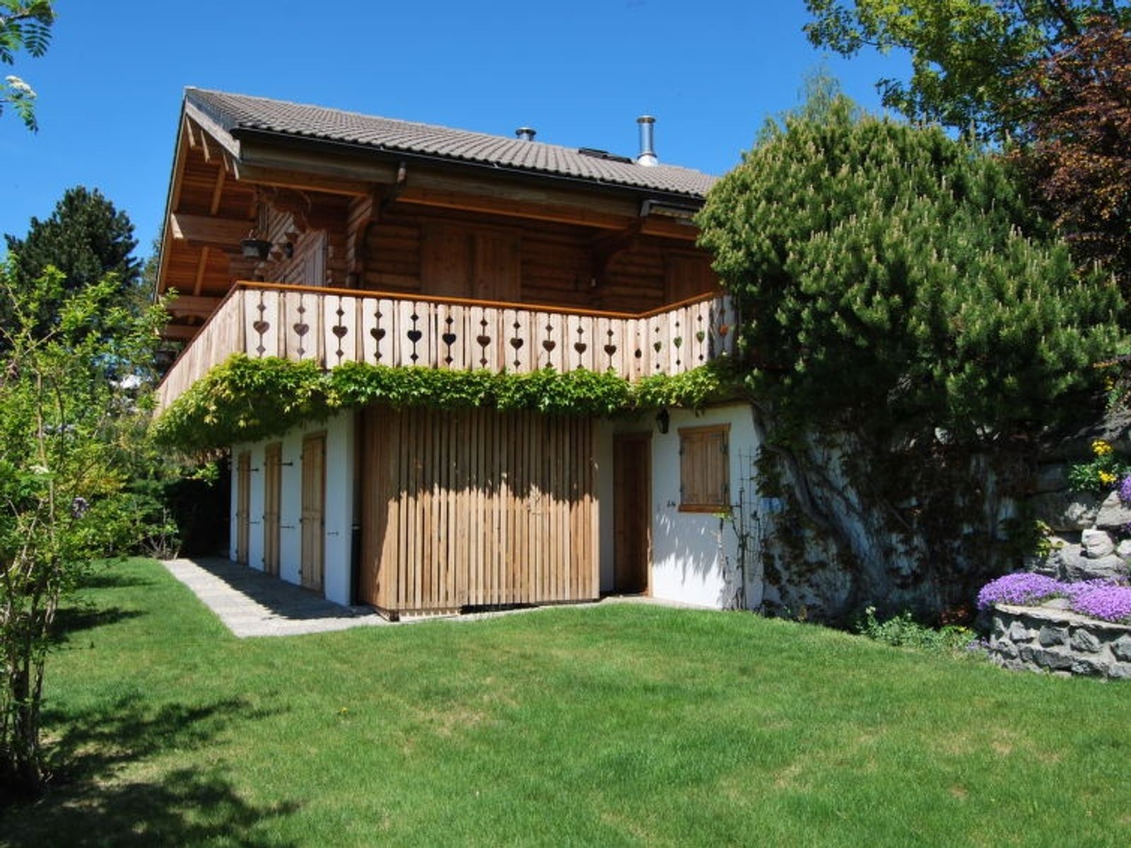 "Les 4 Saisons", 4-Zimmer-Chalet 180 m2 auf 3 Stockwerken, Südostlage. Geräumig, komfortabel und mit viel Holz eingerichtet: grosses Wohn-/Esszimmer mit Schwedenofen und Kabel-TV. Ausgang zum Balkon, zur Terrasse, Richtung Süden und Richtung Westen. Grosse, offene Küche (Backofen, Geschirrspüler, 4 Glaskeramikplatten, elektrische Kaffeemaschine, Racletteofen, Fondue Set (Chinoise, Käse)). Bad/WC. Ölheizung. Unteres Geschoss: 1 Zimmer mit 1 Doppelbett (2 x 90 cm, Länge 190 cm). Ausgang zum Garten. 1 Zimmer mit 1 franz. Bett (140 cm, Länge 190 cm). Ausgang zum Garten. 1 Zimmer mit 1 x 2 Etagenbetten (90 cm, Länge 190 cm). Ausgang zum Garten. Dusche/WC. Obergeschoss: abgeschrägte, offene Galerie mit 1 franz. Bett (140 cm, Länge 190 cm) (2 Pers.). Grosser Balkon, Südlage und Ostlage, Garten, Rasen. Terrassenmöbel, Gartengrill. Panoramasicht auf die Berge und den Wald. Zur Verfügung: Waschmaschine, Haartrockner. Internet (Wireless LAN, gratis). Garage (2 Autos) in 150 m, Höhe 200 cm. Bitte beachten: Nichtraucher-Haus. Anstelle eines abgeschlossenen Schlafzimmers befinden sich manche Schlafplätze in einem offenen Bereich (Galerie, Nische etc.).
