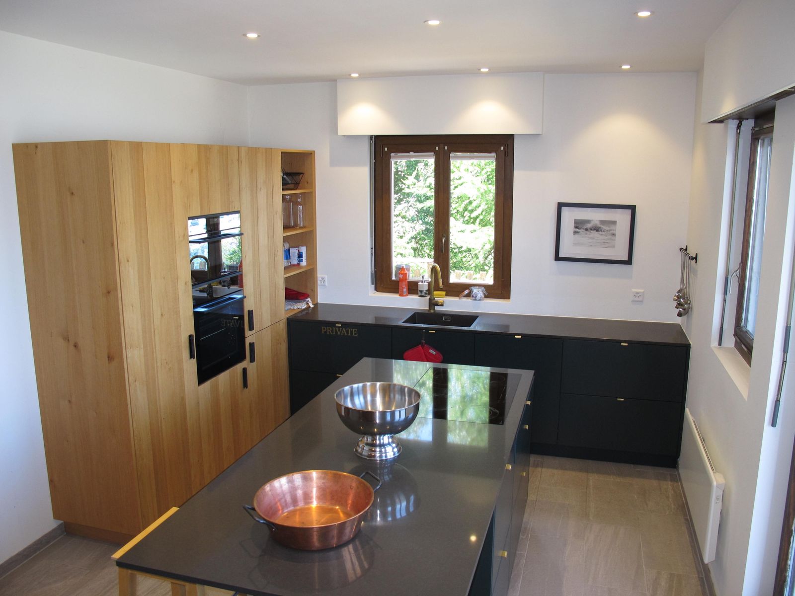 - Küche mit Kochinsel und großem Esstisch mit Stühlen