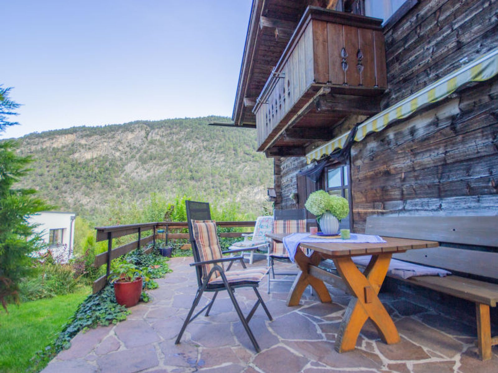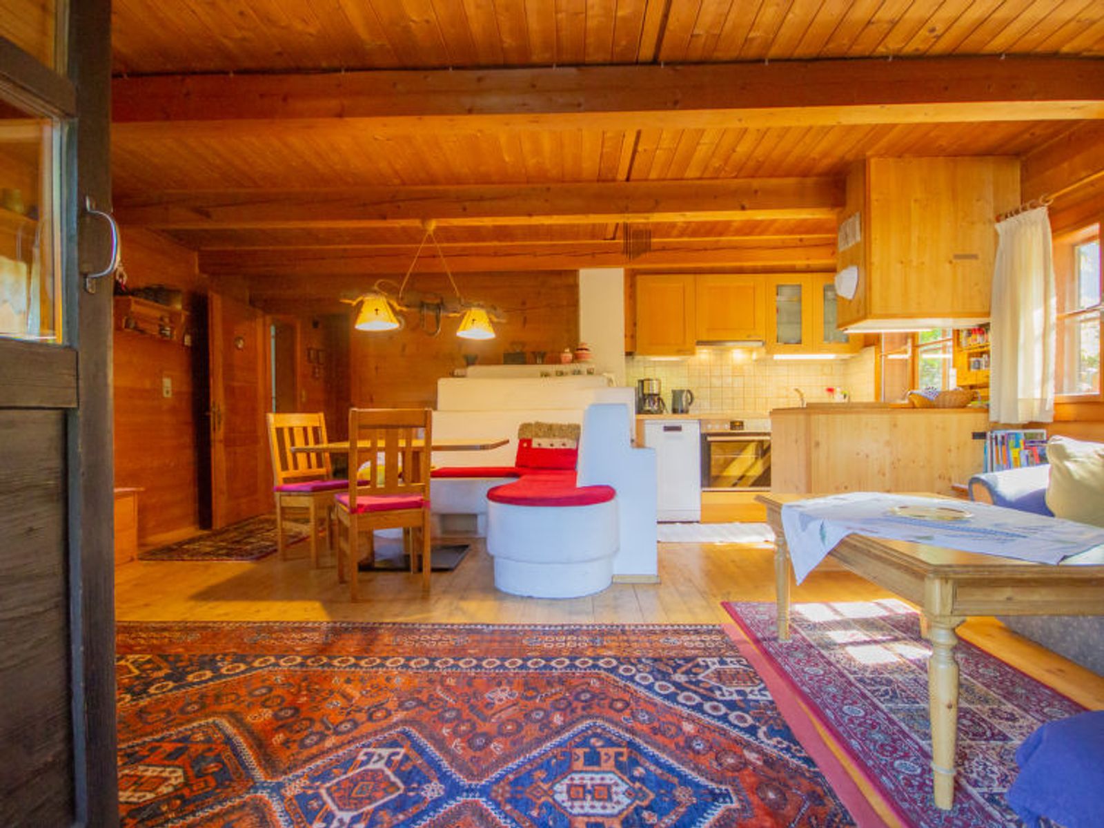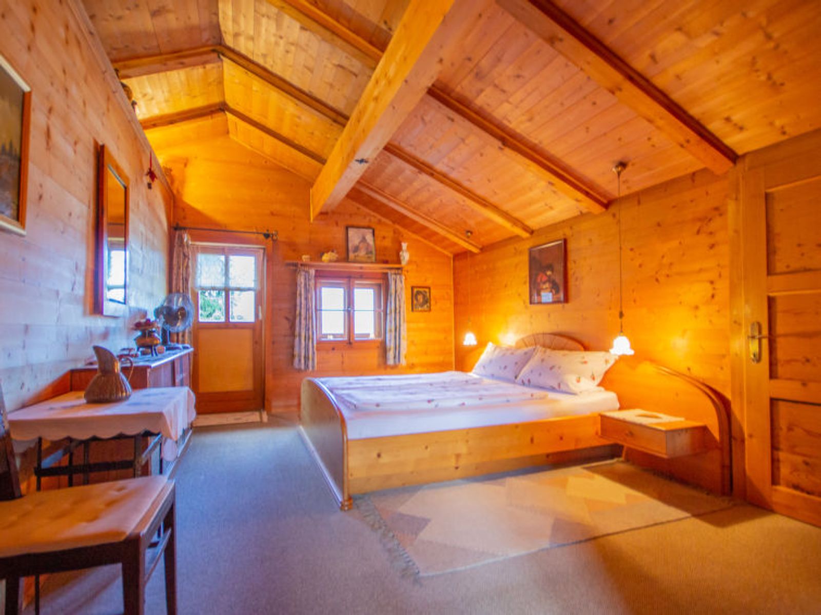 3-Zimmer-Chalet 100 m2 auf 2 Stockwerken. Teilweise abgeschrägt, geschmackvoll und gemütlich eingerichtet: Wohn-/Esszimmer mit 1 Doppeldiwanbett, Sat-TV, Radio und Kachelofen. Offene Küche (4 Kochplatten, Backofen, Geschirrspüler). Dusche/WC. E-Heizung. Obergeschoss: 1 Doppelzimmer. Ausgang zum Balkon. 1 Zimmer mit 2 Betten. Bad/WC. E-Heizung. Balkon, Terrasse. Terrassenmöbel, Gartengrill. Schöne Sicht auf die Berge. Zur Verfügung: Waschmaschine, Sauna, Babybett, Haartrockner. Internet (WLAN, gratis). Bitte beachten: Maximal 2 Haustiere/Hunde erlaubt. Rauchmelder.