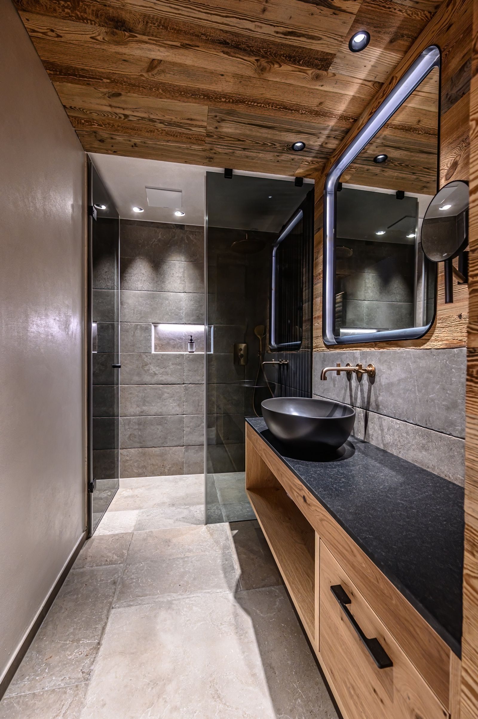 - Badezimmer mit Regendusche und großer Badewanne mit Liegebereich