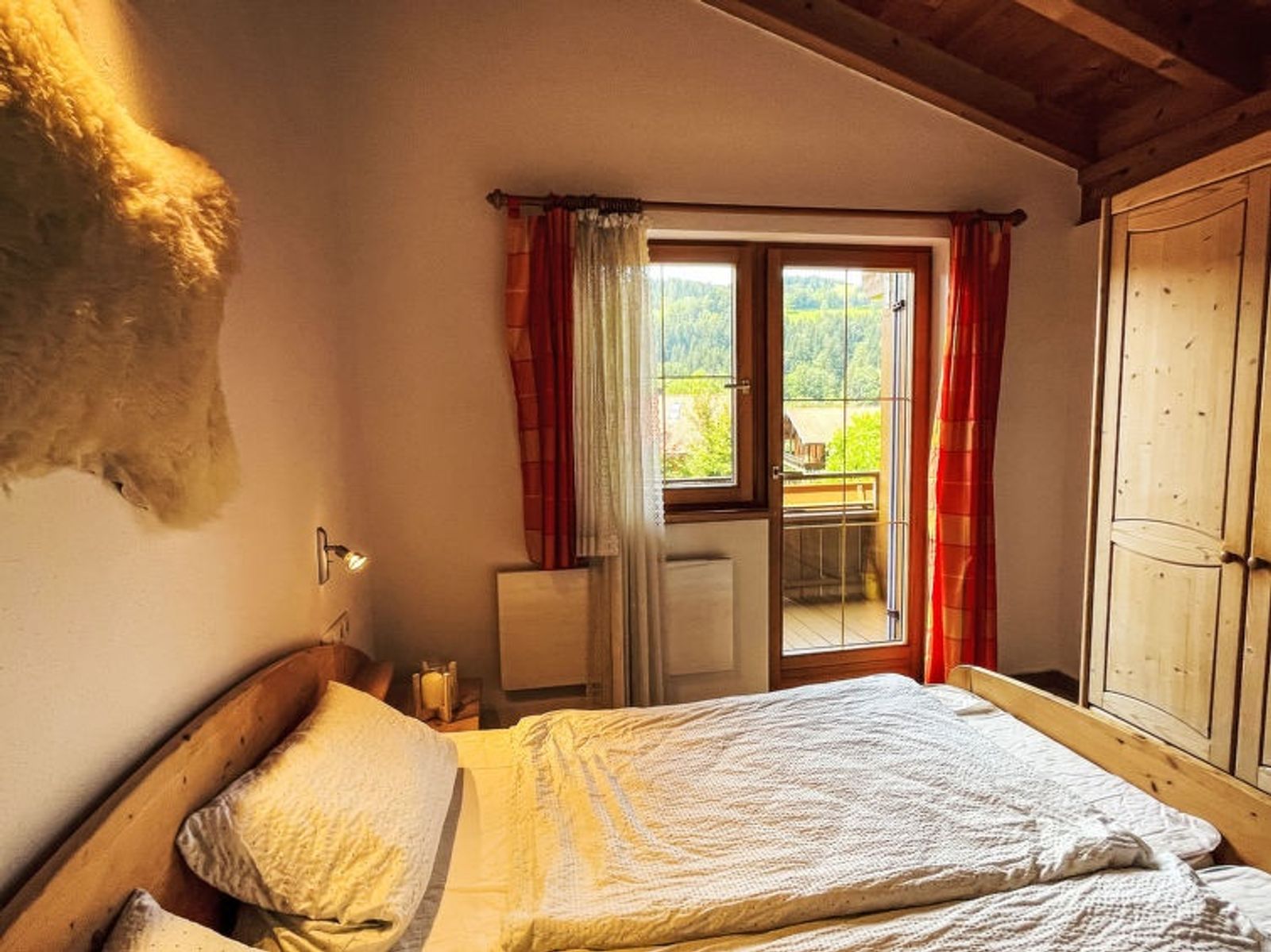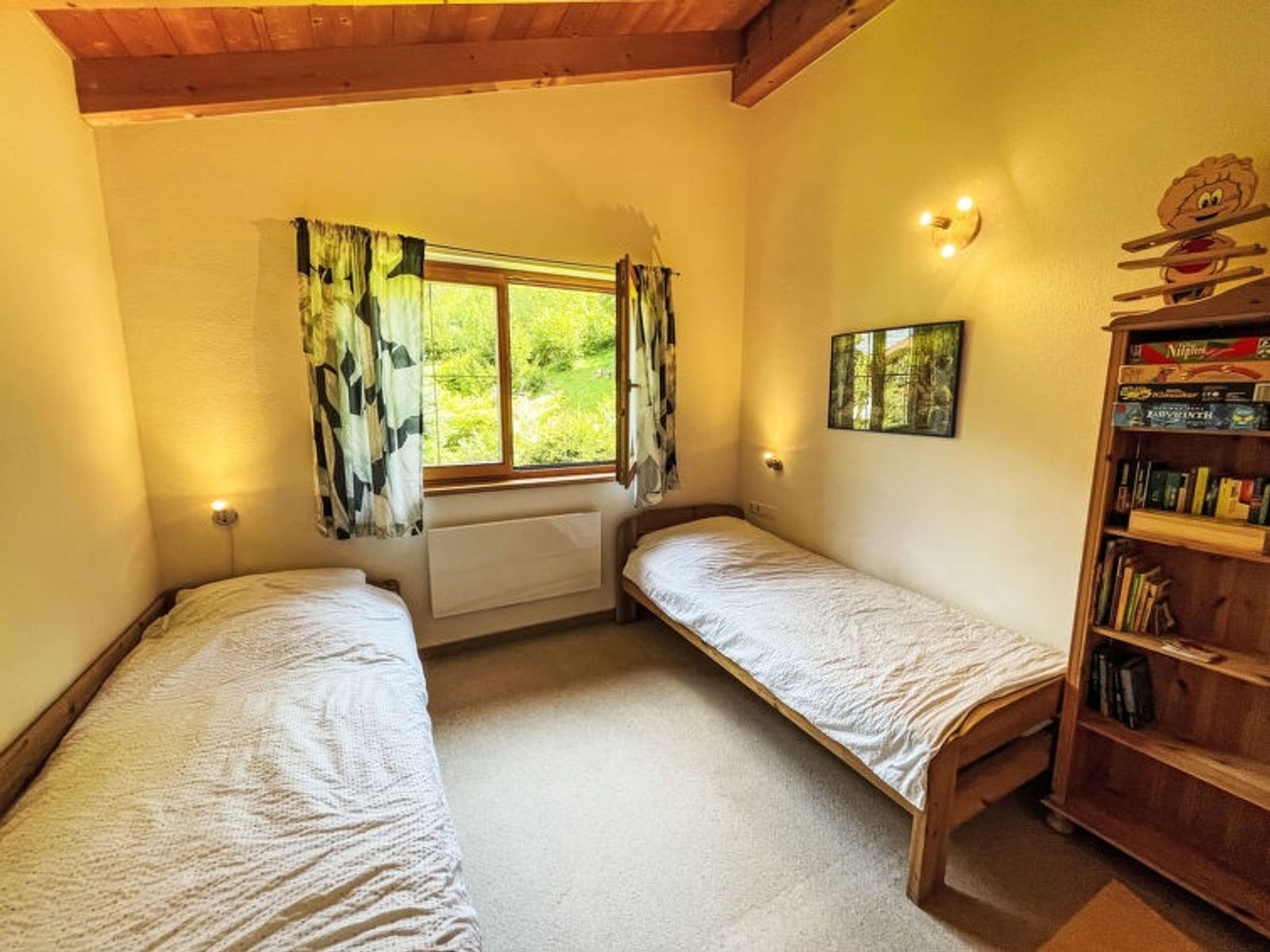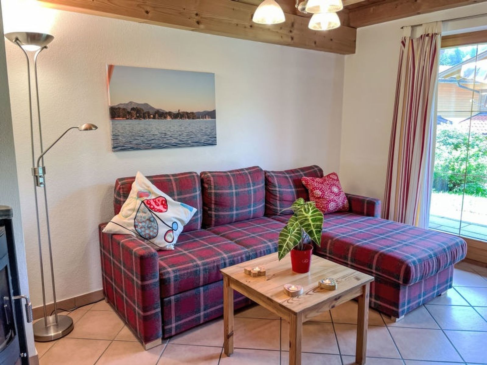"Chalet Chiemsee", 3-Zimmer-Doppelhaushälfte 75 m2 auf 2 Stockwerken. Hell, gemütlich und mit viel Holz eingerichtet: Wohn-/Schlafzimmer mit 1 Doppeldiwanbett, Schwedenofen, Esstisch, Sat-TV und CD. Ausgang zur Terrasse. Offene Küche (Backofen, Geschirrspüler, 4 Glaskeramikplatten, Toaster, Wasserkocher, Mikrowelle, elektrische Kaffeemaschine). Sep. WC. Dachgeschoss: (Wendeltreppe) 1 Zimmer mit 1 Doppelbett. Ausgang zum Balkon. 1 Zimmer mit 2 Betten und 1 Ausziehbett. Dusche/WC. E-Heizung. Balkon, 2 Terrassen. Terrassenmöbel, Balkonmöbel, Abstellkammer. Zur Verfügung: Kinderhochstuhl, Babybett. Parkplatz (1 Auto) in 30 m. Bitte beachten: Nichtraucher-Haus. Rauchmelder, Feuerlöscher.
