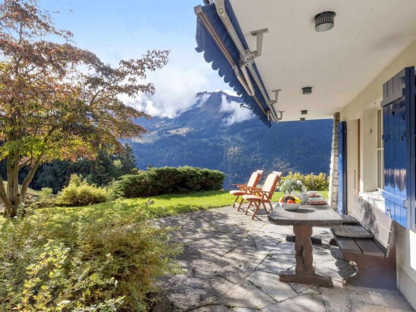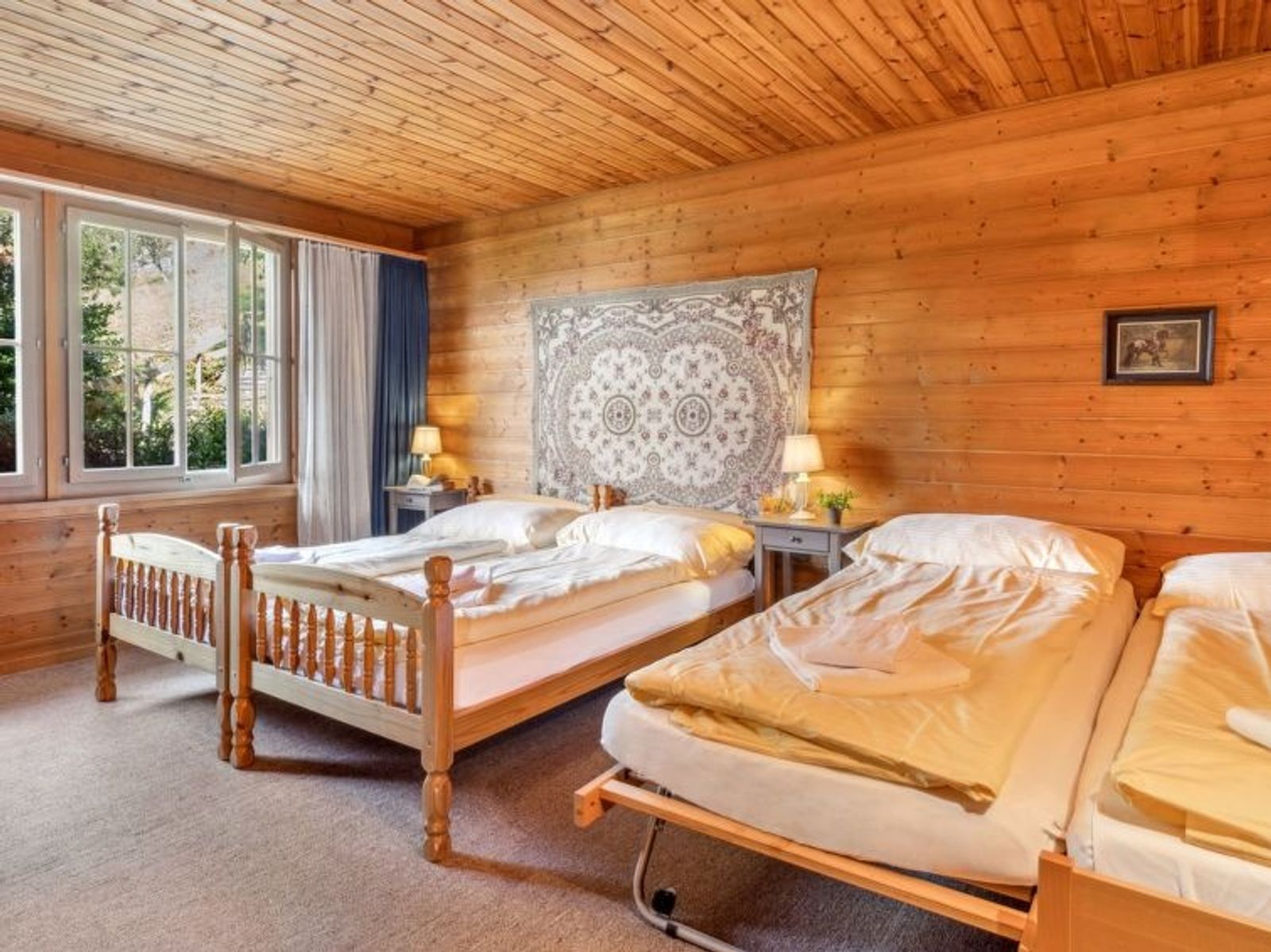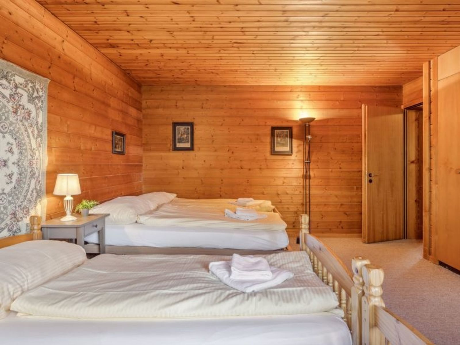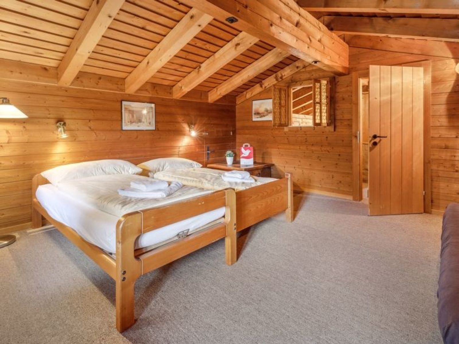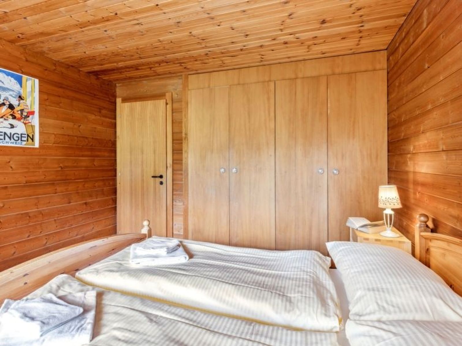 "Arche", 6-Zimmer-Chalet 246 m2 auf 3 Stockwerken. Geräumig, teilweise abgeschrägt, rustikal und gemütlich eingerichtet: 1 Zimmer mit 1 Doppelbett (1 x 160 cm, Länge 200 cm), Bad/Dusche/WC. Wohnküche (4 Kochplatten, Backofen, Geschirrspüler, Toaster, Wasserkocher, elektrische Kaffeemaschine, Kapseln für die Kaffeemaschine (Nespresso) extra, Fondue Set (Käse)). Obergeschoss: grosses Esszimmer mit Kabel-TV, Radio, CD und DVD. 1 Zimmer mit 1 Doppelbett (180 cm, Länge 200 cm). 1 Zimmer mit 4 Betten (90 cm, Länge 200 cm). 2 Bäder/Duschen/WC. Dachgeschoss: 1 abgeschrägtes Zimmer mit 2 Betten (90 cm, Länge 200 cm). Balkon, Terrasse. Terrassenmöbel. Herrliche Panoramasicht auf die Berge. Zur Verfügung: Waschmaschine, Bügeleisen, Haartrockner. Internet (Wireless LAN, gratis). Bitte beachten: Nichtraucher-Unterkunft.