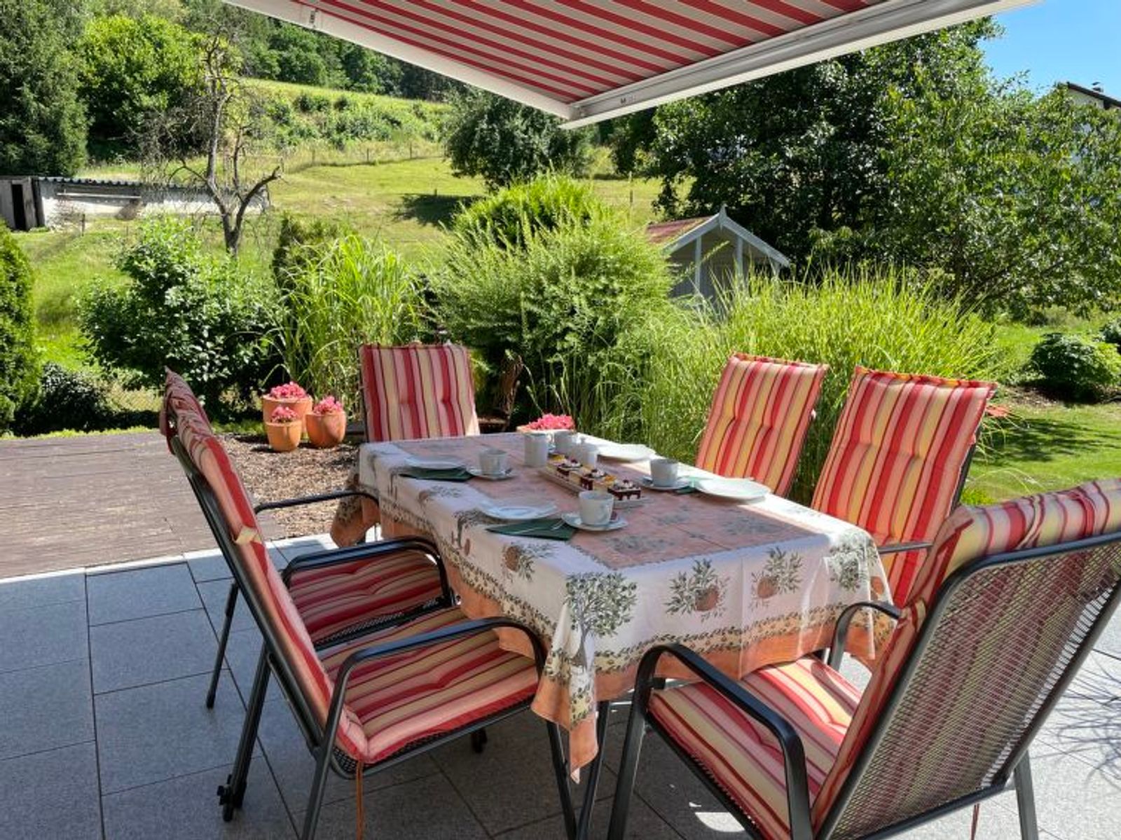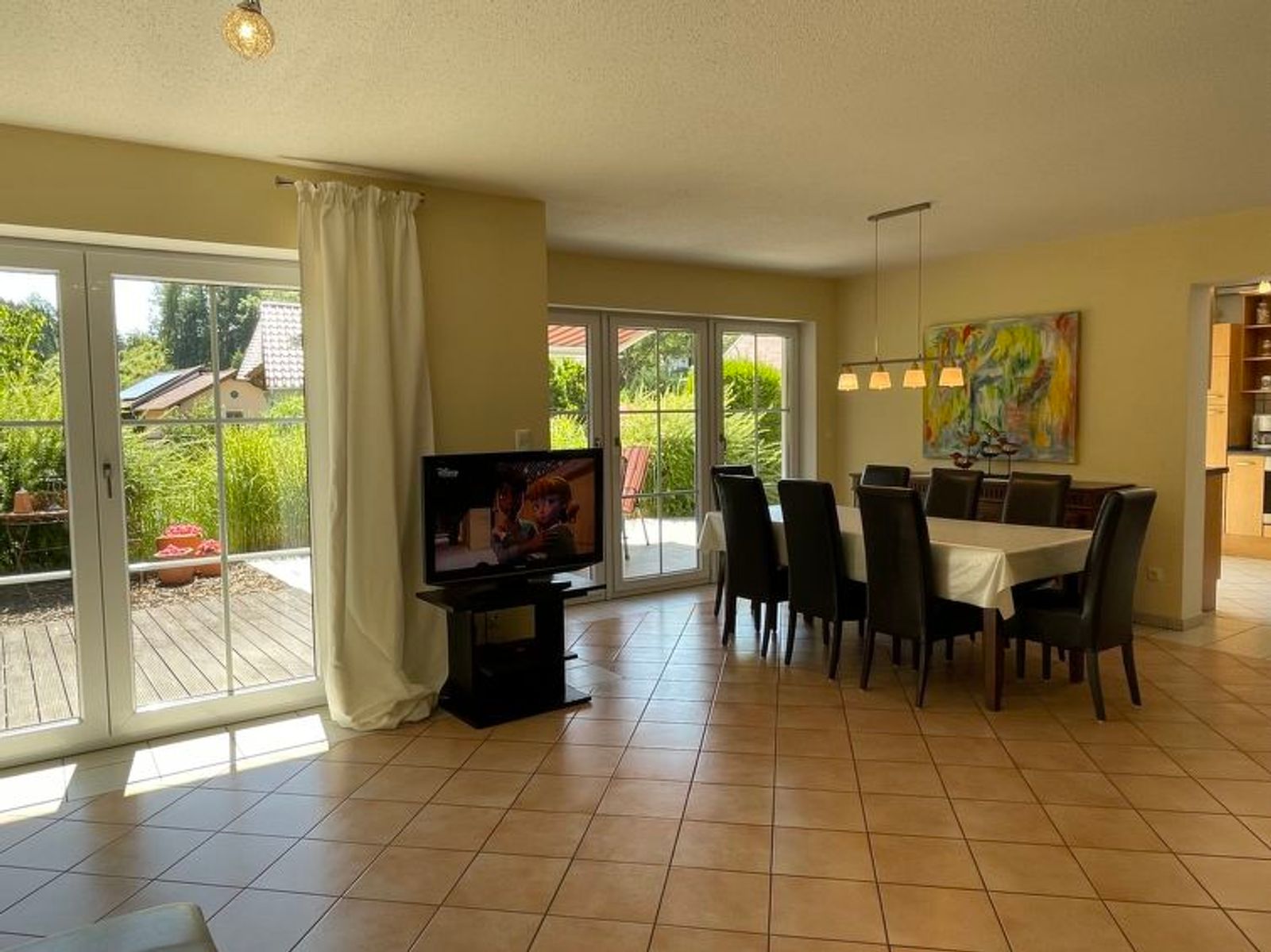 5-Zimmer-Haus 240 m2 auf 2 Stockwerken. Komfortabel und geschmackvoll eingerichtet: Wohn-/Esszimmer mit Schwedenofen (nur Deko), Esstisch und Sat-TV. Ausgang zur Terrasse. 1 Kinderzimmer mit 1 x 2 Etagenbetten. Offene Küche (Backofen, Geschirrspüler, 4 Glaskeramikplatten, Toaster, Wasserkocher, Mikrowelle, Tiefkühler, elektrische Kaffeemaschine). Dusche/WC. Obergeschoss: 3 Doppelzimmer. Sep. WC, Bad/Dusche/WC, Doppelwaschbecken. Fussbodenheizung. Natursteinboden. Terrasse, Gartensitzplatz. Terrassenmöbel, Gartengrill (mobil). Zur Verfügung: Kinderhochstuhl, Babybett. Internet (WLAN, gratis). Bitte beachten: Nichtraucher-Haus. Rauchmelder, Feuerlöscher.