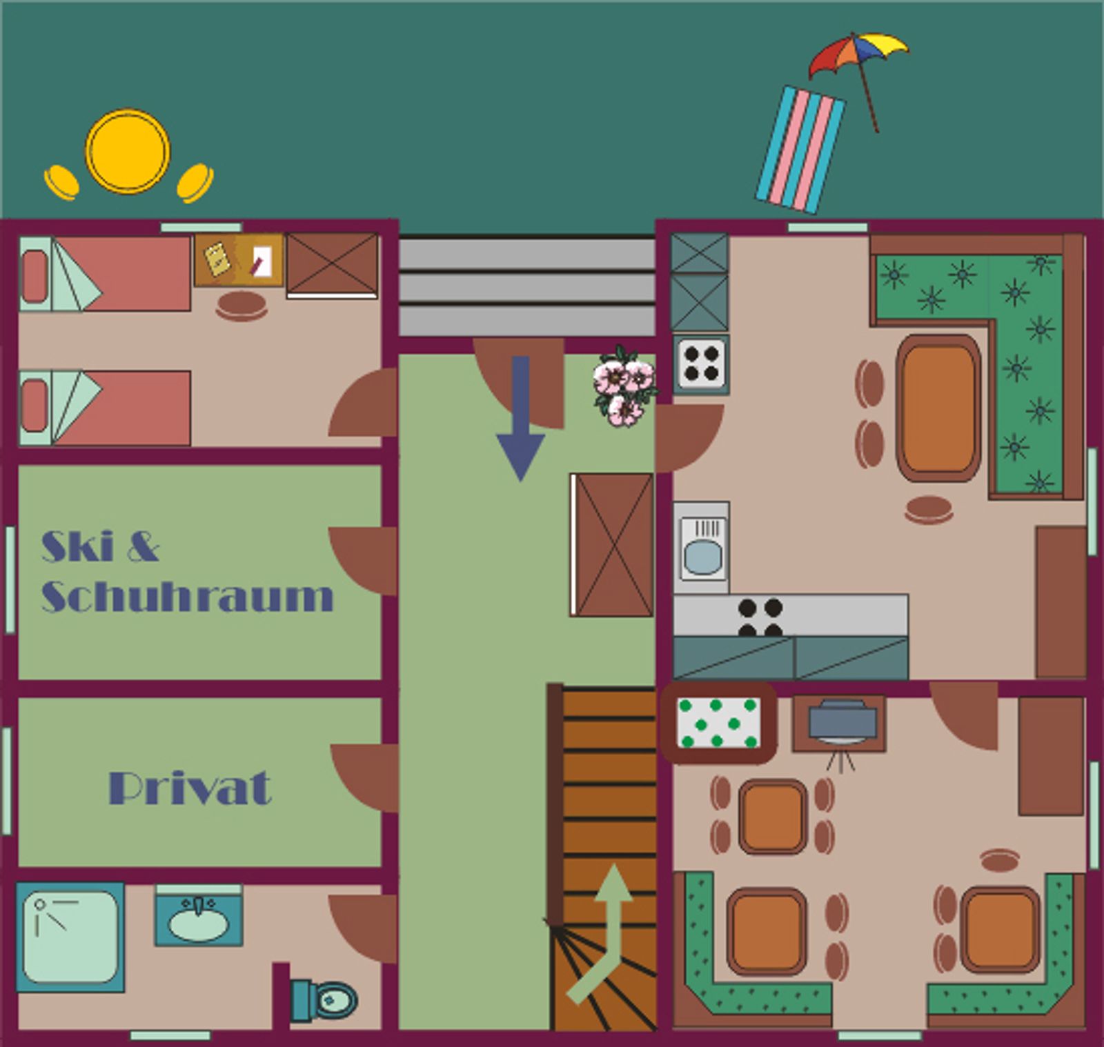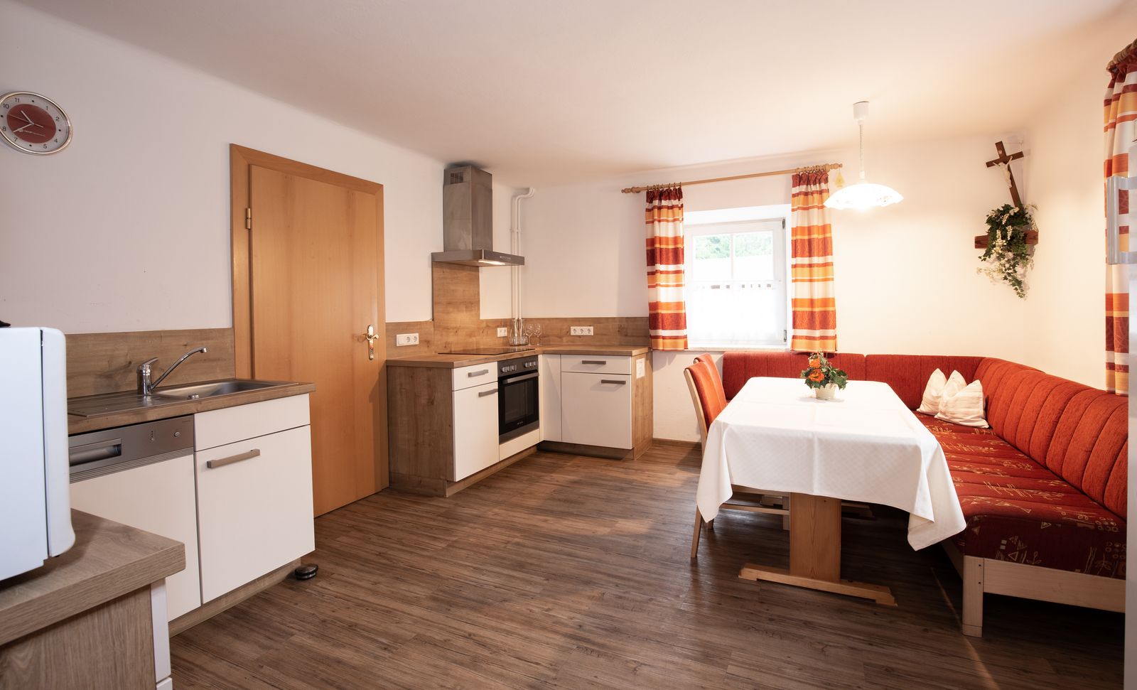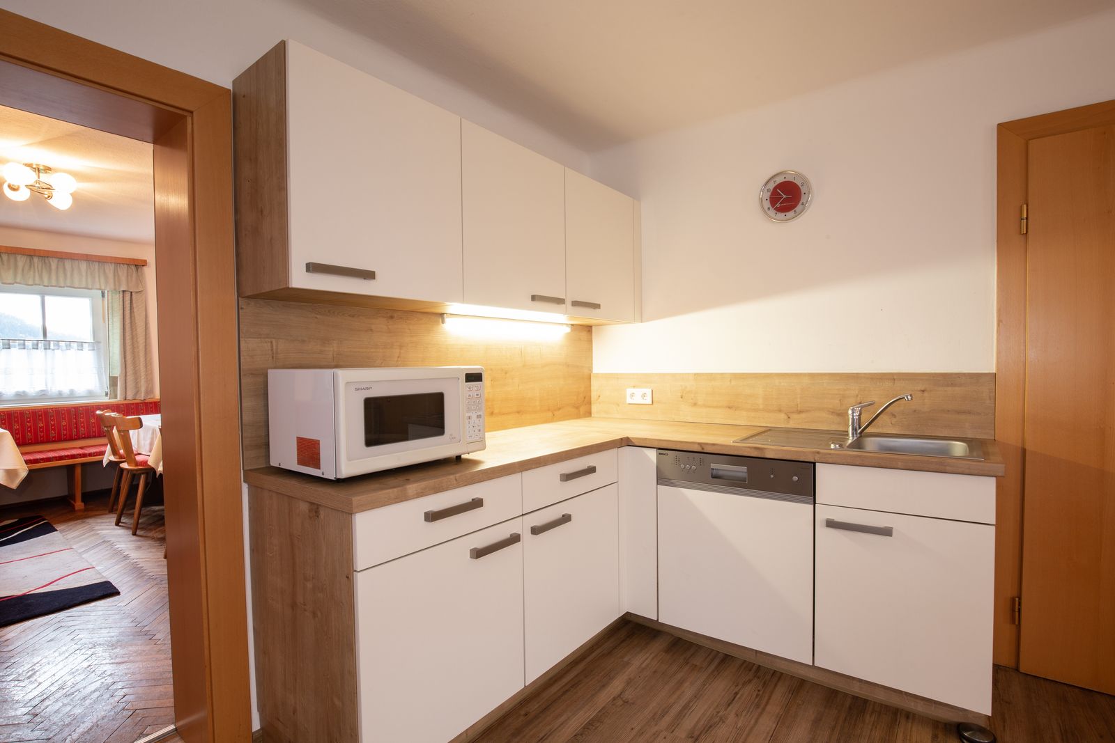 - Küche: E-Herd und Backofen, Kühlschrank mit Gefrierfach, Geschirrspüler, Mikrowelle, Kaffeemaschine, Wasserkocher und Essecke