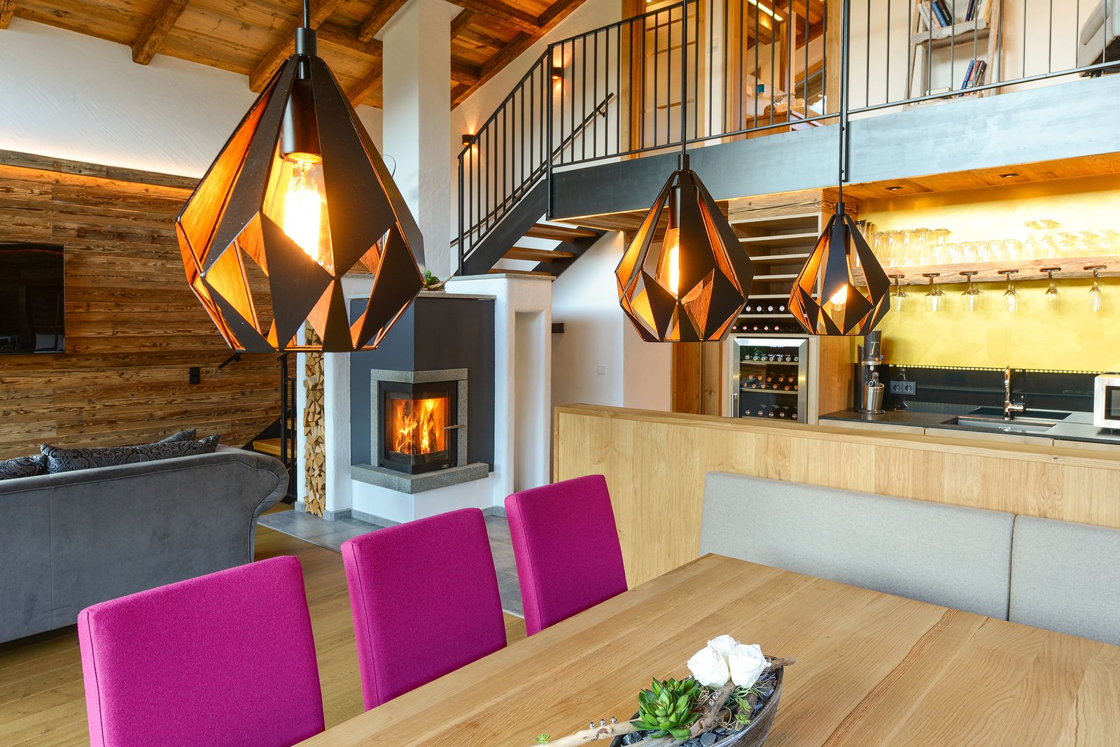 - großzügiger Wohnraum mit Sitz Lounge, Panorama-Flächenfenster und Kamin mit Echtfeuer