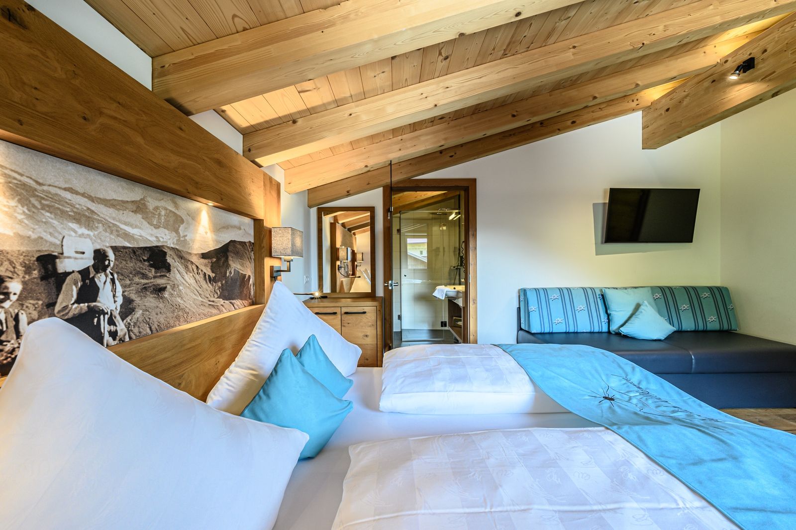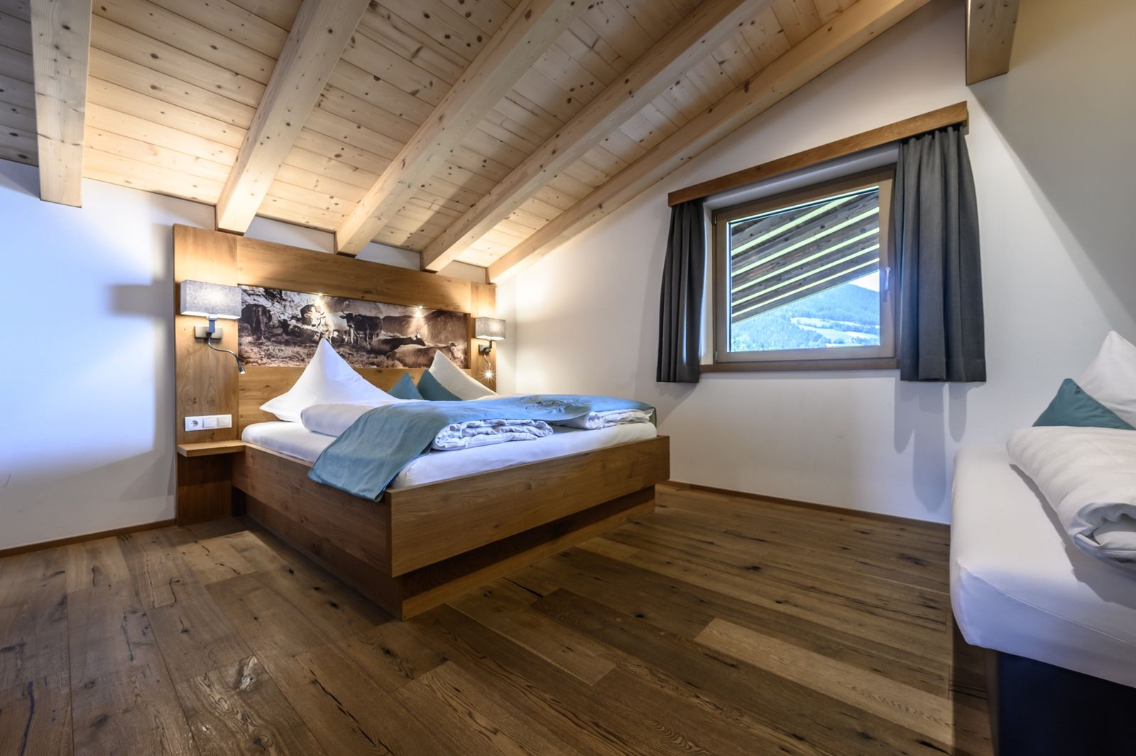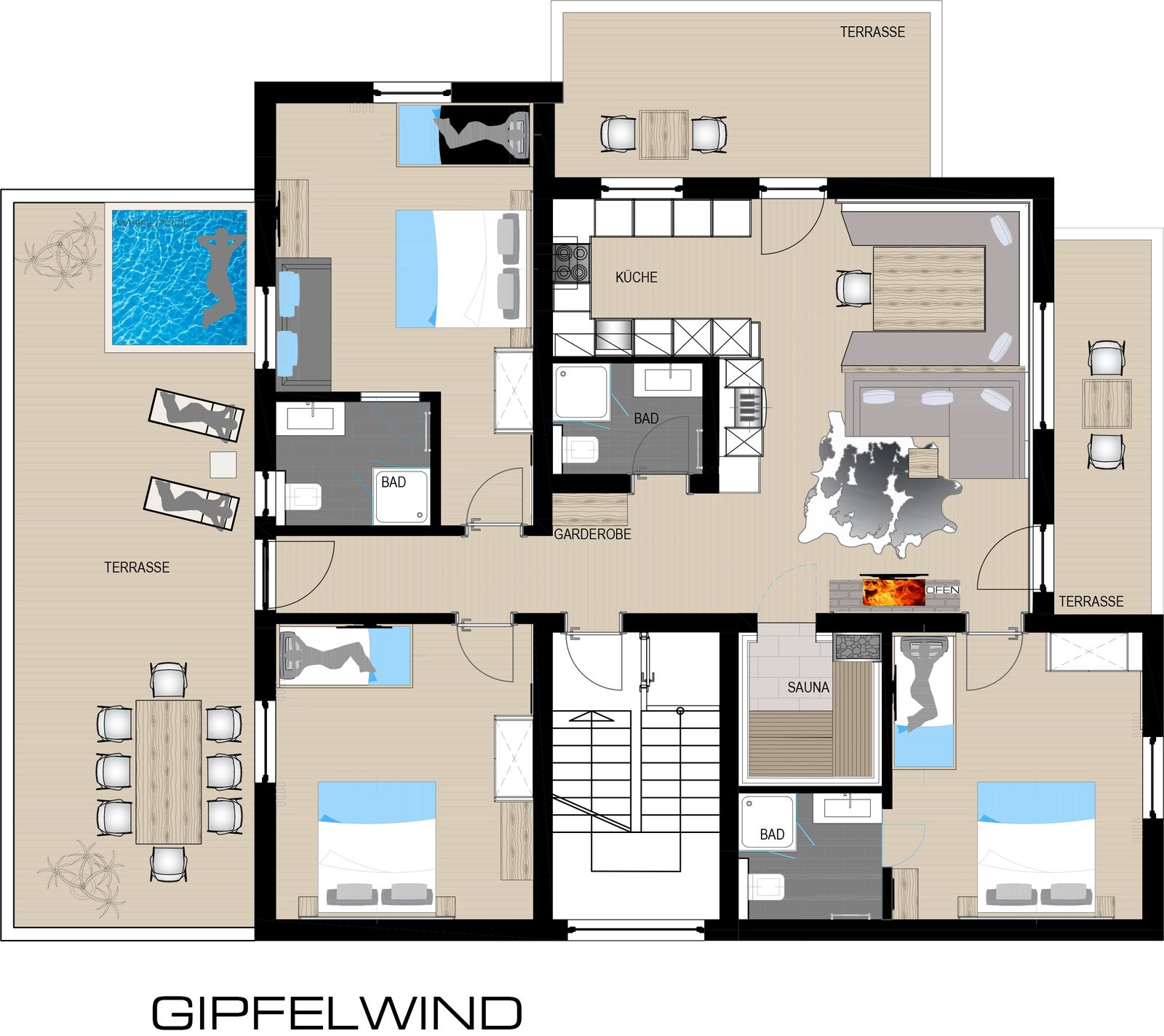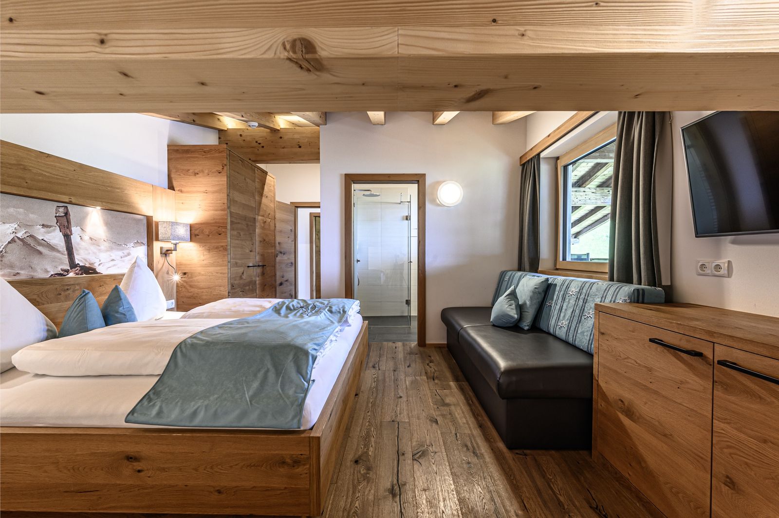 - Gipfelwind: 2 Schlafzimmer mit Doppelbett und hochwertiger Schlafcouch; 1 Schlafzimmer mit Doppelbett, Einzelbett und hochwertiger Schlafcouch