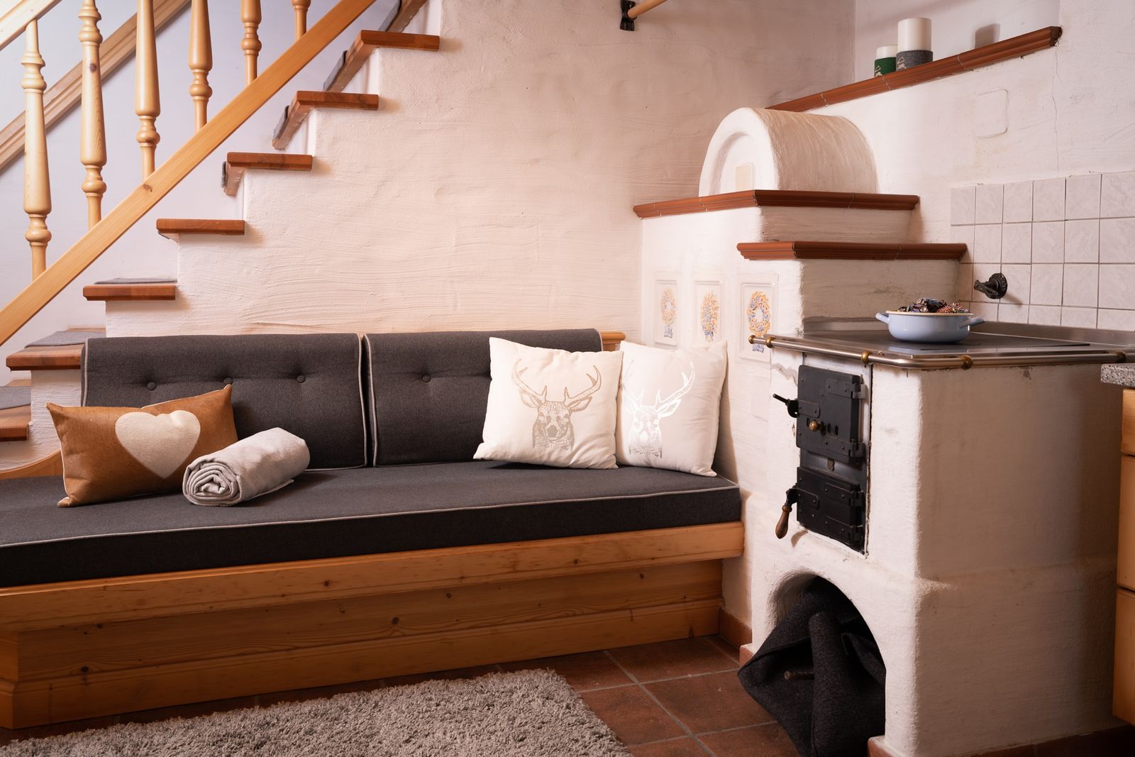- Wohnküche mit gemütlicher Essecke und Kachelofen