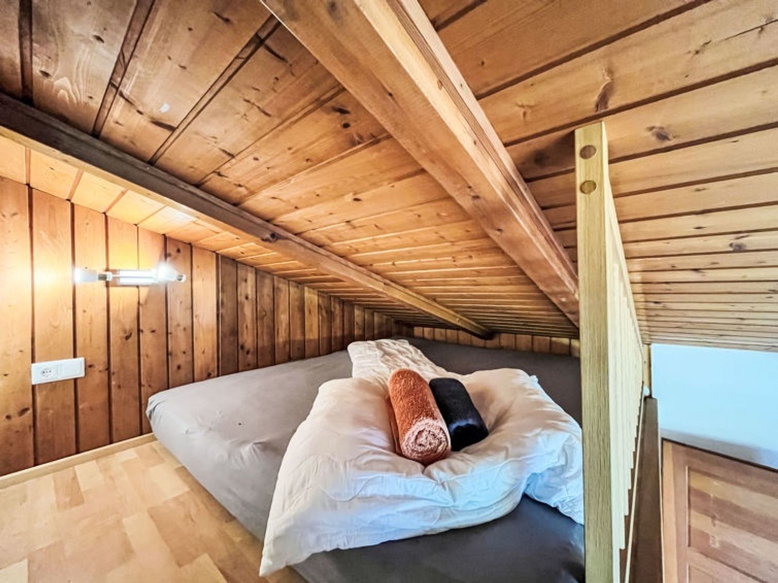 "Häuschen am Waldrand", 1-Zimmer-Bungalow 55 m2. Objekt geeignet für 2 Erwachsene + 2 Kinder. Zweckmässig und gemütlich eingerichtet: Wohn-/Schlafzimmer mit 1 Doppeldiwanbett und Esstisch. Ausgang zum Garten, zur Terrasse. Abgeschrägte, offene kleine Galerie mit 1 Schlafmöglichkeit (1 x 180 cm, Länge 200 cm). Kleine Kochnische (2 Kochplatten, Backofen, Toaster, Wasserkocher, elektrische Kaffeemaschine). Dusche/WC. E-Heizung. Parkettboden. Terrasse. Terrassenmöbel, Gartengrill. Sehr schöne Panoramasicht auf den See. Zur Verfügung: Babybett bis 2 Jahre. Internet (WLAN, gratis). Bitte beachten: Nichtraucher-Haus. Maximal 2 Haustiere/Hunde erlaubt. Anstelle eines abgeschlossenen Schlafzimmers befinden sich manche Schlafplätze in einem offenen Bereich (Galerie, Nische etc.).