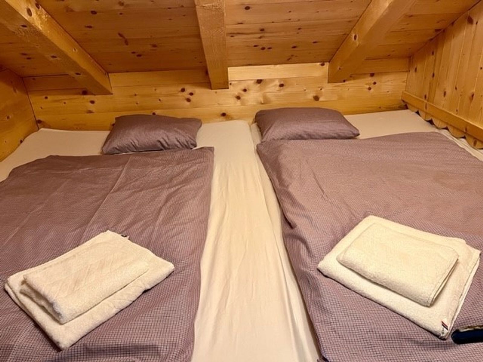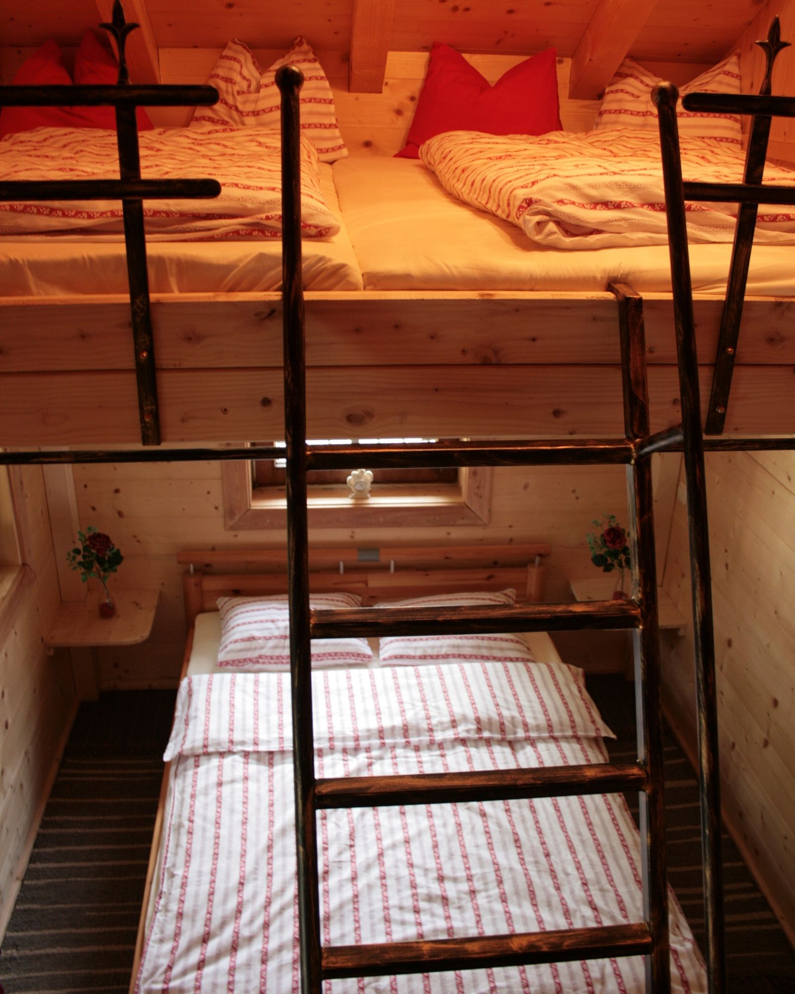 - 1 Schlafzimmer mit Doppelbett und einem Hochbett (über eine Leiter erreichbar) unter dem Dachgiebel für bis zu 4 Kinder