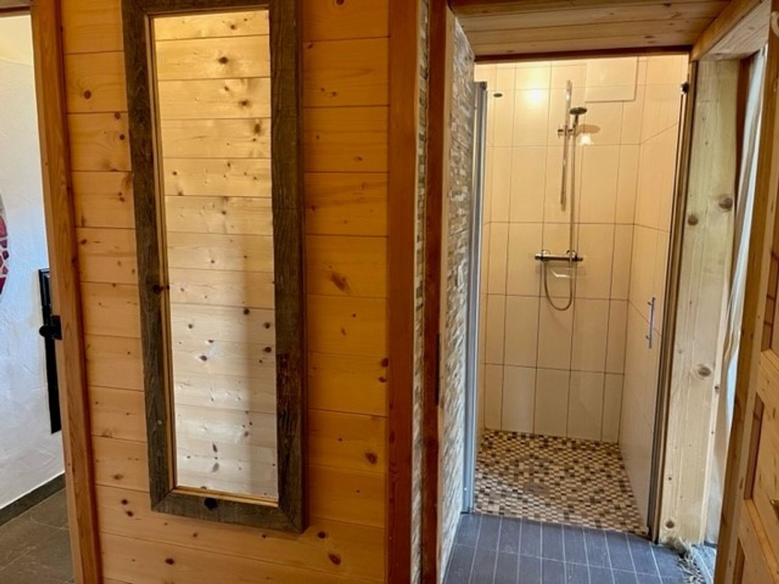 - 1 Badezimmer mit Dusche, Waschbecken und WC