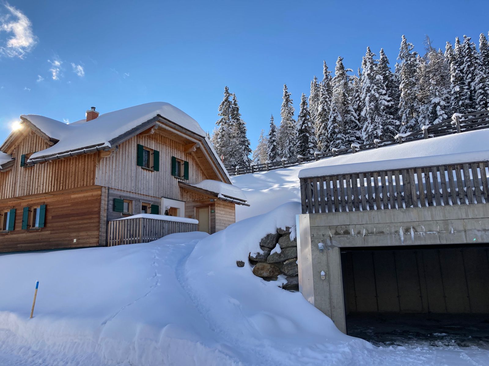 Die gemütliche und modern ausgestattete Hütte Hüttenzauber Lachtal befindet sich in ruhiger und sonniger Lage auf einer Seehöhe von 1.700 Metern mitten im wunderschönen Familienskigebiet Lachtal in der Steiermark. Genießen Sie von der Terrasse mit ganztags Sonne einen herrlichen Ausblick ins Tal. Sie können direkt von der Hütte mit den Skiern bis zum Lift fahren. Zur Ausstattung gehören zwei Garagenstellplätze, eine Sauna und ein Skistall. Zum Grundstück gehört eine große Wiese, dort können Sie im Winter Schneemänner bauen und die Wiese im Sommer als Grillplatz nutzen. Wenn Sie einmal nicht selbst kochen möchten, befindet in nur 5 Minuten Fußweg entfernt die bewirtschaftete Hütte "Grossa Alm" mit köstlichen regionalen Speisen. Auch weitere Restaurants sind zu Fuß erreichbar. Ein kleines Lebensmittelgeschäft befindet sich direkt an der Talstation vom Sessellift. Der nächstgelegene größere Ort Oberzeiring liegt 15 km entfernt und bietet weitere Einkaufsmöglichkeiten.