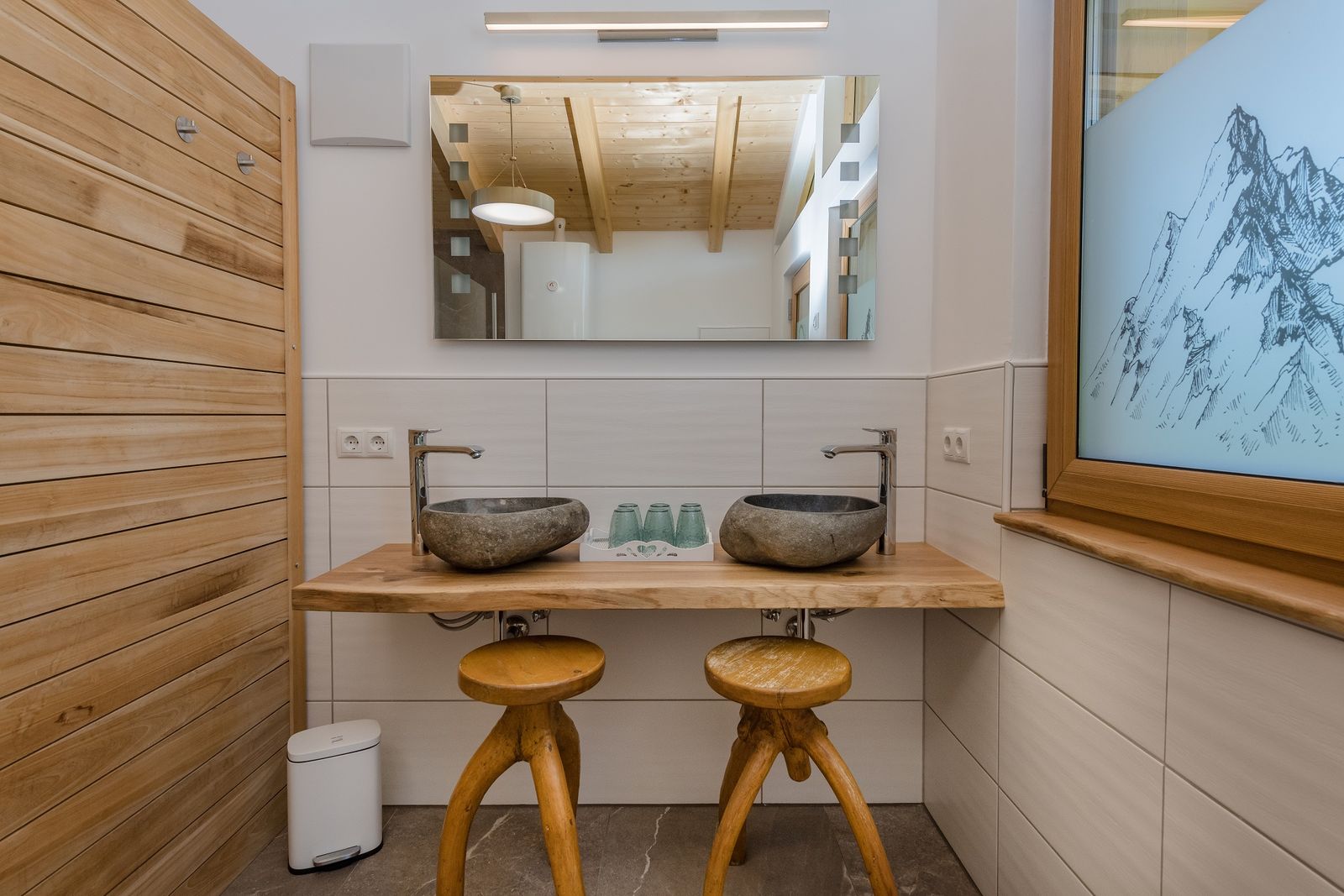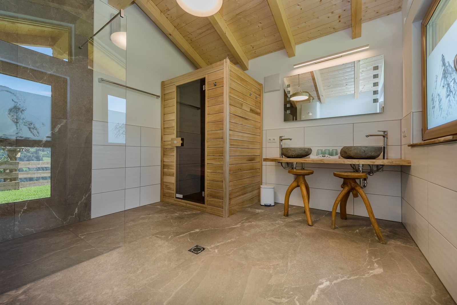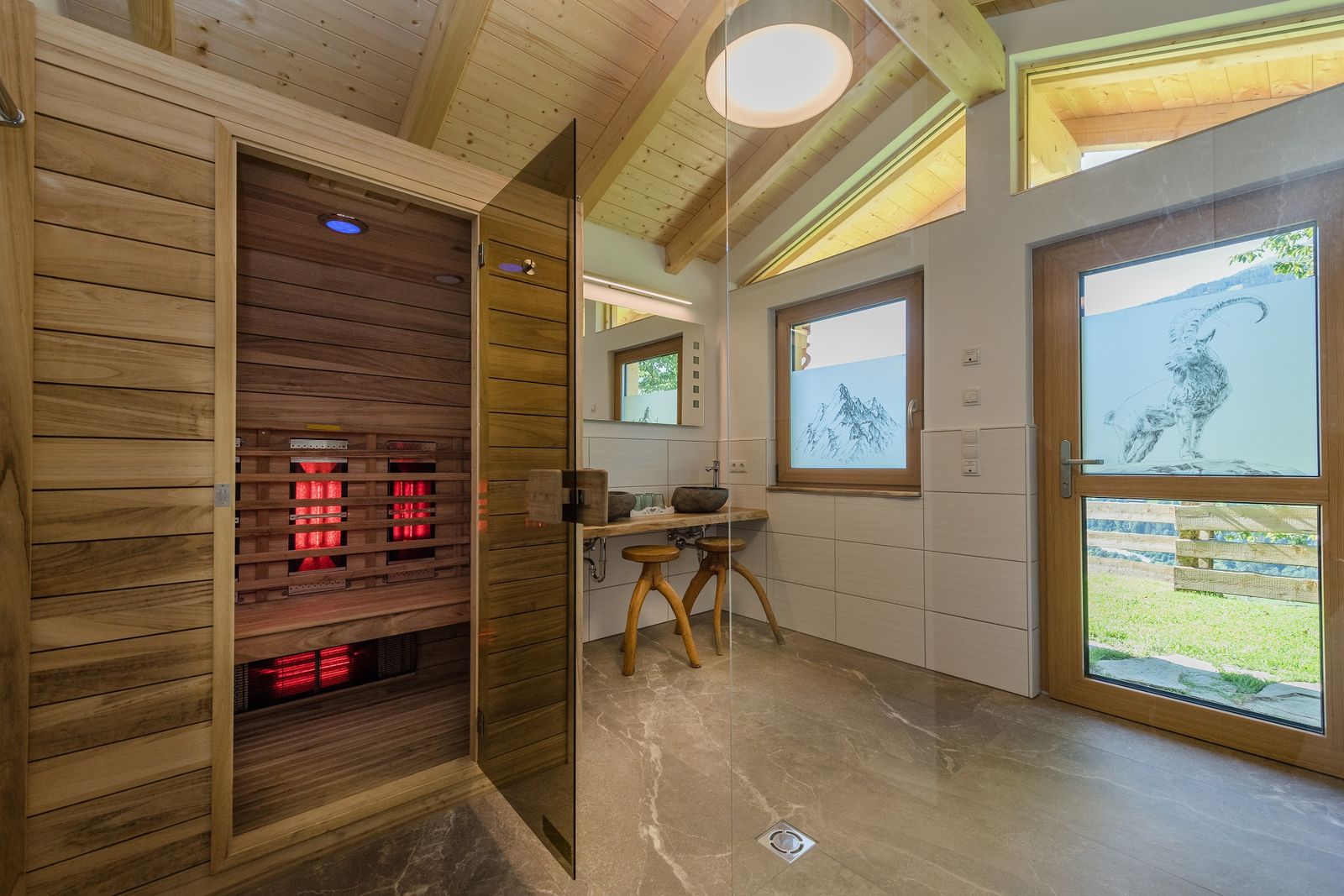- Badezimmer mit Fußbodenheizung, Regendusche, Doppelwaschbecken und einer Infrarotkabine im Nebengebäude/Wellnesshütte
