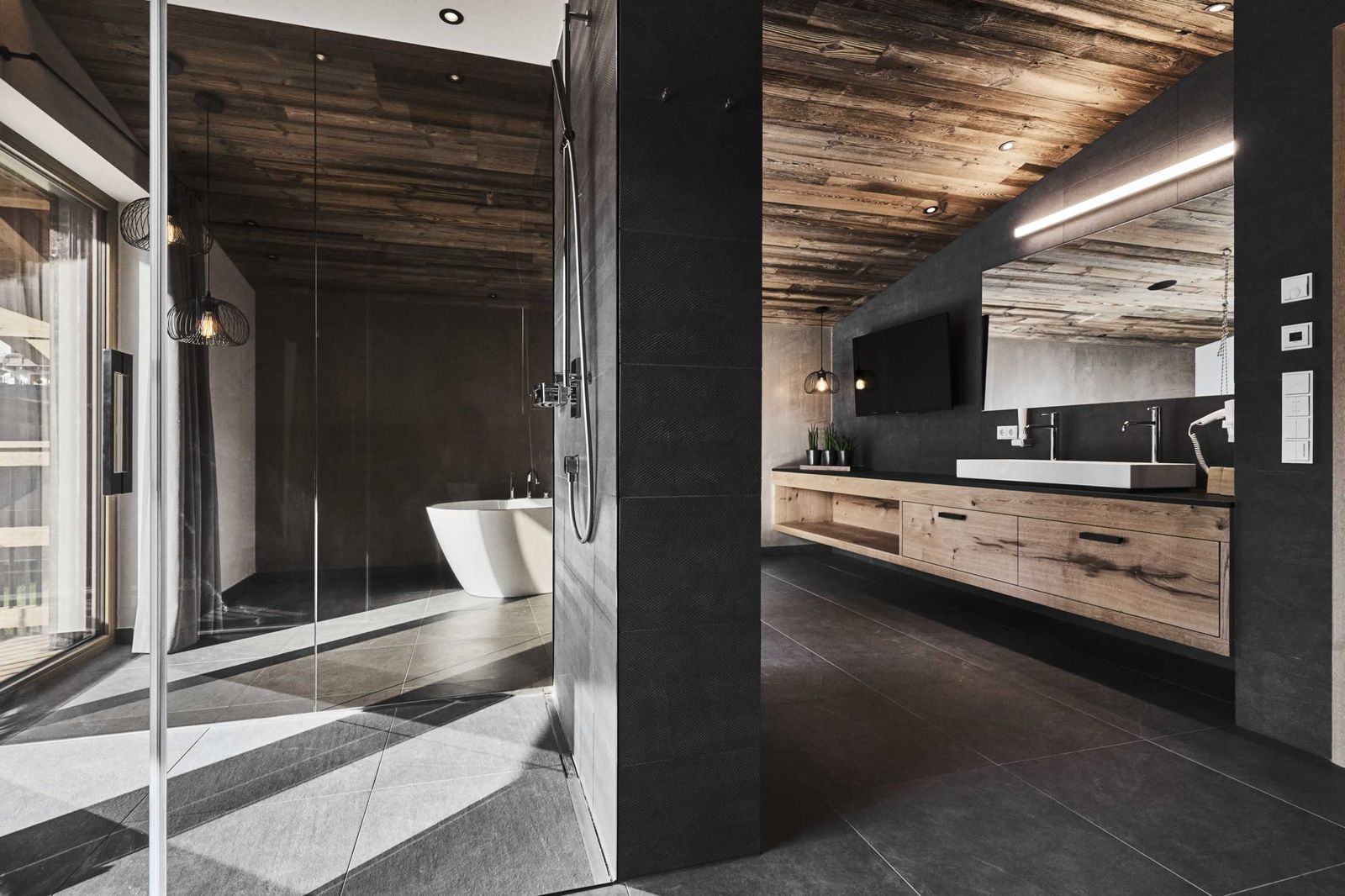 - Badezimmer mit Regendusche, WC, großer Badewanne mit Liegebereich, Kosmetikspiegel und Föhn