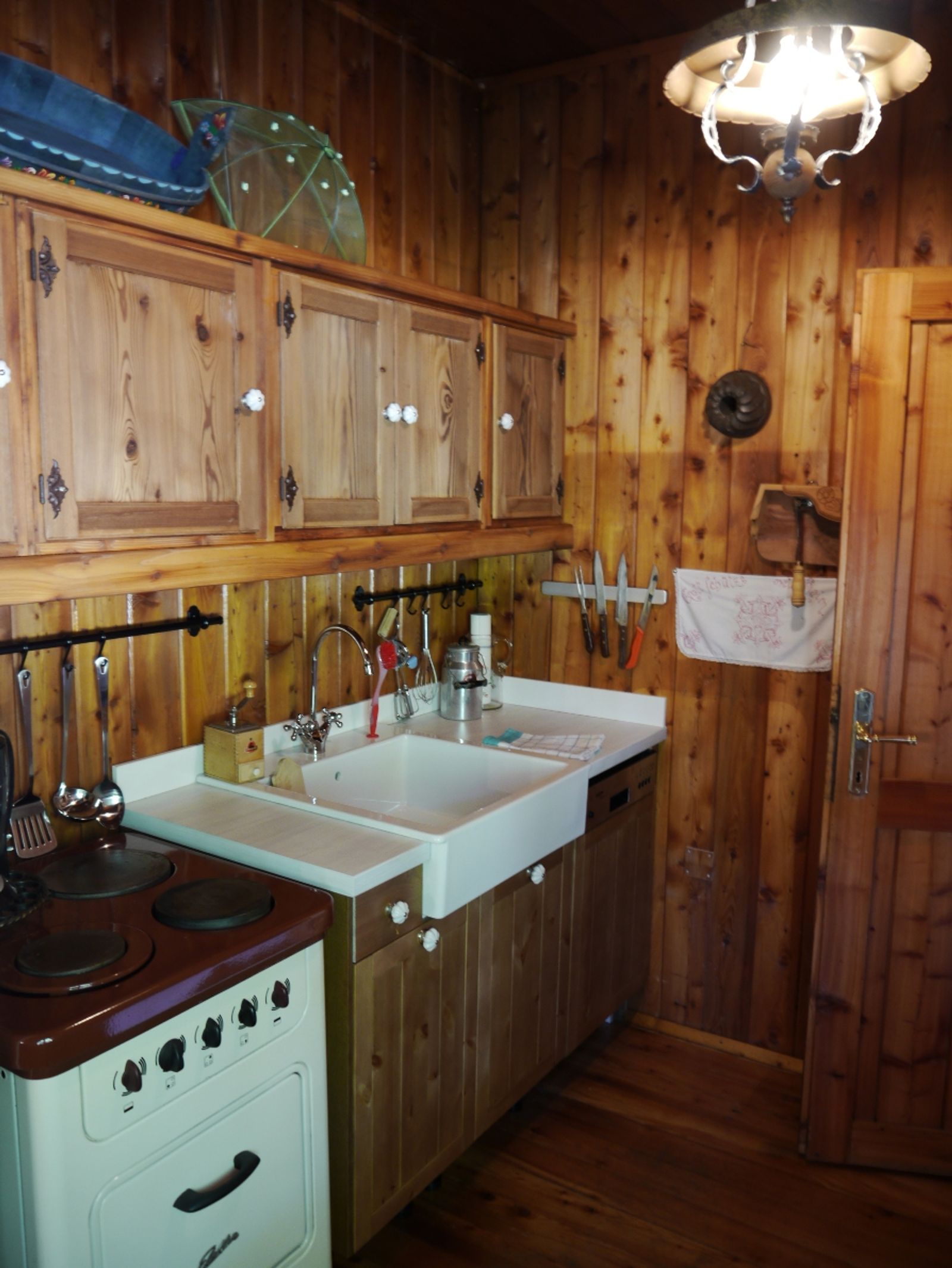 - Wohnküche mit Backofen, Elektroherd, elektrische Grillplatte, Fondueset, Kaffeemaschine, Kühlschrank mit Gefrierfach, Spülmaschine, Wasserkocher und Wok