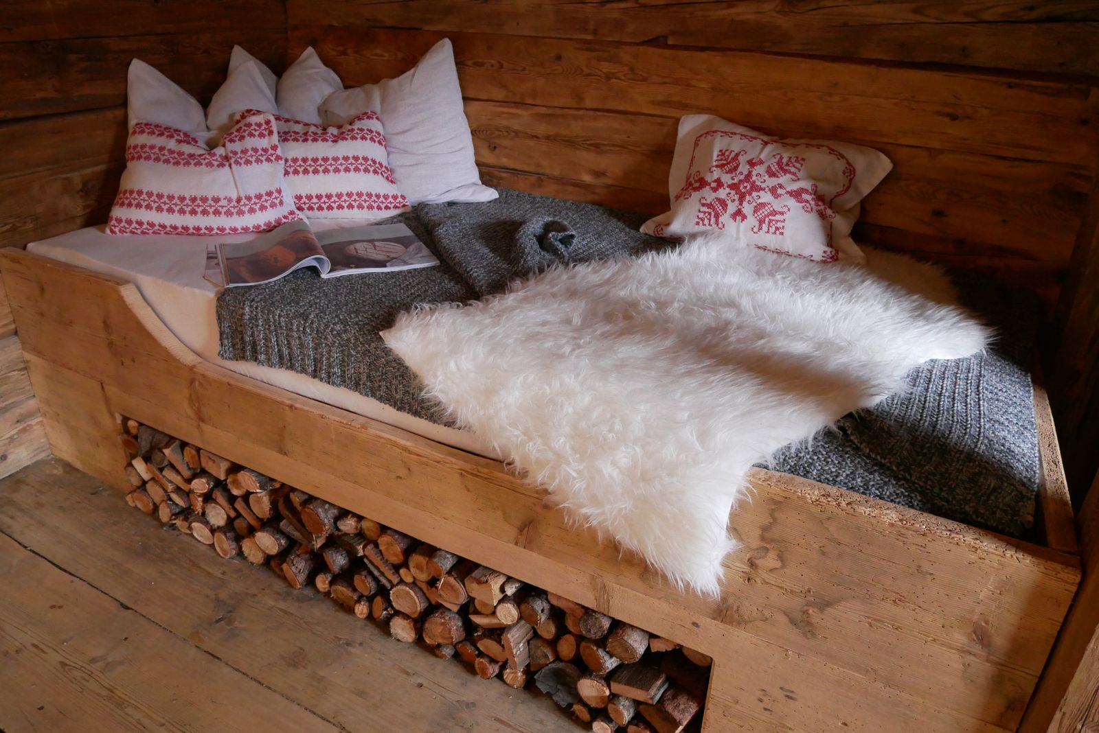 - Wohnraum mit Kochzeile: Holzherd mit Backofen, kleiner Gaskocher, Kühlschrank mit Gefrierfach