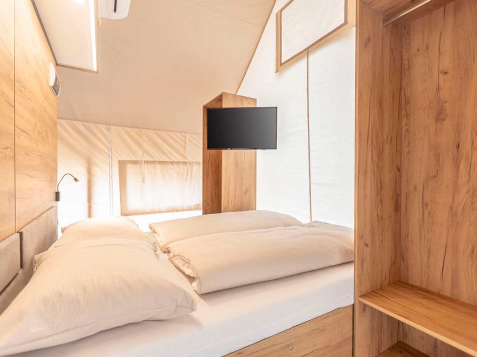 "Luxuszelt Safari für 4 Personen", 2-Zimmer-Mobilheim 31 m2 auf 2 Stockwerken. Hell, gemütlich eingerichtet: Wohn-/Schlafzimmer mit 1 Doppeldiwanbett, Esstisch, Sat-TV und Flachbildschirm. Offene Küche (Geschirrspüler, 4 Glaskeramikplatten, Toaster, Tiefkühler, elektrische Kaffeemaschine). Dusche/WC. Keine Heizmöglichkeit. Obergeschoss: 1 Doppelzimmer. Terrasse. Terrassenmöbel. Sehr schöne Sicht auf die Berge und die Ortschaft. Zur Verfügung: Internet (Wireless LAN, gratis). Bitte beachten: Nichtraucher-Unterkunft. Beim Mietobjekt handelt es sich um ein Typenhaus bzw. Um eine Typenwohnung. ACHTUNG: Es handelt sich beim Objekt um ein Zelt! Klimaanlage vorhanden, es kann mit dieser auch minimal geheizt werden!