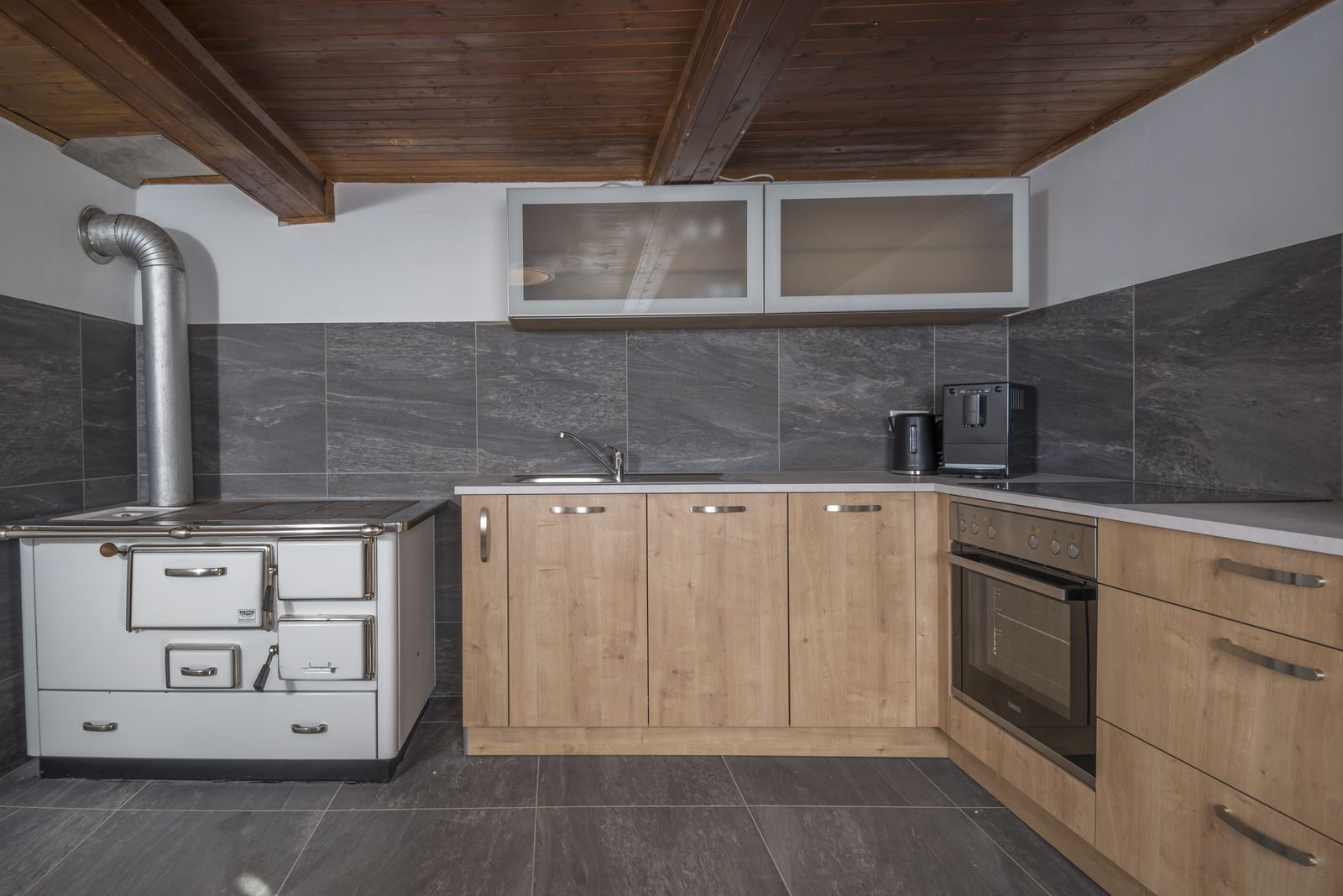 - Holzofenherd und Elektroherd, Backofen, Geschirrspüler, Kaffeevollautomat, Kühlschrank mit Gefrierfach, Wasserkocher und Toaster