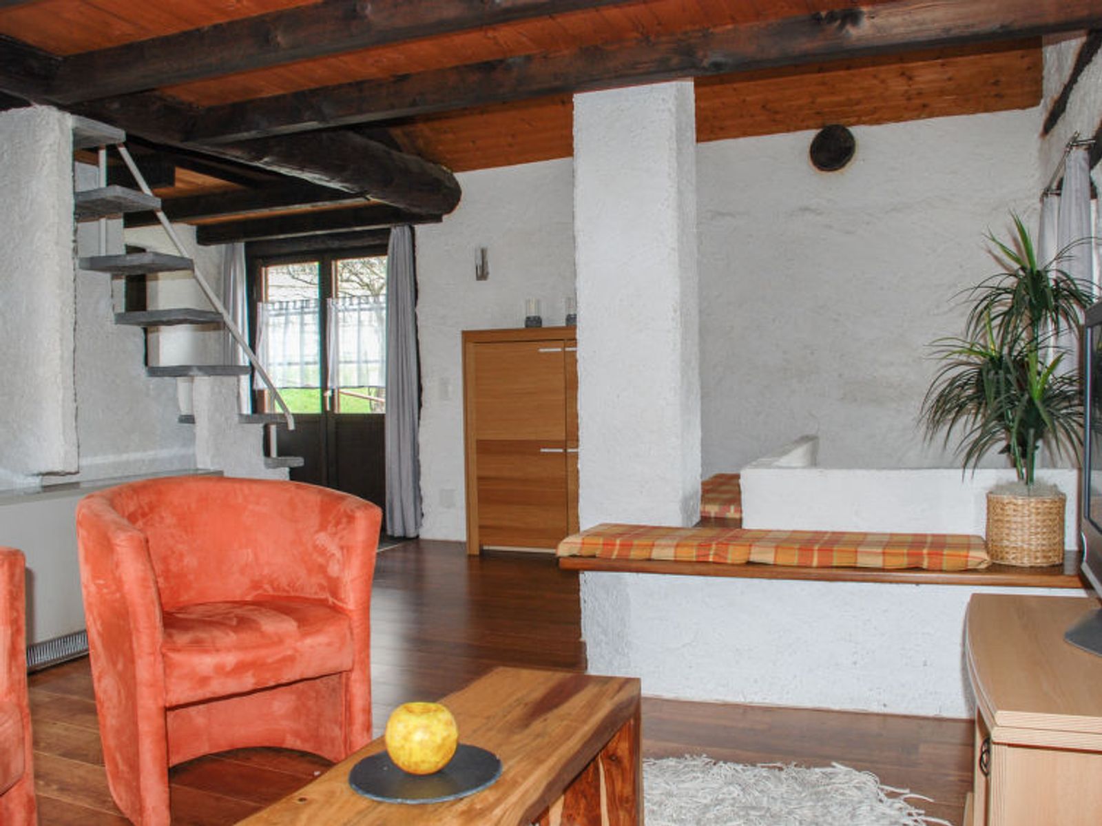 "Rustico Cristallo", 3-Zimmer-Haus auf 3 Stockwerken, Südlage. Hell, teilweise abgeschrägt, komfortabel und geschmackvoll eingerichtet: grosse Wohnküche (Backofen, 4 Glaskeramikplatten, elektrische Kaffeemaschine, Kapseln für die Kaffeemaschine (Caffitaly) extra, Racletteofen, Fondue Set (Käse)) mit offenem Kamin, Esstisch und Radio. Ausgang zum Gartensitzplatz. Dusche/WC. E-Heizung, Holzheizung. Obergeschoss: Wohnzimmer mit Sat-TV und Flachbildschirm. Ausgang zum Garten, zum Gartensitzplatz. 1 Doppelzimmer mit 1 Doppelbett (2 x 80 cm, Länge 200 cm). Ausgang zur Terrasse. 2. Obergeschoss: (steile Treppe) abgeschrägte, offene Galerie, Deckenhöhe 80 - 100 cm mit 2 Betten (90 cm, Länge 200 cm). Salon. Terrasse teilweise überdacht, Südlage, Gartensitzplatz. Terrassenmöbel, Gartengrill (mobil), Liegestühle (2), Sitzplatz. Schöne Panoramasicht auf die Berge, die Landschaft und die Ortschaft. Zur Verfügung: Kinderhochstuhl, Babybett bis 2 Jahre (extra), Haartrockner, Holz (extra). Internet (WLAN). Bitte beachten: nicht geeignet für Kinder unter 6 Jahren. Nichtraucher-Haus. Maximal 1 kleines Haustier/Hund erlaubt. Feuerlöscher. Achtung - Die Aufsicht der Kleinkinder ist wegen der geländerlosen Treppe und offenen Galerie sorgepflicht der Eltern und jede Haftung wird strikte abgelehnt! Anstelle eines abgeschlossenen Schlafzimmers befinden sich manche Schlafplätze in einem offenen Bereich (Galerie, Nische etc.). NL-00001822