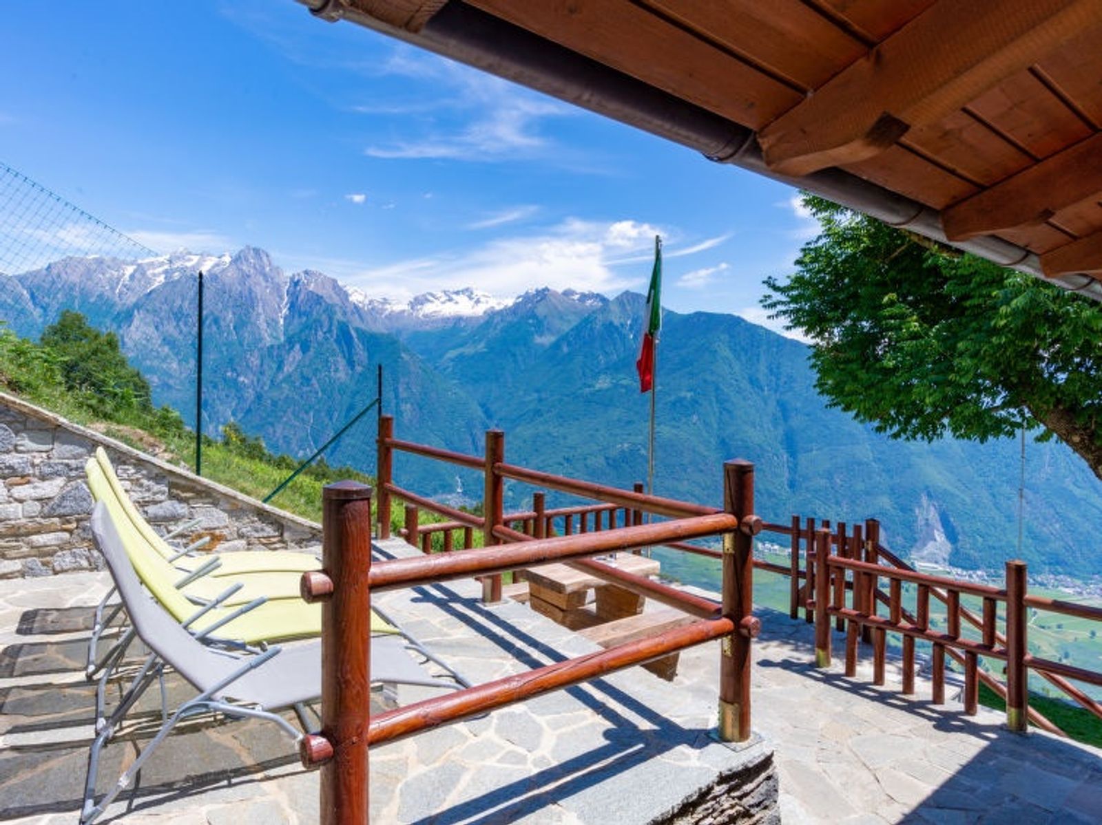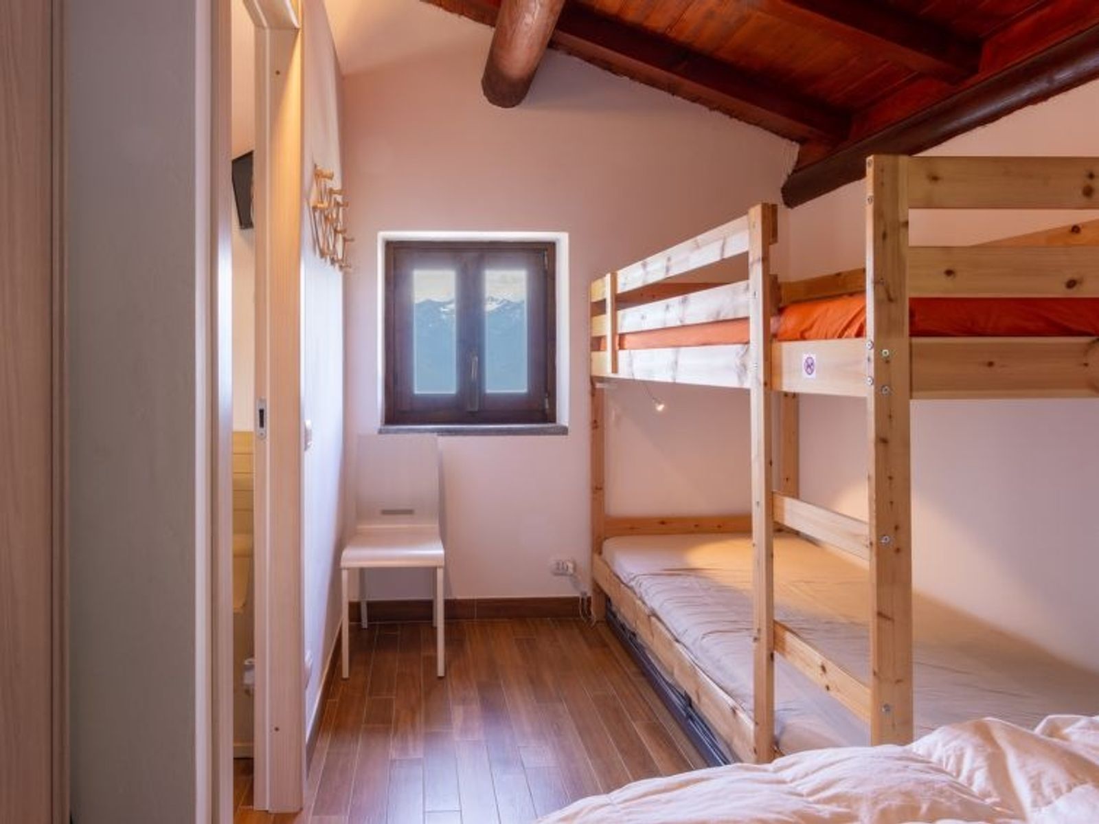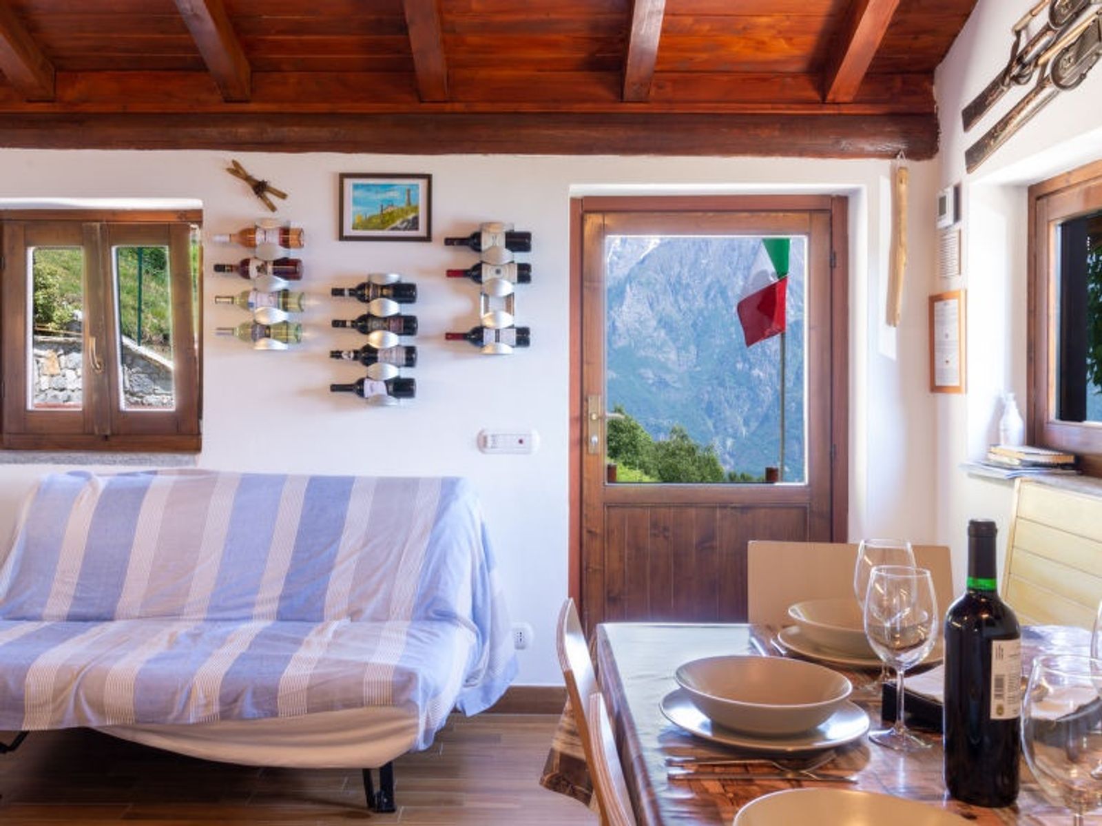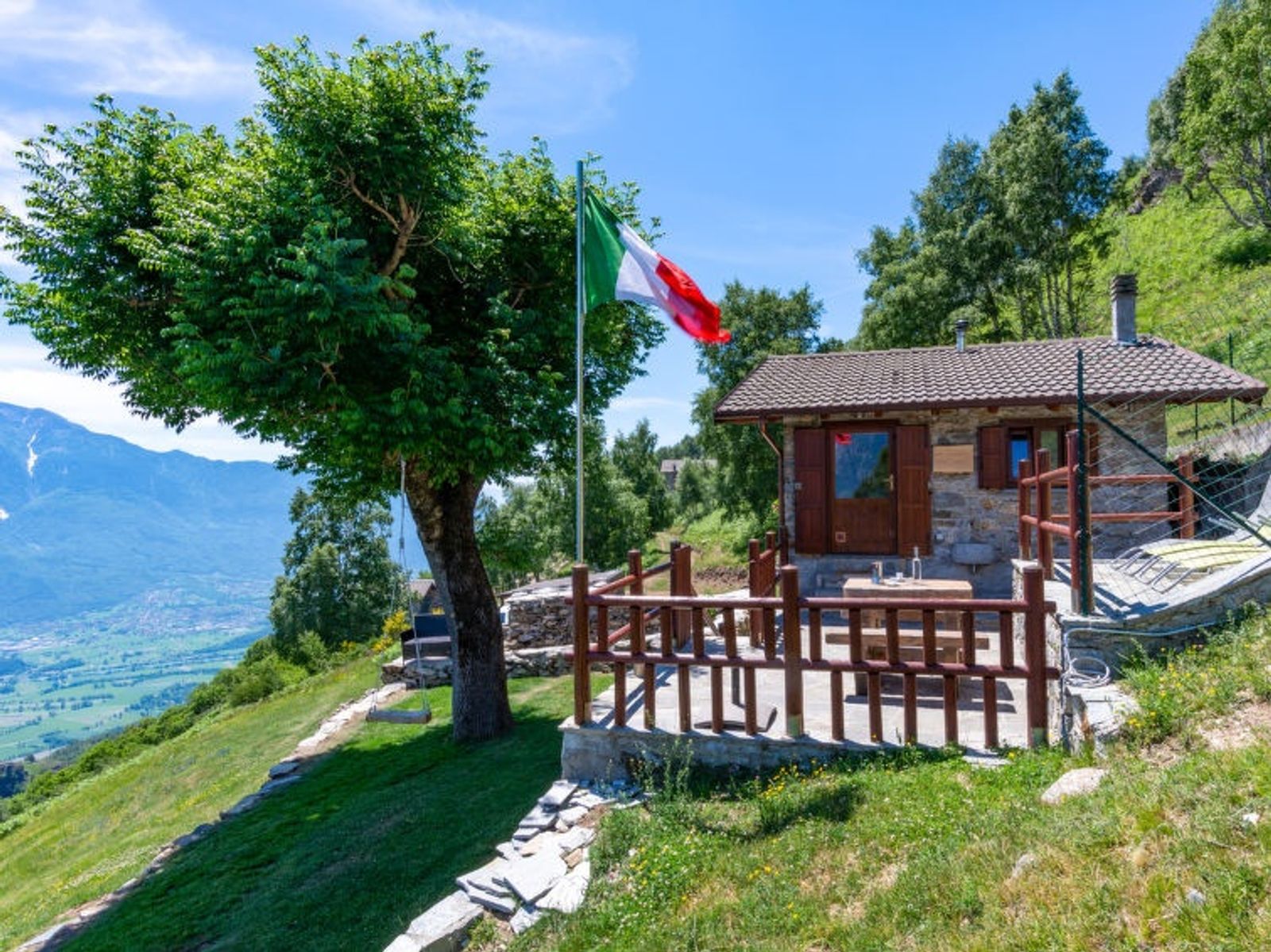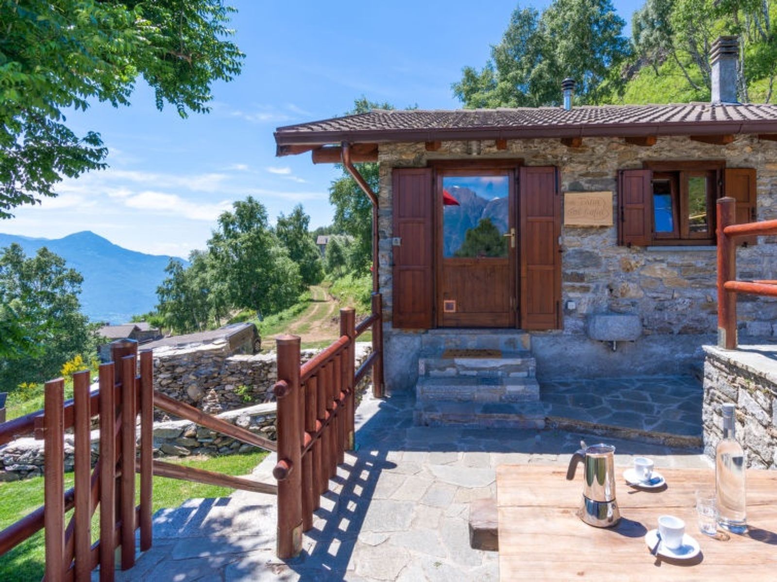 2-Zimmer-Haus 35 m2 auf 2 Stockwerken. Rustikal eingerichtet: abgeschrägtes Wohn-/Esszimmer mit Esstisch, Sat-TV und Heizofen. Ausgang zur Terrasse. Abgeschrägt, offen 1 Zimmer mit 1 x 2 Etagenbetten, 1 franz. Bett (140 cm). Offene Küche (Geschirrspüler, 4 Induktionskochplatten, Toaster, Wasserkocher, Mikrowelle, elektrische Kaffeemaschine). Unteres Geschoss: Dusche/WC. Grosse Terrasse, Gartensitzplatz. Gartengrill, Liegestühle (4). Herrliche Panoramasicht auf die Berge und Lago di Mezzola. Zur Verfügung: Haartrockner. Parkplatz (2 Autos). Bitte beachten: Nichtraucher-Unterkunft. Maximal 1 kleines Haustier/Hund erlaubt. Keine interne Verbindung zwischen den Etagen. Hinweis: Die Wand zwischen Schlafzimmer und Wohnraum ist zur Decke hin einen Spalt offen. IT013216C2IQKC6J38
